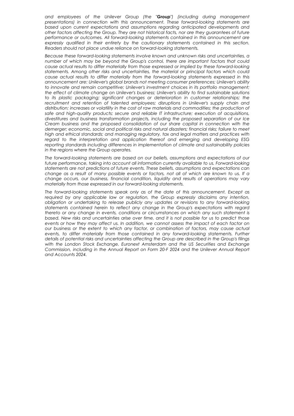 and employees of the Unilever Group (the "Group") (including during management presentations) in connection with this announcement. These forward-looking statements are based upon current expectations and assumptions regarding anticipated developments and other factors affecting the Group. They are not historical facts, nor are they guarantees of future performance or outcomes. All forward-looking statements contained in this announcement are expressly qualified in their entirety by the cautionary statements contained in this section. Readers should not place undue reliance on forward-looking statements. Because these forward-looking statements involve known and unknown risks and uncertainties, a number of which may be beyond the Group's control, there are important factors that could cause actual results to differ materially from those expressed or implied by these forward-looking statements. Among other risks and uncertainties, the material or principal factors which could cause actual results to differ materially from the forward-looking statements expressed in this announcement are: Unilever's global brands not meeting consumer preferences; Unilever's ability to innovate and remain competitive; Unilever's investment choices in its portfolio management; the effect of climate change on Unilever's business; Unilever's ability to find sustainable solutions to its plastic packaging; significant changes or deterioration in customer relationships; the recruitment and retention of talented employees; disruptions in Unilever's supply chain and distribution; increases or volatility in the cost of raw materials and commodities; the production of safe and high-quality products; secure and reliable IT infrastructure; execution of acquisitions, divestitures and business transformation projects, including the proposed separation of our Ice Cream business and the proposed consolidation of our share capital in connection with the demerger; economic, social and political risks and natural disasters; financial risks; failure to meet high and ethical standards; and managing regulatory, tax and legal matters and practices with regard to the interpretation and application thereof and emerging and developing ESG reporting standards including differences in implementation of climate and sustainability policies in the regions where the Group operates. The forward-looking statements are based on our beliefs, assumptions and expectations of our future performance, taking into account all information currently available to us. Forward-looking statements are not predictions of future events. These beliefs, assumptions and expectations can change as a result of many possible events or factors, not all of which are known to us. If a change occurs, our business, financial condition, liquidity and results of operations may vary materially from those expressed in our forward-looking statements. The forward-looking statements speak only as of the date of this announcement. Except as required by any applicable law or regulation, the Group expressly disclaims any intention, obligation or undertaking to release publicly any updates or revisions to any forward-looking statements contained herein to reflect any change in the Group's expectations with regard thereto or any change in events, conditions or circumstances on which any such statement is based. New risks and uncertainties arise over time, and it is not possible for us to predict those events or how they may affect us. In addition, we cannot assess the impact of each factor on our business or the extent to which any factor, or combination of factors, may cause actual events, to differ materially from those contained in any forward-looking statements. Further details of potential risks and uncertainties affecting the Group are described in the Group's filings with the London Stock Exchange, Euronext Amsterdam and the US Securities and Exchange Commission, including in the Annual Report on Form 20-F 2024 and the Unilever Annual Report and Accounts 2024.