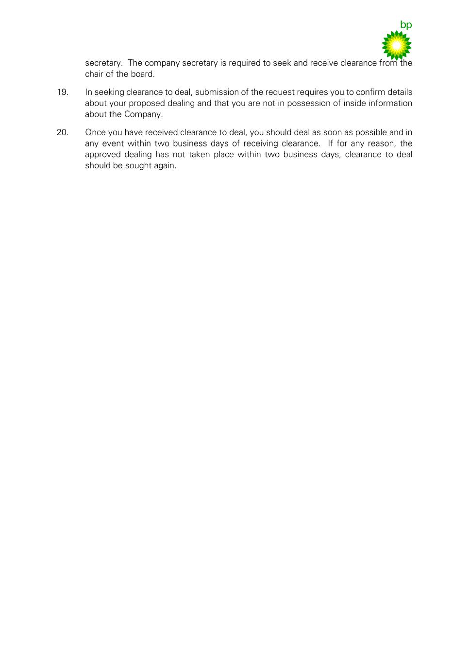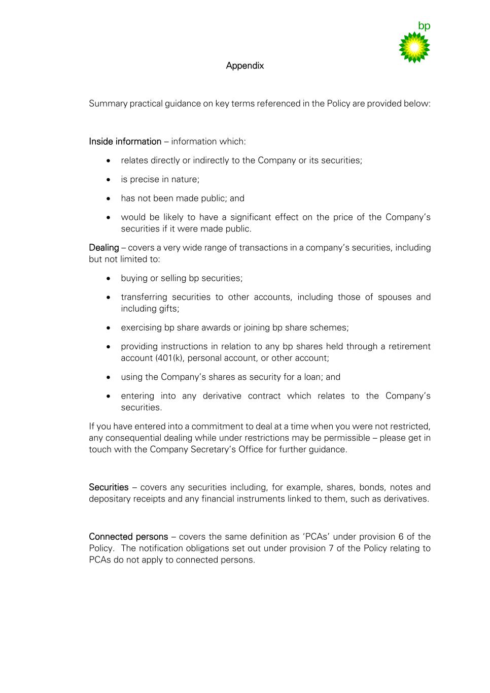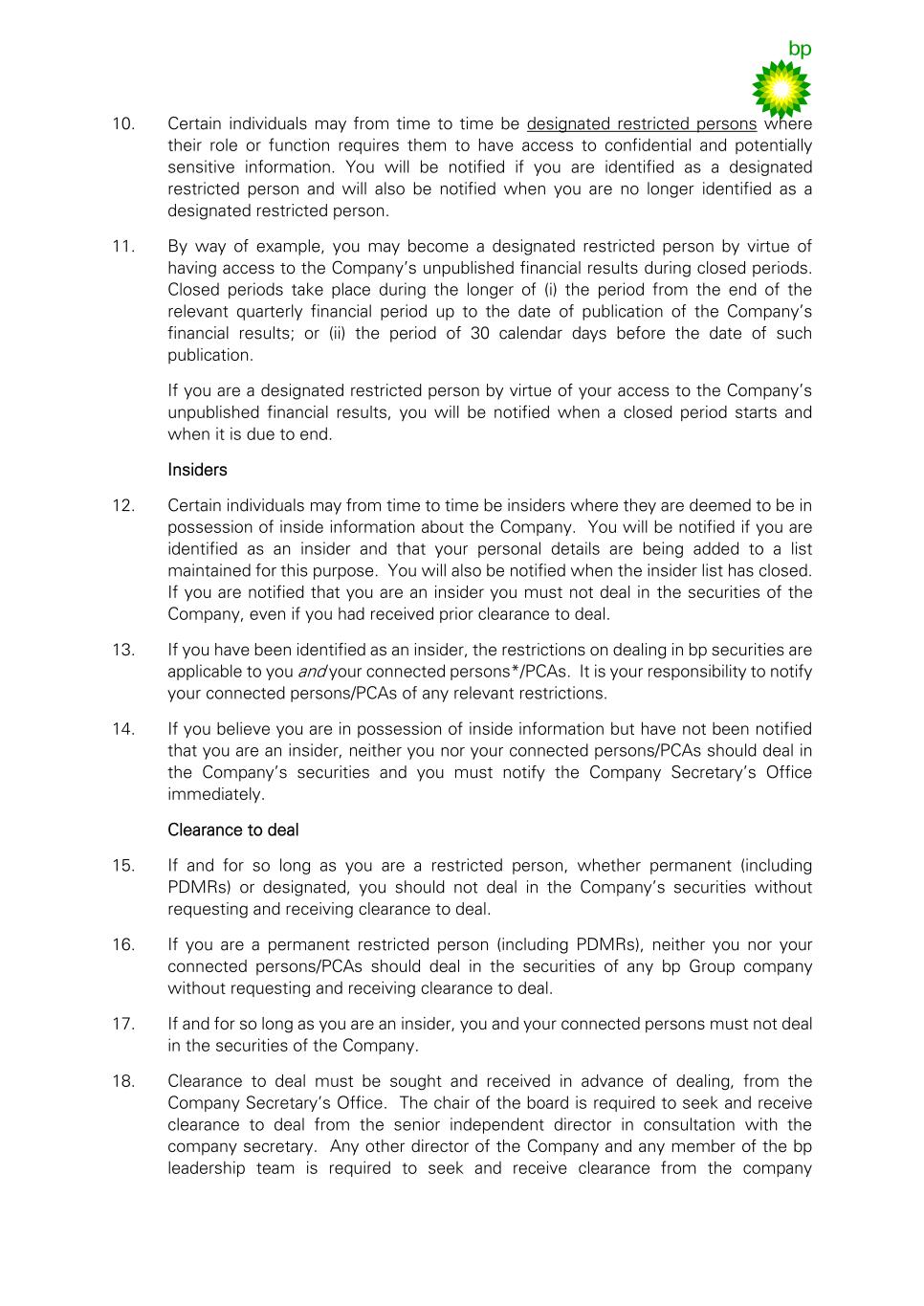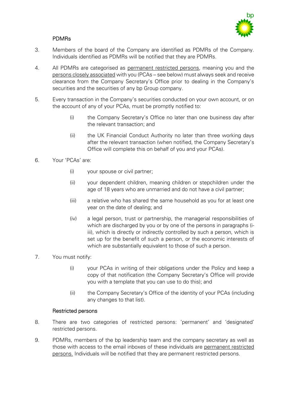 Article 19 of the EU Market Abuse Regulation (2014/596) as it forms part of domestic UK law by virtue of the European Union (Withdrawal) Act 2018 further requires persons discharging managerial responsibilities within BP (and their persons closely associated) to notify BP of transactions conducted on their own account in BP shares or derivatives or certain financial instruments relating to BP shares.