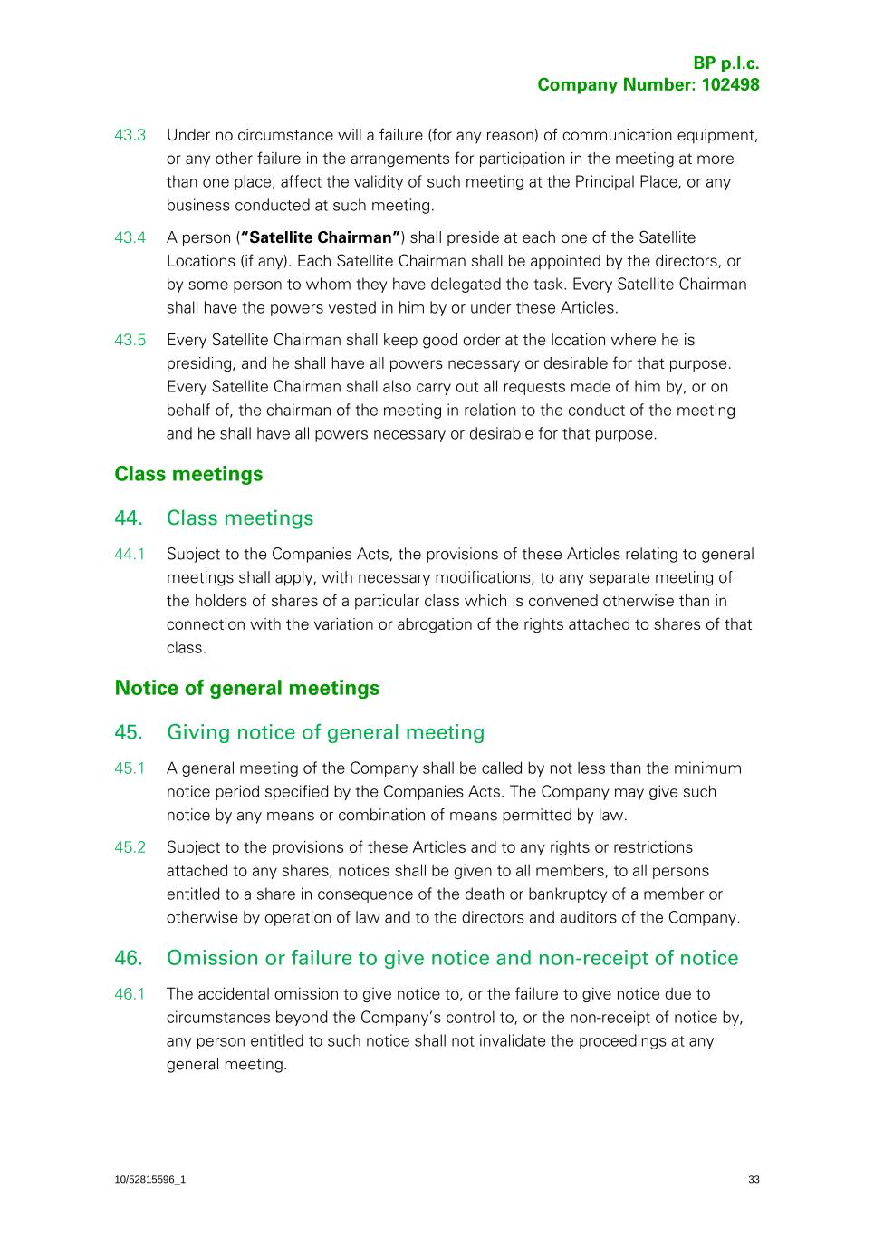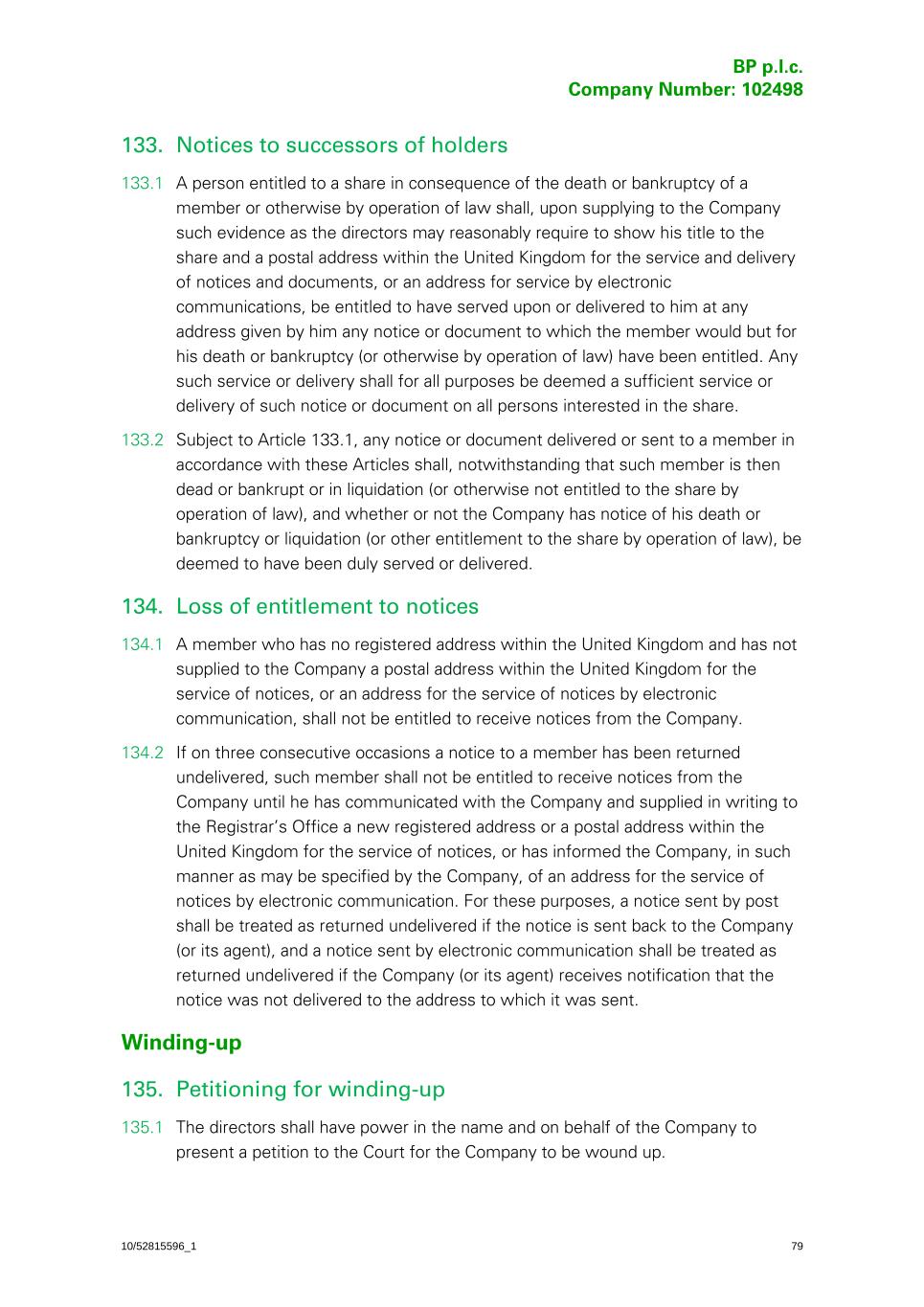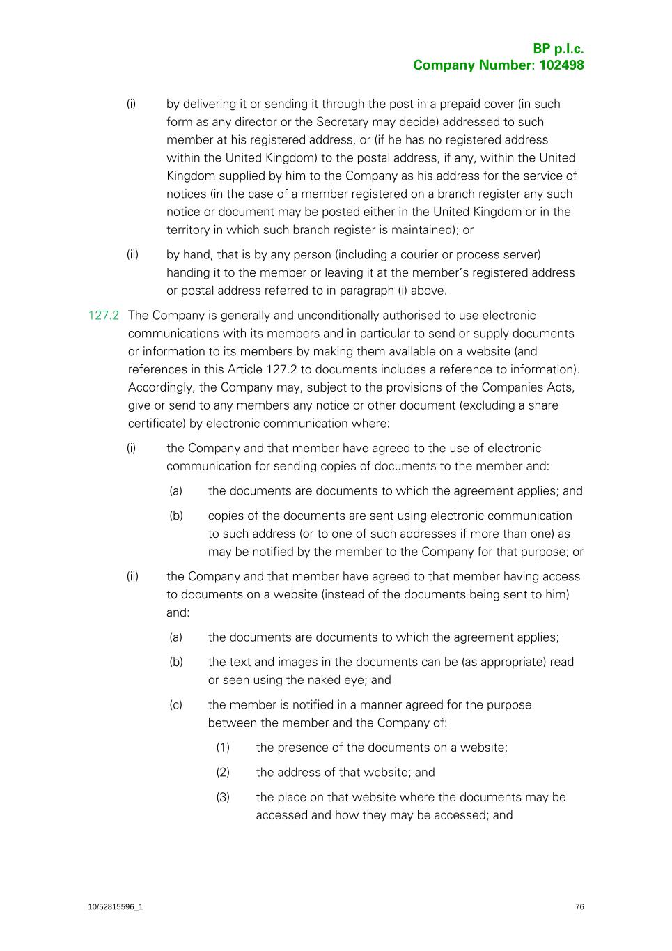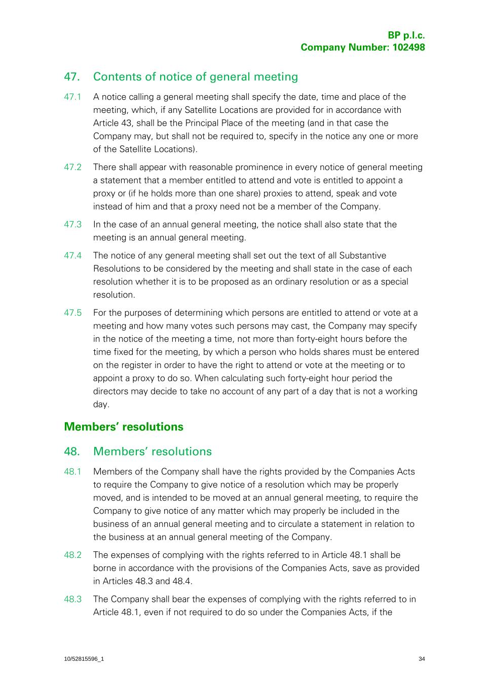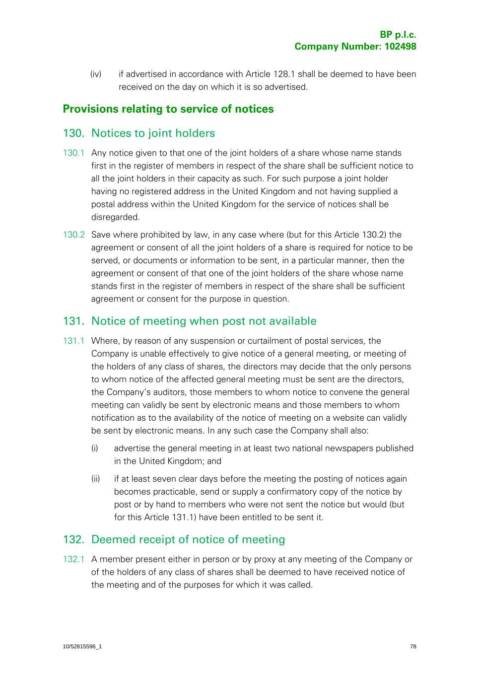 Shareholders must provide BP with a postal or electronic address in the UK to be entitled to receive notice of shareholders’ meetings. Holders of BP ADSs are entitled to receive notices under the terms of the deposit agreement relating to BP ADSs. The substance and timing of notices are described above under the heading Voting rights.