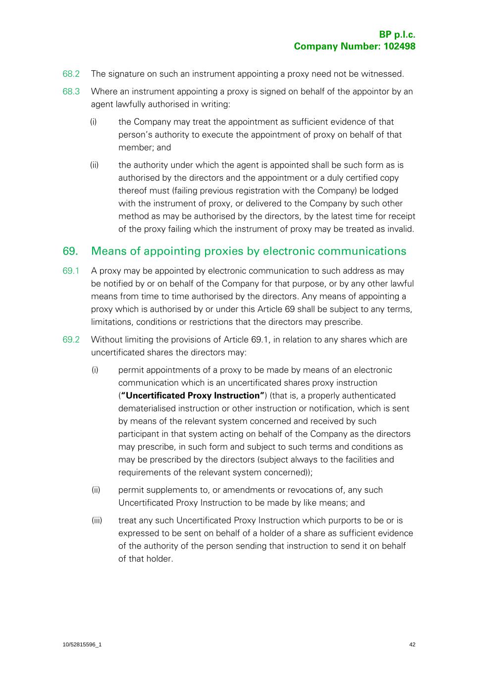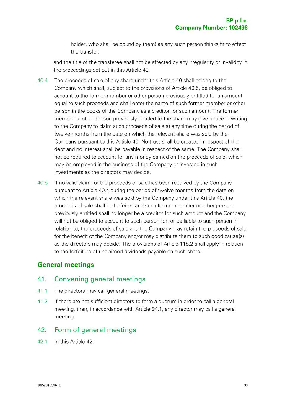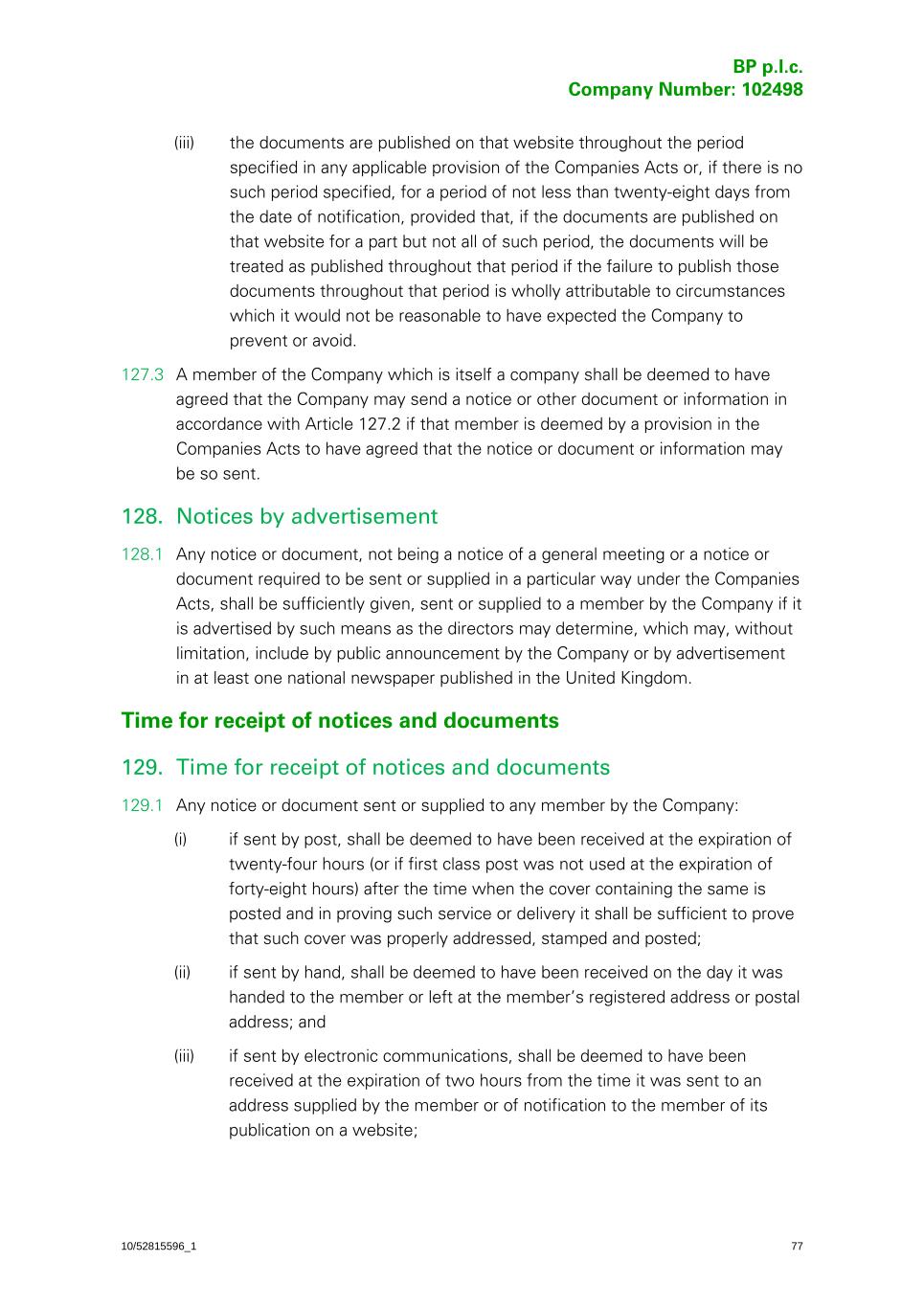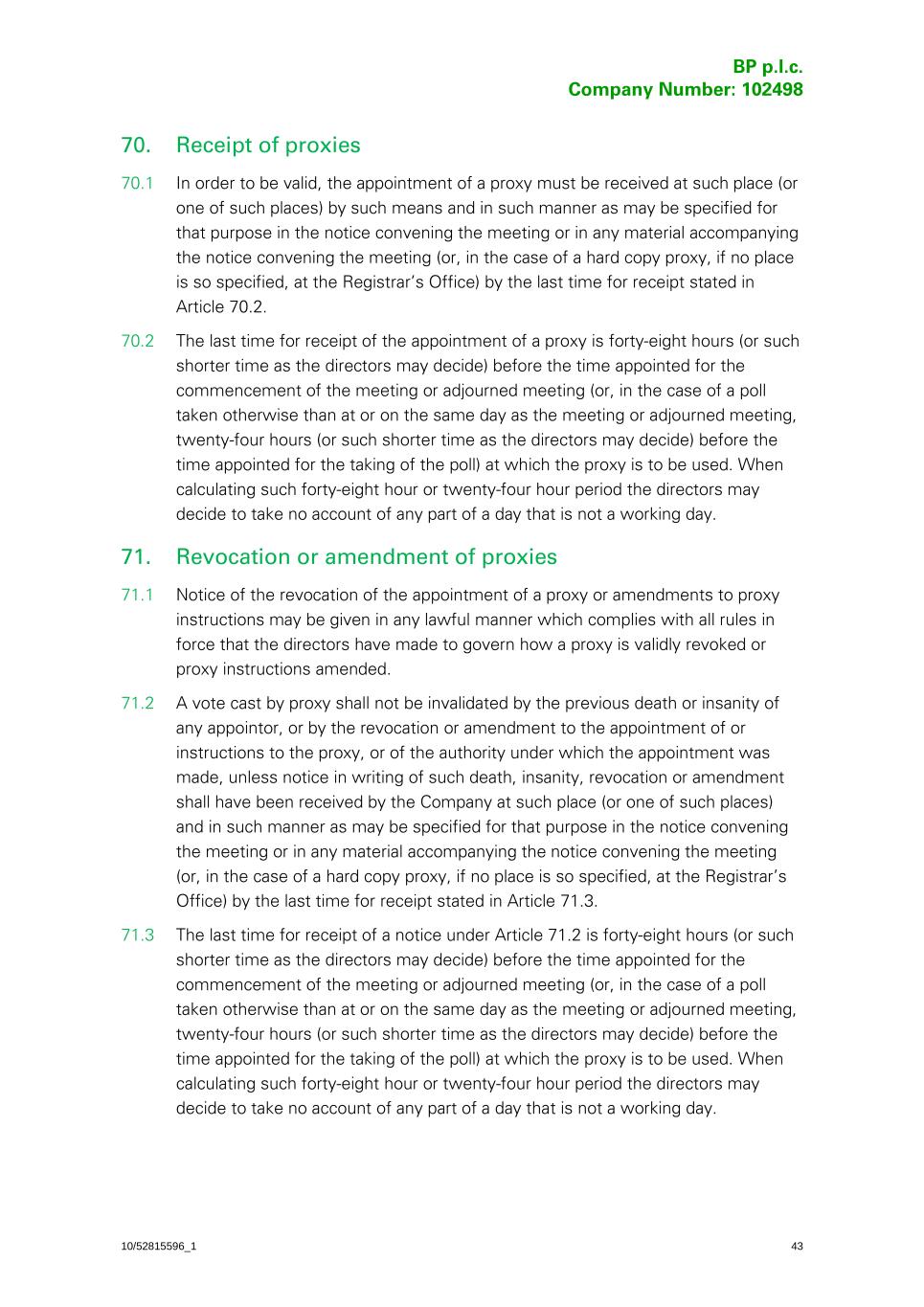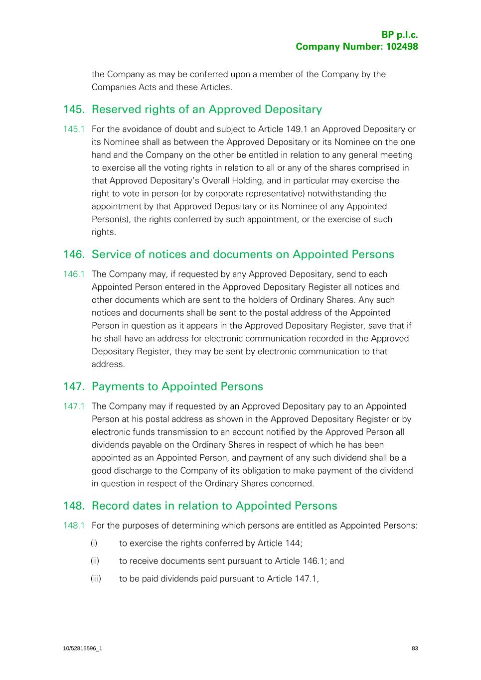 Shareholders must provide BP with a postal or electronic address in the UK to be entitled to receive notice of shareholders’ meetings. Holders of BP ADSs are entitled to receive notices under the terms of the deposit agreement relating to BP ADSs. The substance and timing of notices are described above under the heading Voting rights.