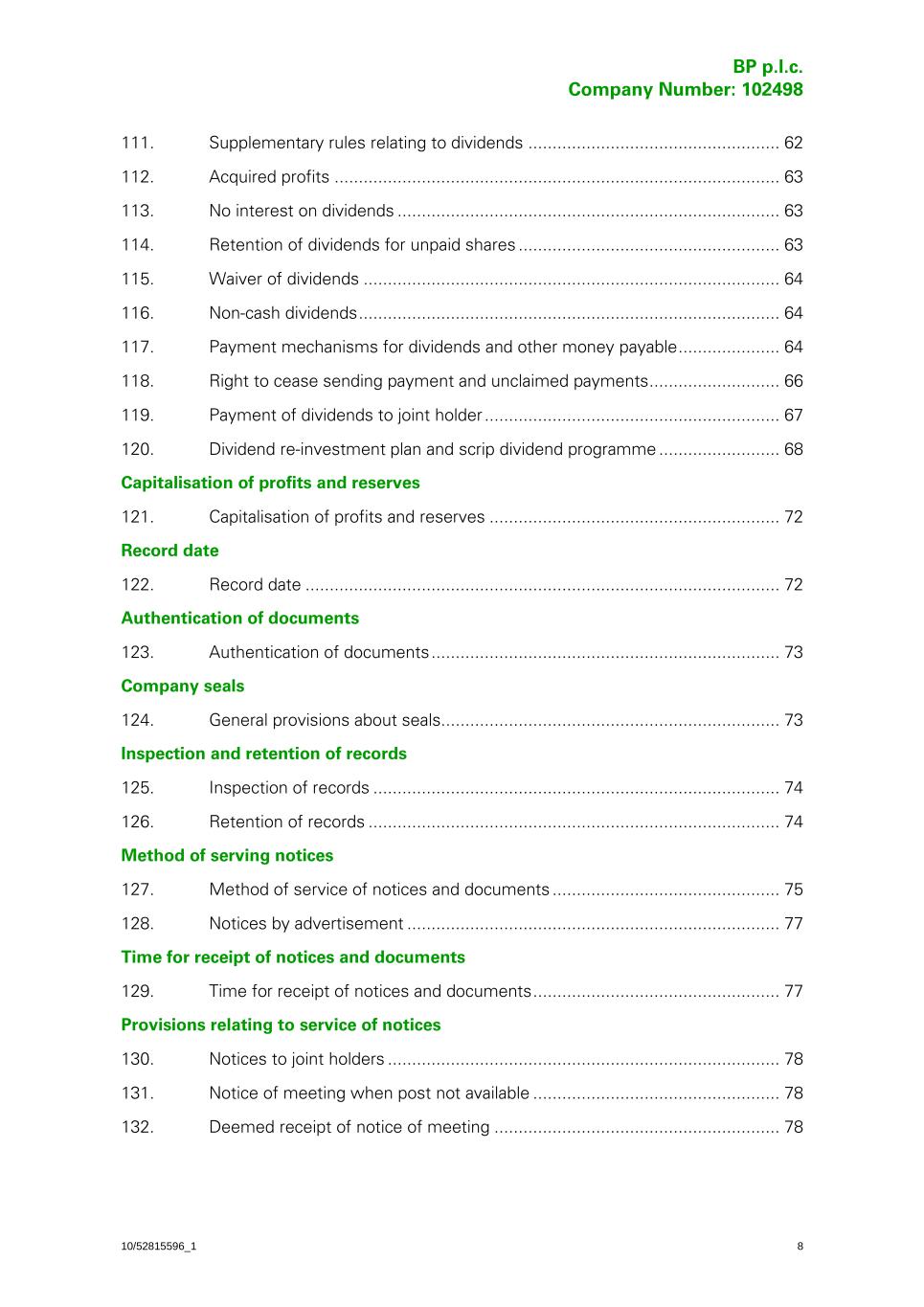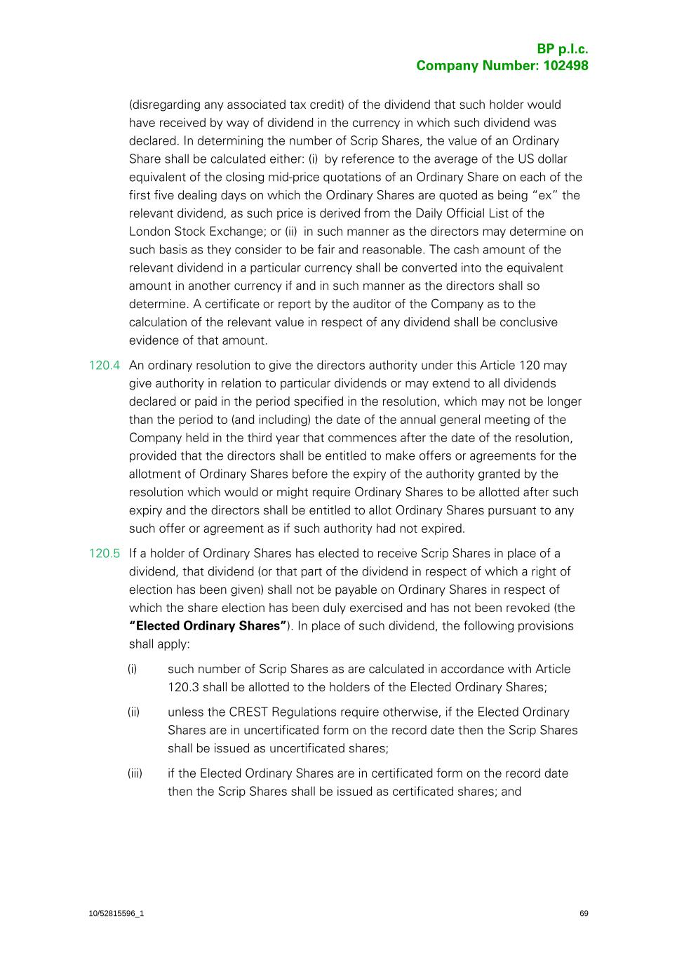 The directors have the power to declare and pay dividends in any currency provided that a sterling equivalent is announced. It is not the company’s intention to change its current policy of paying dividends in US dollars. At the company’s AGM held on 15 April 2010, shareholders approved the introduction of a Scrip Dividend Programme (the “Scrip Programme”) and to include provisions in the Articles of Association to enable the company to operate the Scrip Programme. The Scrip Programme was renewed at the company’s AGM held on 25 April 2024 for a further three years. The Scrip Programme enables ordinary shareholders and BP ADS holders to elect to receive new fully paid ordinary shares (or BP ADSs in the case of BP ADS holders) instead of cash. The operation of the Scrip Programme is always