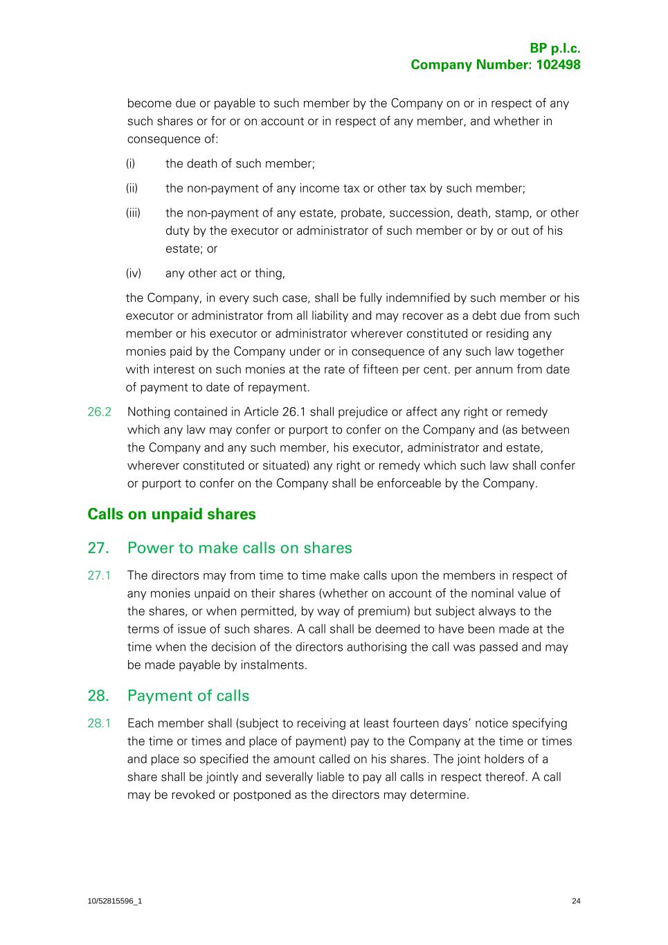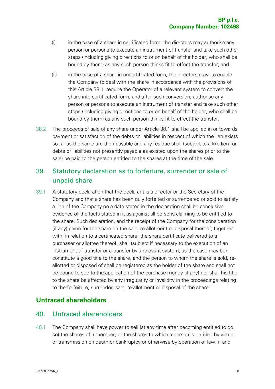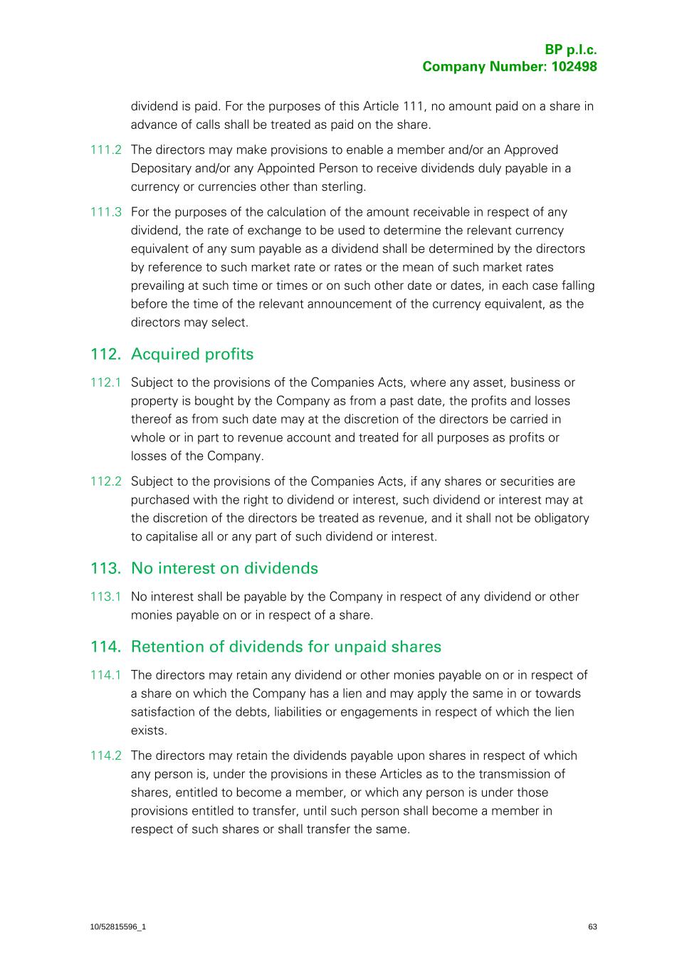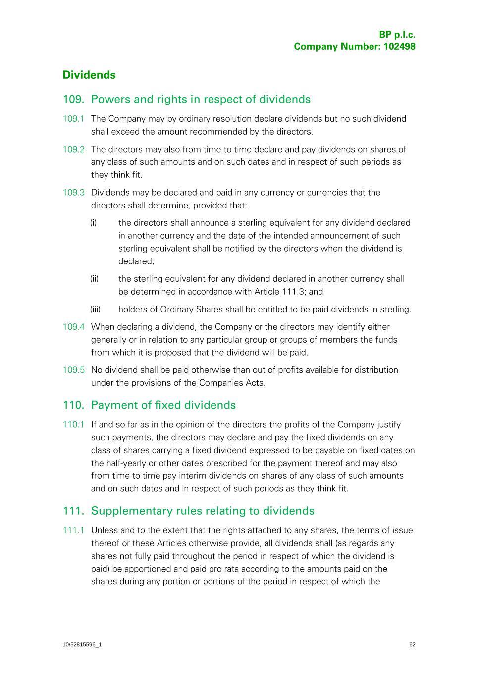 If recommended by the directors of BP, shareholders of BP may, by resolution, declare dividends but no such dividend may be declared in excess of the amount recommended by the directors. The directors may also pay interim dividends without obtaining shareholder approval. No dividend may be paid other than out of profits available for distribution, as determined under IFRS and the Act. Dividends on ordinary shares are payable only after payment of dividends on BP preference shares. Any dividend unclaimed after a period of 10 years from the date of declaration of such dividend shall be forfeited and reverts to BP. If the company exercises its right to forfeit shares and sells shares belonging to an untraced shareholder then any entitlement to claim dividends or other monies unclaimed in respect of those shares will be for a period of twelve months after the sale. The company may take such steps as the directors decide are appropriate in the circumstances to trace the member entitled and the sale may be made at such time and on such terms as the directors may decide.