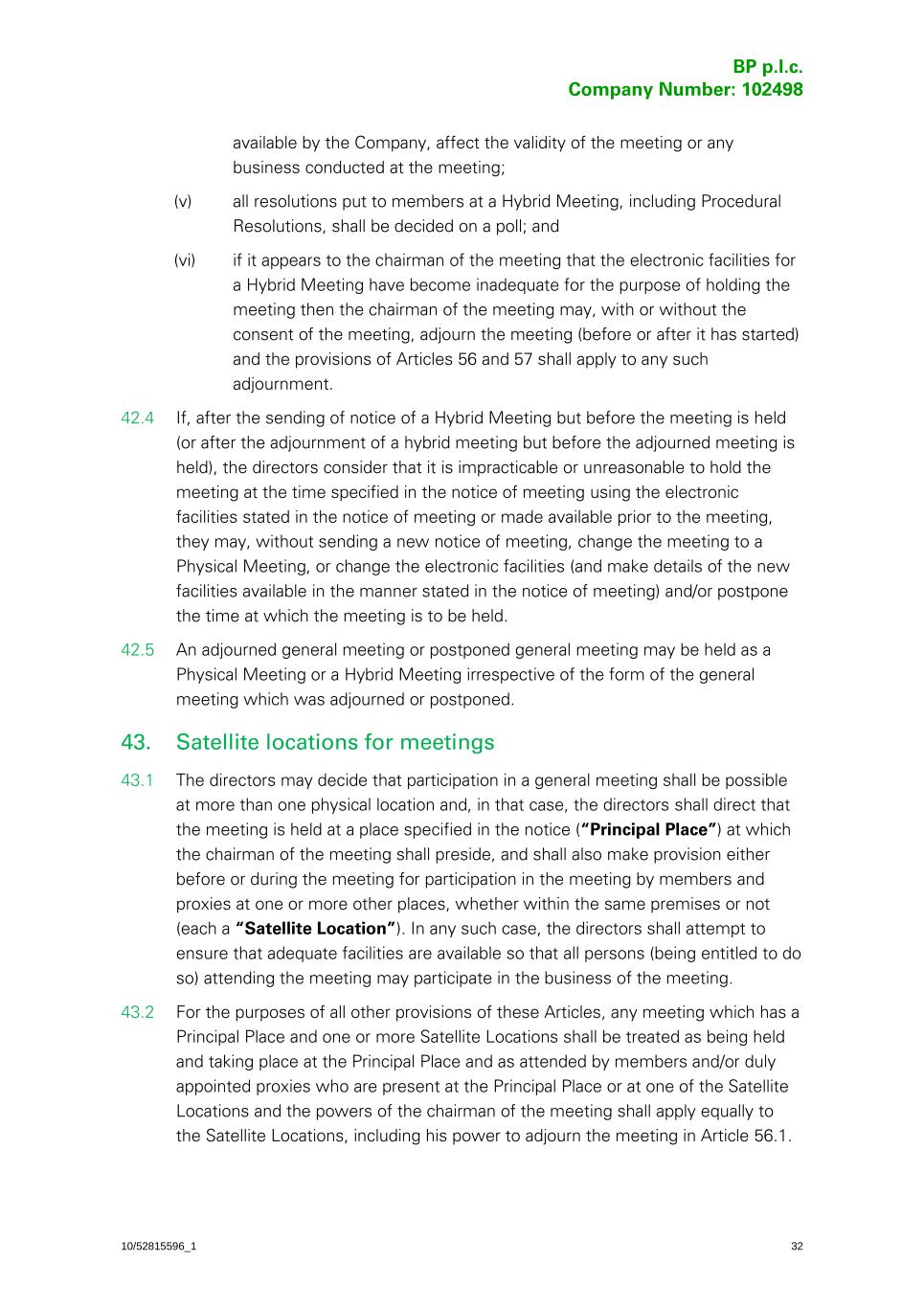 The provisions of the Articles of Association in relation to satellite meetings permit facilities being provided by electronic means to allow those persons at each place to participate in the meeting.