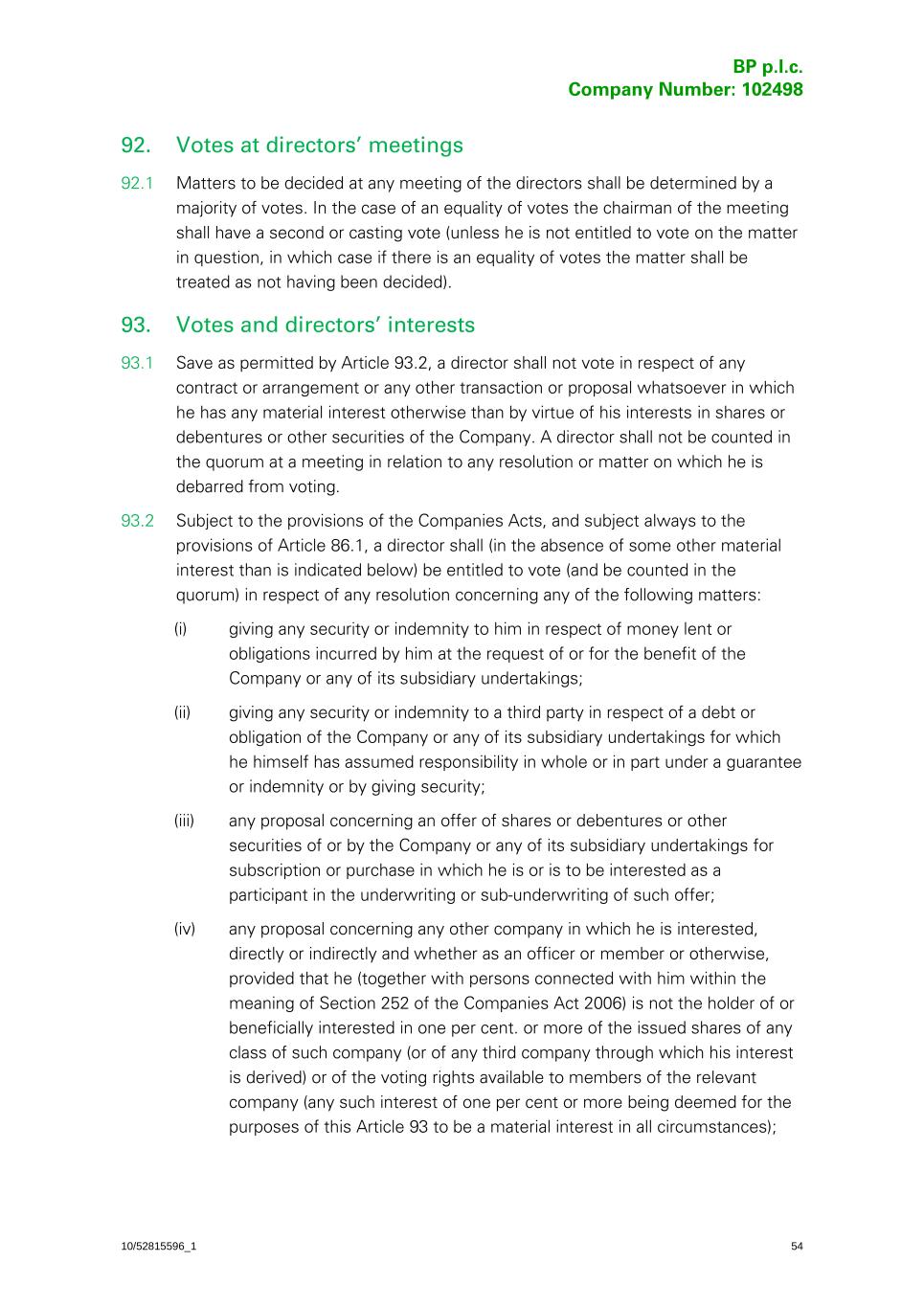 BP’s Articles of Association provide that voting on resolutions at a shareholders’ meeting will be decided on a poll other than resolutions of a procedural nature, which may be decided on a show of hands. If voting is on a poll, every shareholder who is present in person or by proxy has one vote for every ordinary share held and two votes for every £5 in nominal amount of BP preference shares held. If voting is on a show of hands, each shareholder who is present at the meeting in person or whose duly appointed proxy is present in person will have one vote, regardless of the number of shares held, unless a poll is requested.