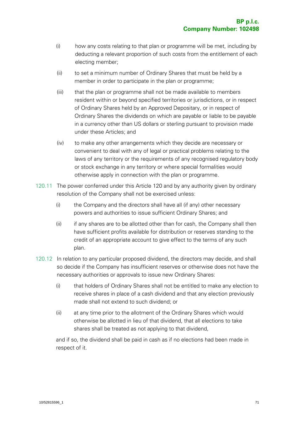 subject to the directors’ decision to make the scrip offer available in respect of any particular dividend. Should the directors decide not to offer the scrip in respect of any particular dividend, cash will automatically be paid instead. BP announced on 29 October 2019 and as part of all subsequent quarterly results announcements made since, that the board of directors had suspended the Scrip Programme in respect of those quarterly dividends. The company does not anticipate offering a scrip election for the foreseeable future. The directors may determine in relation to any scrip dividend plan or programme how the costs of the programme will be met, the minimum number of ordinary shares required in order to be able to participate in the programme and any arrangements to deal with legal and practical difficulties in any particular territory.