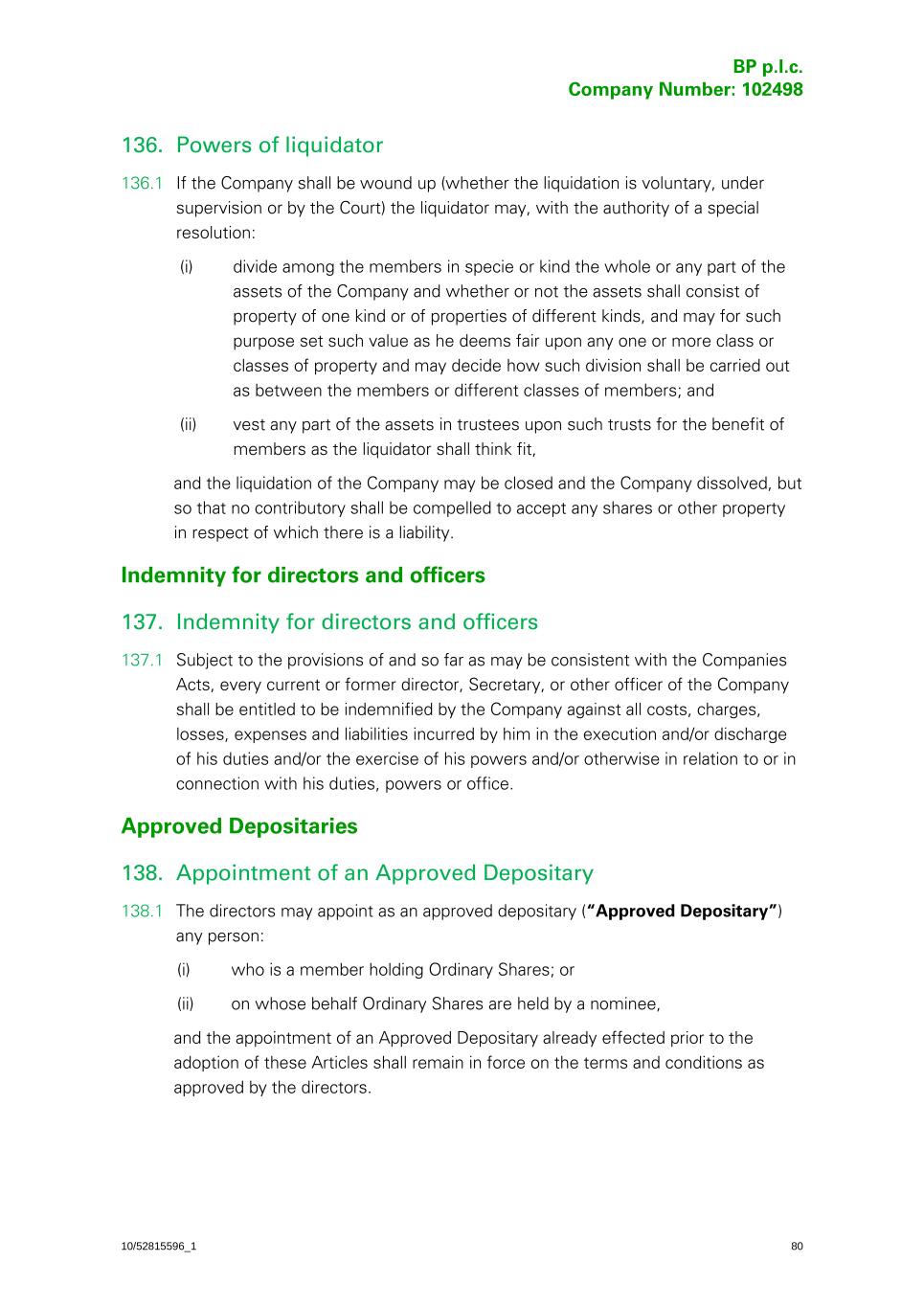 In the event of a liquidation of BP, after payment of all liabilities and applicable deductions under UK laws and subject to the payment of secured creditors, the holders of BP preference shares and BP perpetual subordinated notes would be entitled to payment on a pari passu basis. The holders of BP preference shares would be entitled to the sum of (1) the capital paid up on such shares plus, (2) accrued and unpaid dividends and (3) a premium equal to the higher of (a) 10% of the capital paid up on the BP preference shares and (b) the excess of the average market price over par value of such shares on the London Stock Exchange during the previous six months. The holders of BP perpetual subordinated notes would be entitled to payment of the principal amount of the notes and any accrued but unpaid interest, including any arrears of interest pursuant to the terms of the notes. The remaining assets (if any) would be divided pro rata among the holders of ordinary shares.