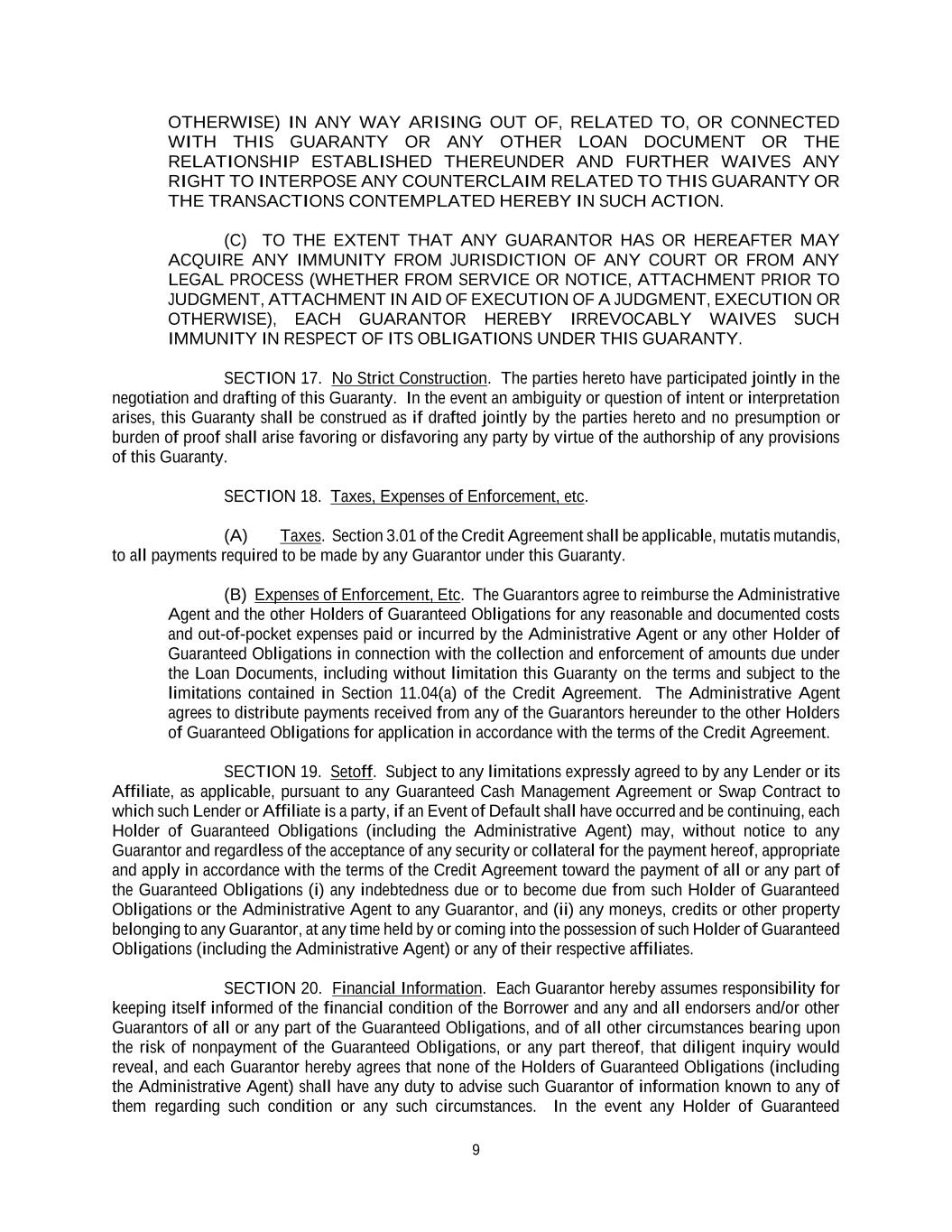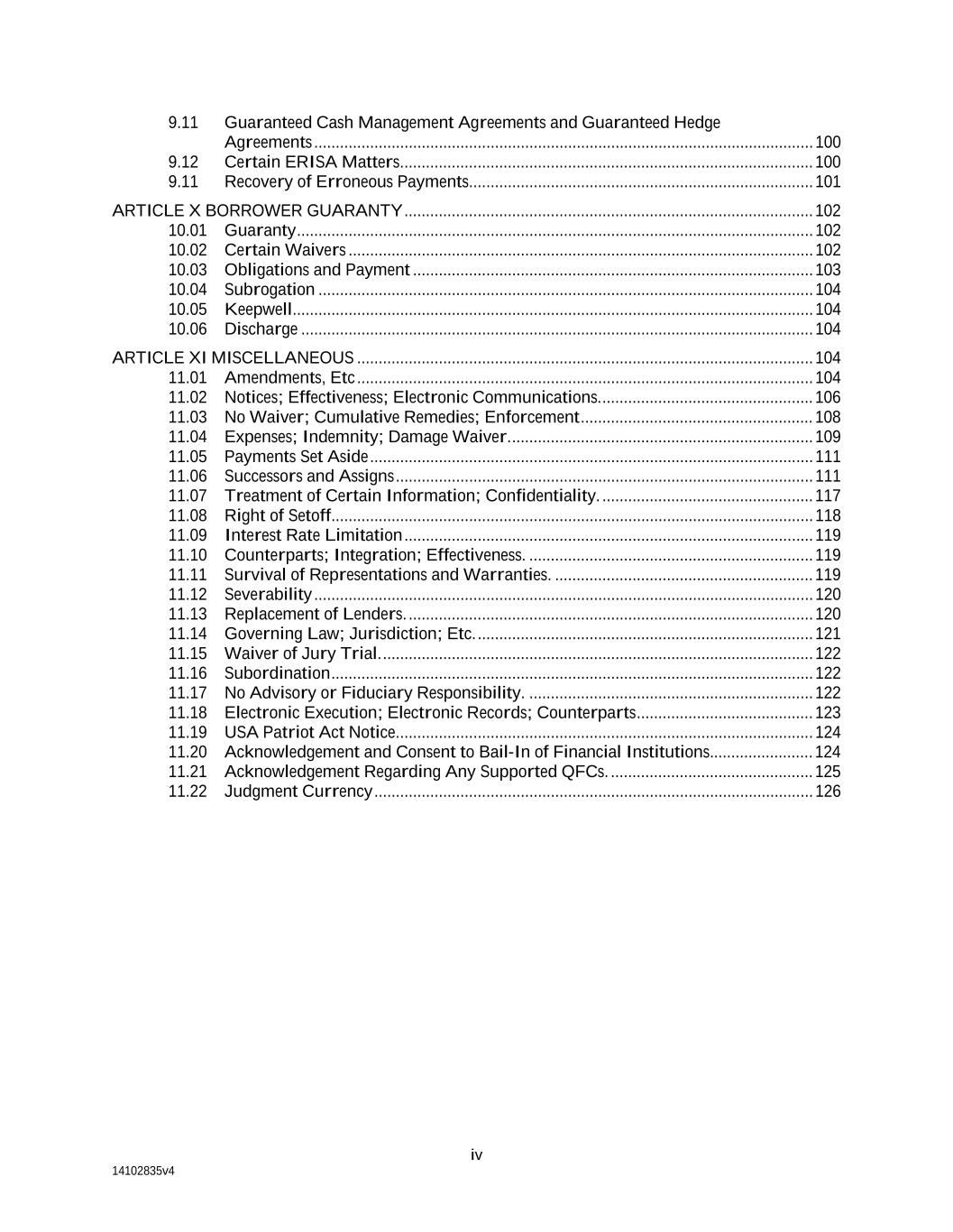 iv 14102835v4 9.11 Guaranteed Cash Management Agreements and Guaranteed Hedge Agreements .................................................................................................................... 100 9.12 Certain ERISA Matters. ............................................................................................... 100 9.11 Recovery of Erroneous Payments. ............................................................................... 101 ARTICLE X BORROWER GUARANTY ............................................................................................... 102 10.01 Guaranty ........................................................................................................................ 102 10.02 Certain Waivers ............................................................................................................ 102 10.03 Obligations and Payment ............................................................................................. 103 10.04 Subrogation ................................................................................................................... 104 10.05 Keepwell ......................................................................................................................... 104 10.06 Discharge ....................................................................................................................... 104 ARTICLE XI MISCELLANEOUS .......................................................................................................... 104 11.01 Amendments, Etc .......................................................................................................... 104 11.02 Notices; Effectiveness; Electronic Communications. ................................................. 106 11.03 No Waiver; Cumulative Remedies; Enforcement ...................................................... 108 11.04 Expenses; Indemnity; Damage Waiver. ...................................................................... 109 11.05 Payments Set Aside ....................................................................................................... 111 11.06 Successors and Assigns ................................................................................................. 111 11.07 Treatment of Certain Information; Confidentiality. ................................................. 117 11.08 Right of Setoff. ............................................................................................................... 118 11.09 Interest Rate Limitation ............................................................................................... 119 11.10 Counterparts; Integration; Effectiveness. .................................................................. 119 11.11 Survival of Representations and Warranties. ............................................................ 119 11.12 Severability .................................................................................................................... 120 11.13 Replacement of Lenders. .............................................................................................. 120 11.14 Governing Law; Jurisdiction; Etc. .............................................................................. 121 11.15 Waiver of Jury Trial. .................................................................................................... 122 11.16 Subordination ................................................................................................................ 122 11.17 No Advisory or Fiduciary Responsibility. .................................................................. 122 11.18 Electronic Execution; Electronic Records; Counterparts ......................................... 123 11.19 USA Patriot Act Notice. ................................................................................................ 124 11.20 Acknowledgement and Consent to Bail-In of Financial Institutions........................ 124 11.21 Acknowledgement Regarding Any Supported QFCs. ............................................... 125 11.22 Judgment Currency ...................................................................................................... 126
