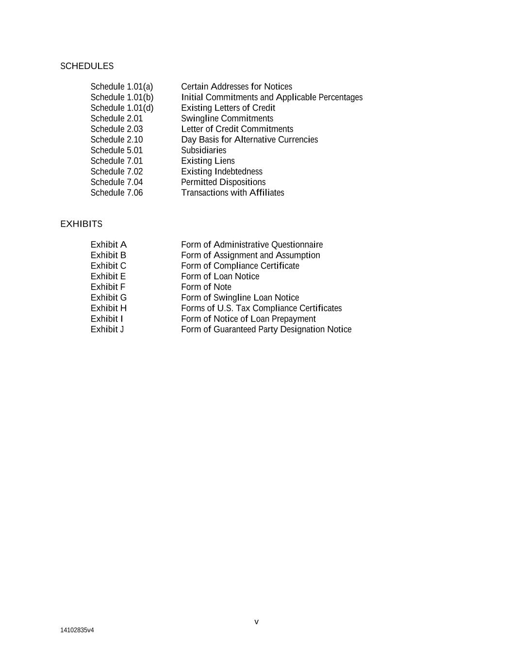 v 14102835v4 SCHEDULES Schedule 1.01(a) Certain Addresses for Notices Schedule 1.01(b) Initial Commitments and Applicable Percentages Schedule 1.01(d) Existing Letters of Credit Schedule 2.01 Swingline Commitments Schedule 2.03 Letter of Credit Commitments Schedule 2.10 Day Basis for Alternative Currencies Schedule 5.01 Subsidiaries Schedule 7.01 Existing Liens Schedule 7.02 Existing Indebtedness Schedule 7.04 Permitted Dispositions Schedule 7.06 Transactions with Affiliates EXHIBITS Exhibit A Form of Administrative Questionnaire Exhibit B Form of Assignment and Assumption Exhibit C Form of Compliance Certificate Exhibit E Form of Loan Notice Exhibit F Form of Note Exhibit G Form of Swingline Loan Notice Exhibit H Forms of U.S. Tax Compliance Certificates Exhibit I Form of Notice of Loan Prepayment Exhibit J Form of Guaranteed Party Designation Notice