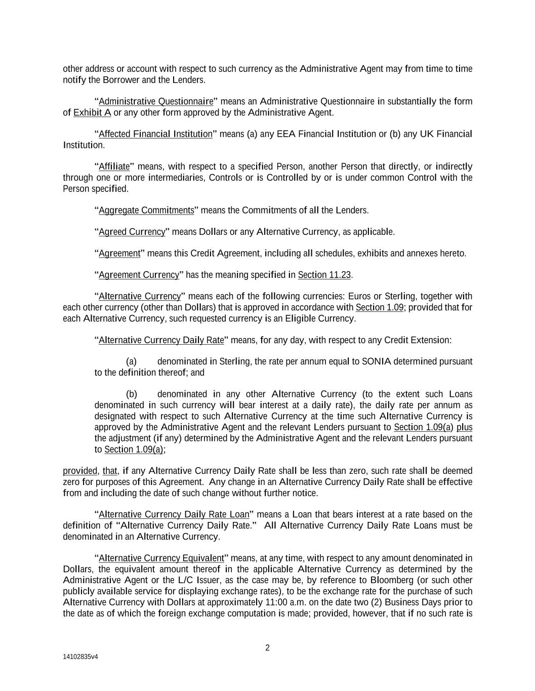 2 14102835v4 other address or account with respect to such currency as the Administrative Agent may from time to time notify the Borrower and the Lenders. “Administrative Questionnaire” means an Administrative Questionnaire in substantially the form of Exhibit A or any other form approved by the Administrative Agent. “Affected Financial Institution” means (a) any EEA Financial Institution or (b) any UK Financial Institution. “Affiliate” means, with respect to a specified Person, another Person that directly, or indirectly through one or more intermediaries, Controls or is Controlled by or is under common Control with the Person specified. “Aggregate Commitments” means the Commitments of all the Lenders. “Agreed Currency” means Dollars or any Alternative Currency, as applicable. “Agreement” means this Credit Agreement, including all schedules, exhibits and annexes hereto. “Agreement Currency” has the meaning specified in Section 11.23. “Alternative Currency” means each of the following currencies: Euros or Sterling, together with each other currency (other than Dollars) that is approved in accordance with Section 1.09; provided that for each Alternative Currency, such requested currency is an Eligible Currency. “Alternative Currency Daily Rate” means, for any day, with respect to any Credit Extension: (a) denominated in Sterling, the rate per annum equal to SONIA determined pursuant to the definition thereof; and (b) denominated in any other Alternative Currency (to the extent such Loans denominated in such currency will bear interest at a daily rate), the daily rate per annum as designated with respect to such Alternative Currency at the time such Alternative Currency is approved by the Administrative Agent and the relevant Lenders pursuant to Section 1.09(a) plus the adjustment (if any) determined by the Administrative Agent and the relevant Lenders pursuant to Section 1.09(a); provided, that, if any Alternative Currency Daily Rate shall be less than zero, such rate shall be deemed zero for purposes of this Agreement. Any change in an Alternative Currency Daily Rate shall be effective from and including the date of such change without further notice. “Alternative Currency Daily Rate Loan” means a Loan that bears interest at a rate based on the definition of “Alternative Currency Daily Rate.” All Alternative Currency Daily Rate Loans must be denominated in an Alternative Currency. “Alternative Currency Equivalent” means, at any time, with respect to any amount denominated in Dollars, the equivalent amount thereof in the applicable Alternative Currency as determined by the Administrative Agent or the L/C Issuer, as the case may be, by reference to Bloomberg (or such other publicly available service for displaying exchange rates), to be the exchange rate for the purchase of such Alternative Currency with Dollars at approximately 11:00 a.m. on the date two (2) Business Days prior to the date as of which the foreign exchange computation is made; provided, however, that if no such rate is