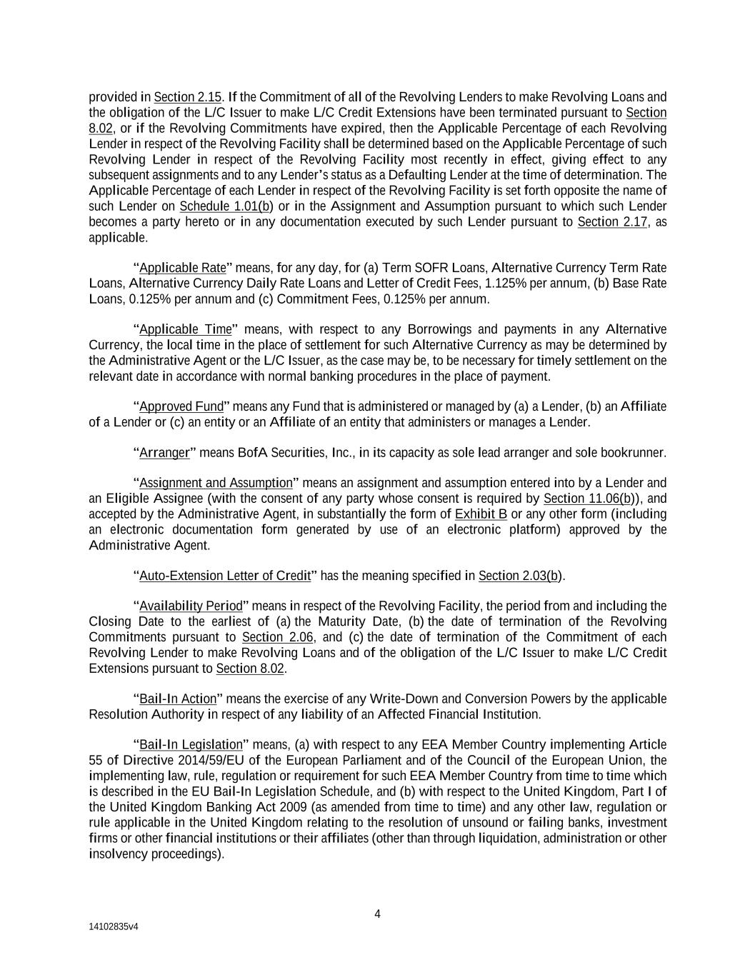 4 14102835v4 provided in Section 2.15. If the Commitment of all of the Revolving Lenders to make Revolving Loans and the obligation of the L/C Issuer to make L/C Credit Extensions have been terminated pursuant to Section 8.02, or if the Revolving Commitments have expired, then the Applicable Percentage of each Revolving Lender in respect of the Revolving Facility shall be determined based on the Applicable Percentage of such Revolving Lender in respect of the Revolving Facility most recently in effect, giving effect to any subsequent assignments and to any Lender’s status as a Defaulting Lender at the time of determination. The Applicable Percentage of each Lender in respect of the Revolving Facility is set forth opposite the name of such Lender on Schedule 1.01(b) or in the Assignment and Assumption pursuant to which such Lender becomes a party hereto or in any documentation executed by such Lender pursuant to Section 2.17, as applicable. “Applicable Rate” means, for any day, for (a) Term SOFR Loans, Alternative Currency Term Rate Loans, Alternative Currency Daily Rate Loans and Letter of Credit Fees, 1.125% per annum, (b) Base Rate Loans, 0.125% per annum and (c) Commitment Fees, 0.125% per annum. “Applicable Time” means, with respect to any Borrowings and payments in any Alternative Currency, the local time in the place of settlement for such Alternative Currency as may be determined by the Administrative Agent or the L/C Issuer, as the case may be, to be necessary for timely settlement on the relevant date in accordance with normal banking procedures in the place of payment. “Approved Fund” means any Fund that is administered or managed by (a) a Lender, (b) an Affiliate of a Lender or (c) an entity or an Affiliate of an entity that administers or manages a Lender. “Arranger” means BofA Securities, Inc., in its capacity as sole lead arranger and sole bookrunner. “Assignment and Assumption” means an assignment and assumption entered into by a Lender and an Eligible Assignee (with the consent of any party whose consent is required by Section 11.06(b)), and accepted by the Administrative Agent, in substantially the form of Exhibit B or any other form (including an electronic documentation form generated by use of an electronic platform) approved by the Administrative Agent. “Auto-Extension Letter of Credit” has the meaning specified in Section 2.03(b). “Availability Period” means in respect of the Revolving Facility, the period from and including the Closing Date to the earliest of (a) the Maturity Date, (b) the date of termination of the Revolving Commitments pursuant to Section 2.06, and (c) the date of termination of the Commitment of each Revolving Lender to make Revolving Loans and of the obligation of the L/C Issuer to make L/C Credit Extensions pursuant to Section 8.02. “Bail-In Action” means the exercise of any Write-Down and Conversion Powers by the applicable Resolution Authority in respect of any liability of an Affected Financial Institution. “Bail-In Legislation” means, (a) with respect to any EEA Member Country implementing Article 55 of Directive 2014/59/EU of the European Parliament and of the Council of the European Union, the implementing law, rule, regulation or requirement for such EEA Member Country from time to time which is described in the EU Bail-In Legislation Schedule, and (b) with respect to the United Kingdom, Part I of the United Kingdom Banking Act 2009 (as amended from time to time) and any other law, regulation or rule applicable in the United Kingdom relating to the resolution of unsound or failing banks, investment firms or other financial institutions or their affiliates (other than through liquidation, administration or other insolvency proceedings).