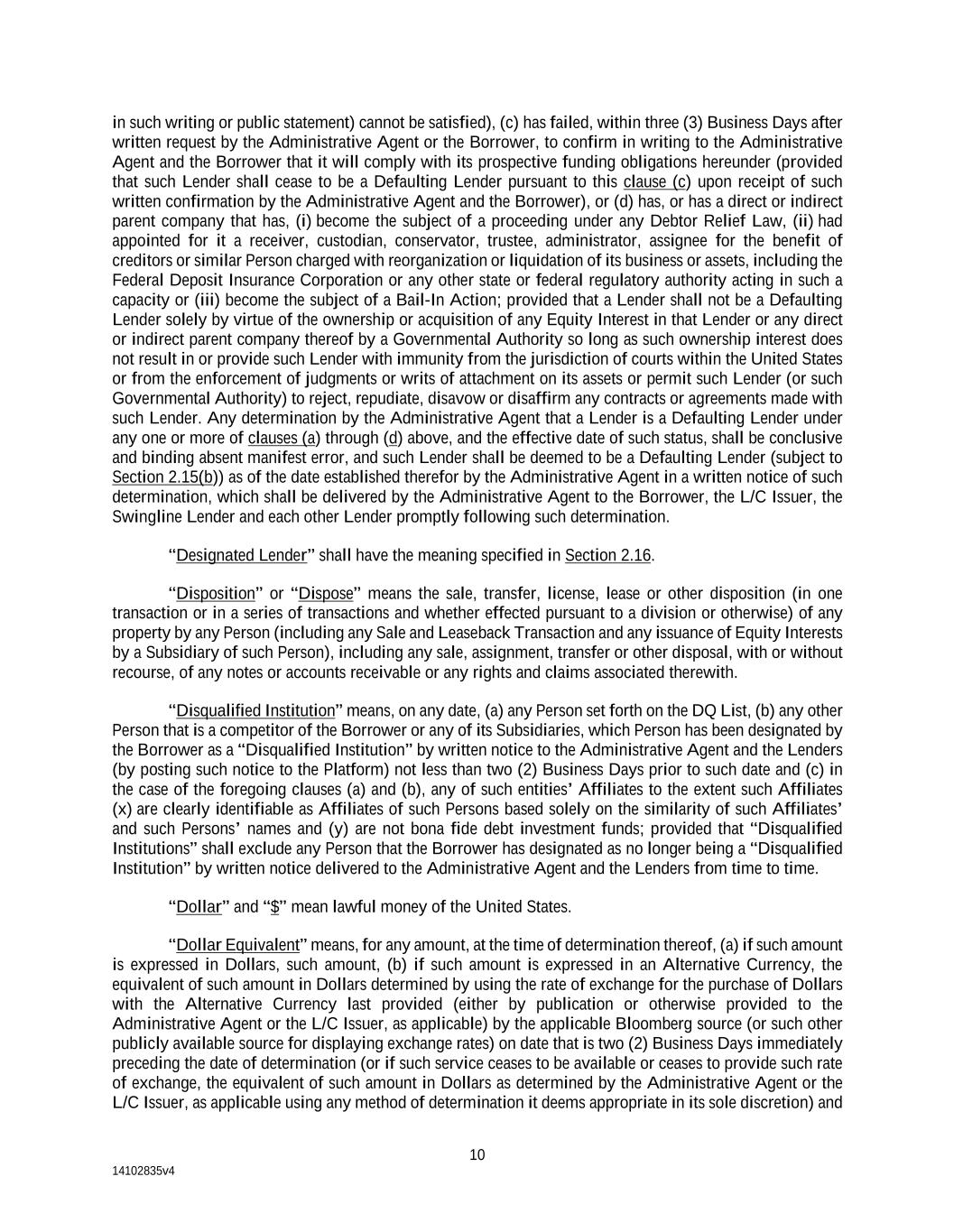 10 14102835v4 in such writing or public statement) cannot be satisfied), (c) has failed, within three (3) Business Days after written request by the Administrative Agent or the Borrower, to confirm in writing to the Administrative Agent and the Borrower that it will comply with its prospective funding obligations hereunder (provided that such Lender shall cease to be a Defaulting Lender pursuant to this clause (c) upon receipt of such written confirmation by the Administrative Agent and the Borrower), or (d) has, or has a direct or indirect parent company that has, (i) become the subject of a proceeding under any Debtor Relief Law, (ii) had appointed for it a receiver, custodian, conservator, trustee, administrator, assignee for the benefit of creditors or similar Person charged with reorganization or liquidation of its business or assets, including the Federal Deposit Insurance Corporation or any other state or federal regulatory authority acting in such a capacity or (iii) become the subject of a Bail-In Action; provided that a Lender shall not be a Defaulting Lender solely by virtue of the ownership or acquisition of any Equity Interest in that Lender or any direct or indirect parent company thereof by a Governmental Authority so long as such ownership interest does not result in or provide such Lender with immunity from the jurisdiction of courts within the United States or from the enforcement of judgments or writs of attachment on its assets or permit such Lender (or such Governmental Authority) to reject, repudiate, disavow or disaffirm any contracts or agreements made with such Lender. Any determination by the Administrative Agent that a Lender is a Defaulting Lender under any one or more of clauses (a) through (d) above, and the effective date of such status, shall be conclusive and binding absent manifest error, and such Lender shall be deemed to be a Defaulting Lender (subject to Section 2.15(b)) as of the date established therefor by the Administrative Agent in a written notice of such determination, which shall be delivered by the Administrative Agent to the Borrower, the L/C Issuer, the Swingline Lender and each other Lender promptly following such determination. “Designated Lender” shall have the meaning specified in Section 2.16. “Disposition” or “Dispose” means the sale, transfer, license, lease or other disposition (in one transaction or in a series of transactions and whether effected pursuant to a division or otherwise) of any property by any Person (including any Sale and Leaseback Transaction and any issuance of Equity Interests by a Subsidiary of such Person), including any sale, assignment, transfer or other disposal, with or without recourse, of any notes or accounts receivable or any rights and claims associated therewith. “Disqualified Institution” means, on any date, (a) any Person set forth on the DQ List, (b) any other Person that is a competitor of the Borrower or any of its Subsidiaries, which Person has been designated by the Borrower as a “Disqualified Institution” by written notice to the Administrative Agent and the Lenders (by posting such notice to the Platform) not less than two (2) Business Days prior to such date and (c) in the case of the foregoing clauses (a) and (b), any of such entities’ Affiliates to the extent such Affiliates (x) are clearly identifiable as Affiliates of such Persons based solely on the similarity of such Affiliates’ and such Persons’ names and (y) are not bona fide debt investment funds; provided that “Disqualified Institutions” shall exclude any Person that the Borrower has designated as no longer being a “Disqualified Institution” by written notice delivered to the Administrative Agent and the Lenders from time to time. “Dollar” and “$” mean lawful money of the United States. “Dollar Equivalent” means, for any amount, at the time of determination thereof, (a) if such amount is expressed in Dollars, such amount, (b) if such amount is expressed in an Alternative Currency, the equivalent of such amount in Dollars determined by using the rate of exchange for the purchase of Dollars with the Alternative Currency last provided (either by publication or otherwise provided to the Administrative Agent or the L/C Issuer, as applicable) by the applicable Bloomberg source (or such other publicly available source for displaying exchange rates) on date that is two (2) Business Days immediately preceding the date of determination (or if such service ceases to be available or ceases to provide such rate of exchange, the equivalent of such amount in Dollars as determined by the Administrative Agent or the L/C Issuer, as applicable using any method of determination it deems appropriate in its sole discretion) and