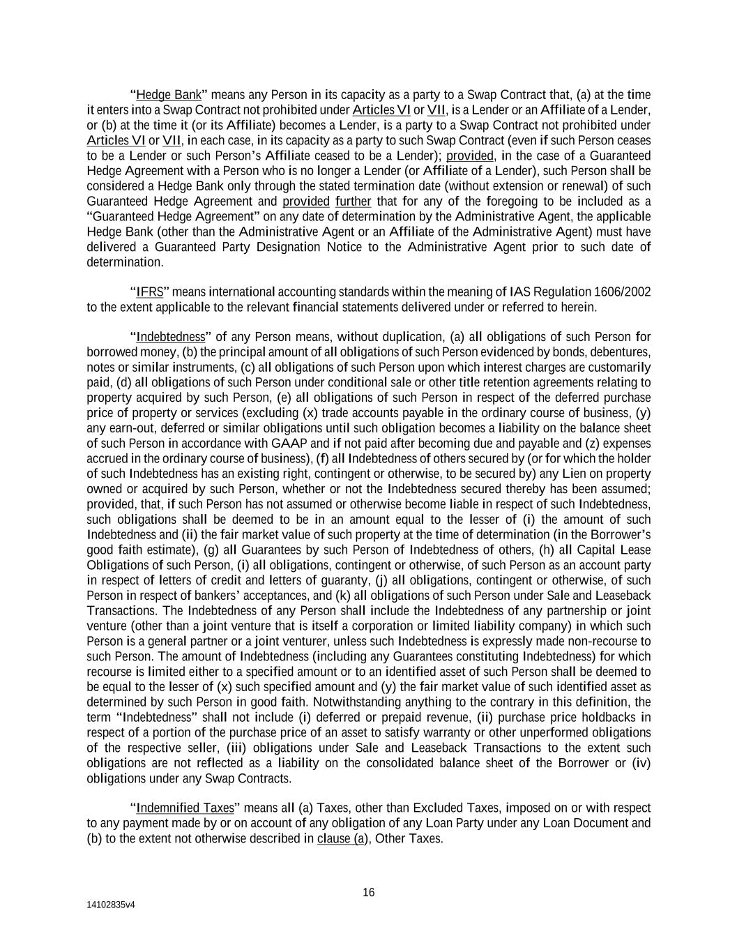 16 14102835v4 “Hedge Bank” means any Person in its capacity as a party to a Swap Contract that, (a) at the time it enters into a Swap Contract not prohibited under Articles VI or VII, is a Lender or an Affiliate of a Lender, or (b) at the time it (or its Affiliate) becomes a Lender, is a party to a Swap Contract not prohibited under Articles VI or VII, in each case, in its capacity as a party to such Swap Contract (even if such Person ceases to be a Lender or such Person’s Affiliate ceased to be a Lender); provided, in the case of a Guaranteed Hedge Agreement with a Person who is no longer a Lender (or Affiliate of a Lender), such Person shall be considered a Hedge Bank only through the stated termination date (without extension or renewal) of such Guaranteed Hedge Agreement and provided further that for any of the foregoing to be included as a “Guaranteed Hedge Agreement” on any date of determination by the Administrative Agent, the applicable Hedge Bank (other than the Administrative Agent or an Affiliate of the Administrative Agent) must have delivered a Guaranteed Party Designation Notice to the Administrative Agent prior to such date of determination. “IFRS” means international accounting standards within the meaning of IAS Regulation 1606/2002 to the extent applicable to the relevant financial statements delivered under or referred to herein. “Indebtedness” of any Person means, without duplication, (a) all obligations of such Person for borrowed money, (b) the principal amount of all obligations of such Person evidenced by bonds, debentures, notes or similar instruments, (c) all obligations of such Person upon which interest charges are customarily paid, (d) all obligations of such Person under conditional sale or other title retention agreements relating to property acquired by such Person, (e) all obligations of such Person in respect of the deferred purchase price of property or services (excluding (x) trade accounts payable in the ordinary course of business, (y) any earn-out, deferred or similar obligations until such obligation becomes a liability on the balance sheet of such Person in accordance with GAAP and if not paid after becoming due and payable and (z) expenses accrued in the ordinary course of business), (f) all Indebtedness of others secured by (or for which the holder of such Indebtedness has an existing right, contingent or otherwise, to be secured by) any Lien on property owned or acquired by such Person, whether or not the Indebtedness secured thereby has been assumed; provided, that, if such Person has not assumed or otherwise become liable in respect of such Indebtedness, such obligations shall be deemed to be in an amount equal to the lesser of (i) the amount of such Indebtedness and (ii) the fair market value of such property at the time of determination (in the Borrower’s good faith estimate), (g) all Guarantees by such Person of Indebtedness of others, (h) all Capital Lease Obligations of such Person, (i) all obligations, contingent or otherwise, of such Person as an account party in respect of letters of credit and letters of guaranty, (j) all obligations, contingent or otherwise, of such Person in respect of bankers’ acceptances, and (k) all obligations of such Person under Sale and Leaseback Transactions. The Indebtedness of any Person shall include the Indebtedness of any partnership or joint venture (other than a joint venture that is itself a corporation or limited liability company) in which such Person is a general partner or a joint venturer, unless such Indebtedness is expressly made non-recourse to such Person. The amount of Indebtedness (including any Guarantees constituting Indebtedness) for which recourse is limited either to a specified amount or to an identified asset of such Person shall be deemed to be equal to the lesser of (x) such specified amount and (y) the fair market value of such identified asset as determined by such Person in good faith. Notwithstanding anything to the contrary in this definition, the term “Indebtedness” shall not include (i) deferred or prepaid revenue, (ii) purchase price holdbacks in respect of a portion of the purchase price of an asset to satisfy warranty or other unperformed obligations of the respective seller, (iii) obligations under Sale and Leaseback Transactions to the extent such obligations are not reflected as a liability on the consolidated balance sheet of the Borrower or (iv) obligations under any Swap Contracts. “Indemnified Taxes” means all (a) Taxes, other than Excluded Taxes, imposed on or with respect to any payment made by or on account of any obligation of any Loan Party under any Loan Document and (b) to the extent not otherwise described in clause (a), Other Taxes.