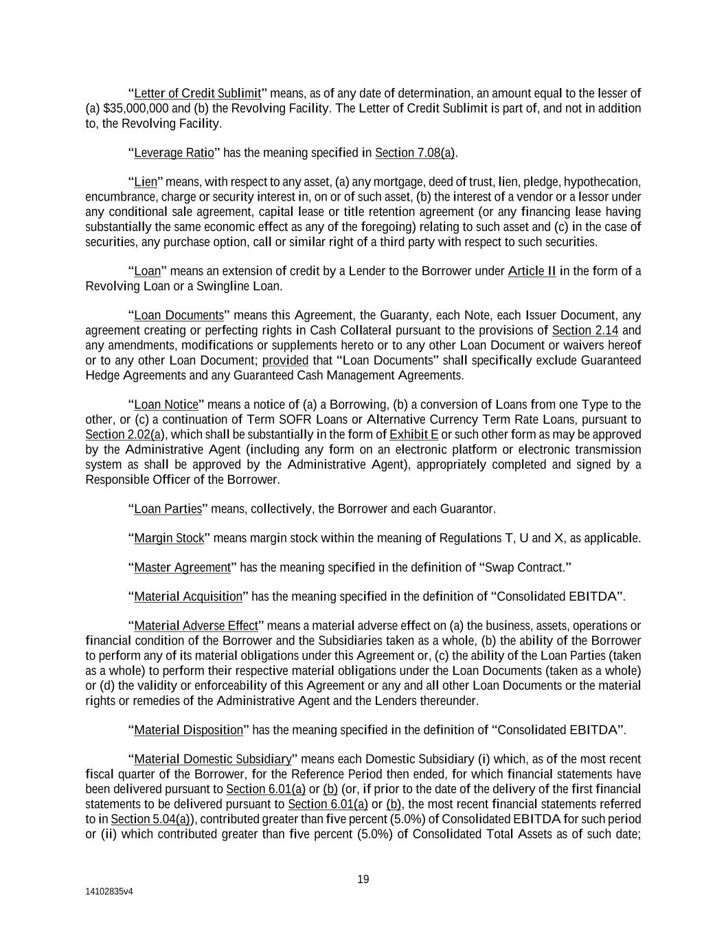 19 14102835v4 “Letter of Credit Sublimit” means, as of any date of determination, an amount equal to the lesser of (a) $35,000,000 and (b) the Revolving Facility. The Letter of Credit Sublimit is part of, and not in addition to, the Revolving Facility. “Leverage Ratio” has the meaning specified in Section 7.08(a). “Lien” means, with respect to any asset, (a) any mortgage, deed of trust, lien, pledge, hypothecation, encumbrance, charge or security interest in, on or of such asset, (b) the interest of a vendor or a lessor under any conditional sale agreement, capital lease or title retention agreement (or any financing lease having substantially the same economic effect as any of the foregoing) relating to such asset and (c) in the case of securities, any purchase option, call or similar right of a third party with respect to such securities. “Loan” means an extension of credit by a Lender to the Borrower under Article II in the form of a Revolving Loan or a Swingline Loan. “Loan Documents” means this Agreement, the Guaranty, each Note, each Issuer Document, any agreement creating or perfecting rights in Cash Collateral pursuant to the provisions of Section 2.14 and any amendments, modifications or supplements hereto or to any other Loan Document or waivers hereof or to any other Loan Document; provided that “Loan Documents” shall specifically exclude Guaranteed Hedge Agreements and any Guaranteed Cash Management Agreements. “Loan Notice” means a notice of (a) a Borrowing, (b) a conversion of Loans from one Type to the other, or (c) a continuation of Term SOFR Loans or Alternative Currency Term Rate Loans, pursuant to Section 2.02(a), which shall be substantially in the form of Exhibit E or such other form as may be approved by the Administrative Agent (including any form on an electronic platform or electronic transmission system as shall be approved by the Administrative Agent), appropriately completed and signed by a Responsible Officer of the Borrower. “Loan Parties” means, collectively, the Borrower and each Guarantor. “Margin Stock” means margin stock within the meaning of Regulations T, U and X, as applicable. “Master Agreement” has the meaning specified in the definition of “Swap Contract.” “Material Acquisition” has the meaning specified in the definition of “Consolidated EBITDA”. “Material Adverse Effect” means a material adverse effect on (a) the business, assets, operations or financial condition of the Borrower and the Subsidiaries taken as a whole, (b) the ability of the Borrower to perform any of its material obligations under this Agreement or, (c) the ability of the Loan Parties (taken as a whole) to perform their respective material obligations under the Loan Documents (taken as a whole) or (d) the validity or enforceability of this Agreement or any and all other Loan Documents or the material rights or remedies of the Administrative Agent and the Lenders thereunder. “Material Disposition” has the meaning specified in the definition of “Consolidated EBITDA”. “Material Domestic Subsidiary” means each Domestic Subsidiary (i) which, as of the most recent fiscal quarter of the Borrower, for the Reference Period then ended, for which financial statements have been delivered pursuant to Section 6.01(a) or (b) (or, if prior to the date of the delivery of the first financial statements to be delivered pursuant to Section 6.01(a) or (b), the most recent financial statements referred to in Section 5.04(a)), contributed greater than five percent (5.0%) of Consolidated EBITDA for such period or (ii) which contributed greater than five percent (5.0%) of Consolidated Total Assets as of such date;