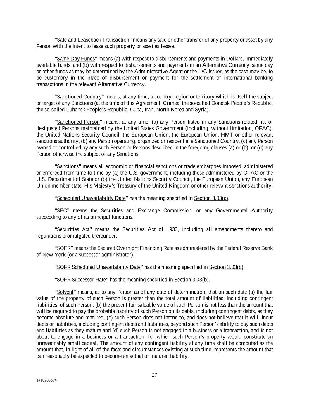 27 14102835v4 “Sale and Leaseback Transaction” means any sale or other transfer of any property or asset by any Person with the intent to lease such property or asset as lessee. “Same Day Funds” means (a) with respect to disbursements and payments in Dollars, immediately available funds, and (b) with respect to disbursements and payments in an Alternative Currency, same day or other funds as may be determined by the Administrative Agent or the L/C Issuer, as the case may be, to be customary in the place of disbursement or payment for the settlement of international banking transactions in the relevant Alternative Currency. “Sanctioned Country” means, at any time, a country, region or territory which is itself the subject or target of any Sanctions (at the time of this Agreement, Crimea, the so-called Donetsk People’s Republic, the so-called Luhansk People’s Republic, Cuba, Iran, North Korea and Syria). “Sanctioned Person” means, at any time, (a) any Person listed in any Sanctions-related list of designated Persons maintained by the United States Government (including, without limitation, OFAC), the United Nations Security Council, the European Union, the European Union, HMT or other relevant sanctions authority, (b) any Person operating, organized or resident in a Sanctioned Country, (c) any Person owned or controlled by any such Person or Persons described in the foregoing clauses (a) or (b), or (d) any Person otherwise the subject of any Sanctions. “Sanctions” means all economic or financial sanctions or trade embargoes imposed, administered or enforced from time to time by (a) the U.S. government, including those administered by OFAC or the U.S. Department of State or (b) the United Nations Security Council, the European Union, any European Union member state, His Majesty’s Treasury of the United Kingdom or other relevant sanctions authority. “Scheduled Unavailability Date” has the meaning specified in Section 3.03(c). “SEC” means the Securities and Exchange Commission, or any Governmental Authority succeeding to any of its principal functions. “Securities Act” means the Securities Act of 1933, including all amendments thereto and regulations promulgated thereunder. “SOFR” means the Secured Overnight Financing Rate as administered by the Federal Reserve Bank of New York (or a successor administrator). “SOFR Scheduled Unavailability Date” has the meaning specified in Section 3.03(b). “SOFR Successor Rate” has the meaning specified in Section 3.03(b). “Solvent” means, as to any Person as of any date of determination, that on such date (a) the fair value of the property of such Person is greater than the total amount of liabilities, including contingent liabilities, of such Person, (b) the present fair saleable value of such Person is not less than the amount that will be required to pay the probable liability of such Person on its debts, including contingent debts, as they become absolute and matured, (c) such Person does not intend to, and does not believe that it will, incur debts or liabilities, including contingent debts and liabilities, beyond such Person’s ability to pay such debts and liabilities as they mature and (d) such Person is not engaged in a business or a transaction, and is not about to engage in a business or a transaction, for which such Person’s property would constitute an unreasonably small capital. The amount of any contingent liability at any time shall be computed as the amount that, in light of all of the facts and circumstances existing at such time, represents the amount that can reasonably be expected to become an actual or matured liability.