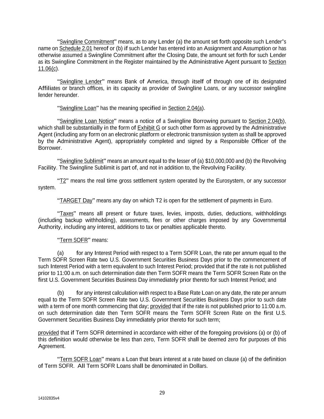 29 14102835v4 “Swingline Commitment” means, as to any Lender (a) the amount set forth opposite such Lender’s name on Schedule 2.01 hereof or (b) if such Lender has entered into an Assignment and Assumption or has otherwise assumed a Swingline Commitment after the Closing Date, the amount set forth for such Lender as its Swingline Commitment in the Register maintained by the Administrative Agent pursuant to Section 11.06(c). “Swingline Lender” means Bank of America, through itself of through one of its designated Affiliates or branch offices, in its capacity as provider of Swingline Loans, or any successor swingline lender hereunder. “Swingline Loan” has the meaning specified in Section 2.04(a). “Swingline Loan Notice” means a notice of a Swingline Borrowing pursuant to Section 2.04(b), which shall be substantially in the form of Exhibit G or such other form as approved by the Administrative Agent (including any form on an electronic platform or electronic transmission system as shall be approved by the Administrative Agent), appropriately completed and signed by a Responsible Officer of the Borrower. “Swingline Sublimit” means an amount equal to the lesser of (a) $10,000,000 and (b) the Revolving Facility. The Swingline Sublimit is part of, and not in addition to, the Revolving Facility. “T2” means the real time gross settlement system operated by the Eurosystem, or any successor system. “TARGET Day” means any day on which T2 is open for the settlement of payments in Euro. “Taxes” means all present or future taxes, levies, imposts, duties, deductions, withholdings (including backup withholding), assessments, fees or other charges imposed by any Governmental Authority, including any interest, additions to tax or penalties applicable thereto. “Term SOFR” means: (a) for any Interest Period with respect to a Term SOFR Loan, the rate per annum equal to the Term SOFR Screen Rate two U.S. Government Securities Business Days prior to the commencement of such Interest Period with a term equivalent to such Interest Period; provided that if the rate is not published prior to 11:00 a.m. on such determination date then Term SOFR means the Term SOFR Screen Rate on the first U.S. Government Securities Business Day immediately prior thereto for such Interest Period; and (b) for any interest calculation with respect to a Base Rate Loan on any date, the rate per annum equal to the Term SOFR Screen Rate two U.S. Government Securities Business Days prior to such date with a term of one month commencing that day; provided that if the rate is not published prior to 11:00 a.m. on such determination date then Term SOFR means the Term SOFR Screen Rate on the first U.S. Government Securities Business Day immediately prior thereto for such term; provided that if Term SOFR determined in accordance with either of the foregoing provisions (a) or (b) of this definition would otherwise be less than zero, Term SOFR shall be deemed zero for purposes of this Agreement. “Term SOFR Loan” means a Loan that bears interest at a rate based on clause (a) of the definition of Term SOFR. All Term SOFR Loans shall be denominated in Dollars.