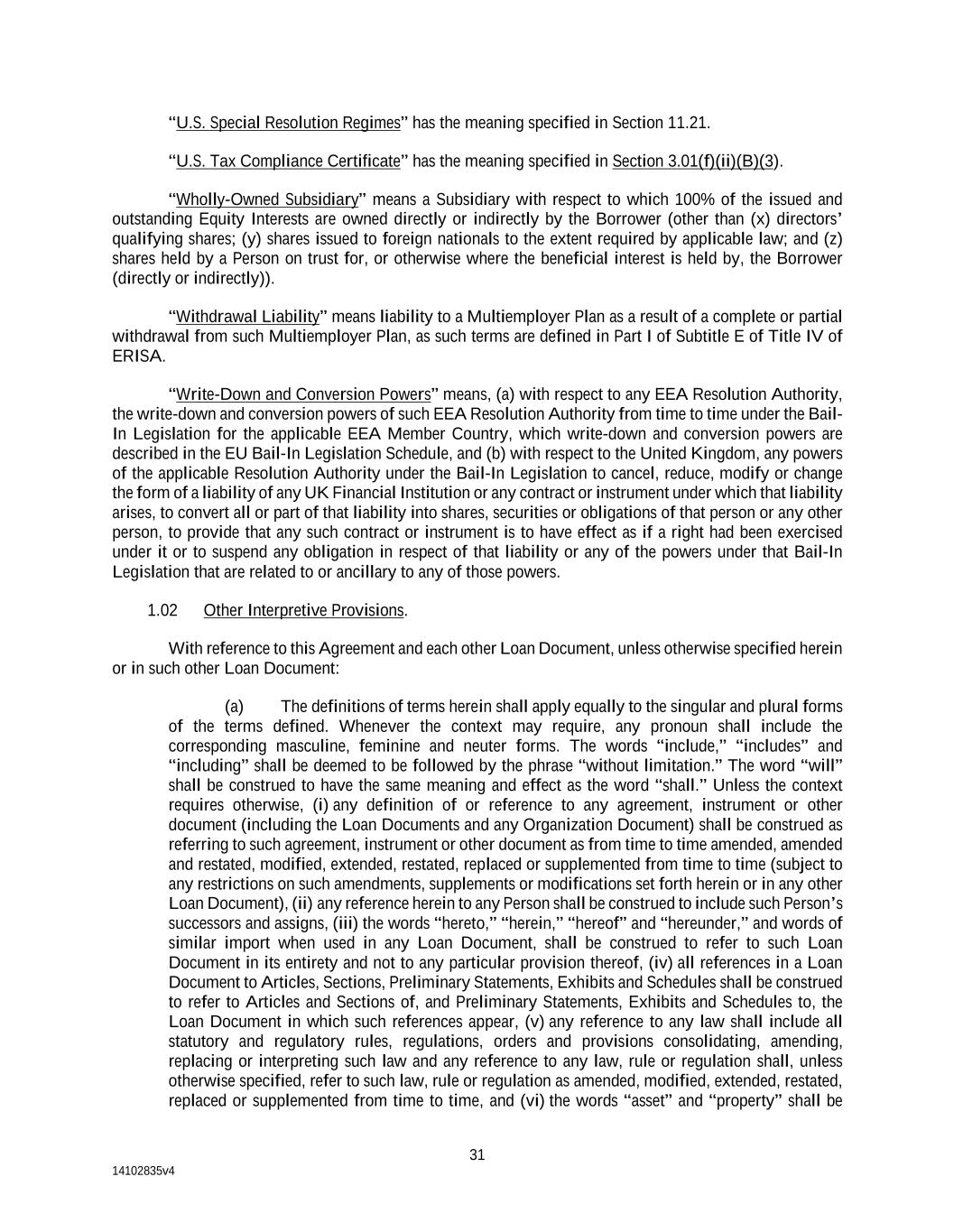 31 14102835v4 “U.S. Special Resolution Regimes” has the meaning specified in Section 11.21. “U.S. Tax Compliance Certificate” has the meaning specified in Section 3.01(f)(ii)(B)(3). “Wholly-Owned Subsidiary” means a Subsidiary with respect to which 100% of the issued and outstanding Equity Interests are owned directly or indirectly by the Borrower (other than (x) directors’ qualifying shares; (y) shares issued to foreign nationals to the extent required by applicable law; and (z) shares held by a Person on trust for, or otherwise where the beneficial interest is held by, the Borrower (directly or indirectly)). “Withdrawal Liability” means liability to a Multiemployer Plan as a result of a complete or partial withdrawal from such Multiemployer Plan, as such terms are defined in Part I of Subtitle E of Title IV of ERISA. “Write-Down and Conversion Powers” means, (a) with respect to any EEA Resolution Authority, the write-down and conversion powers of such EEA Resolution Authority from time to time under the Bail- In Legislation for the applicable EEA Member Country, which write-down and conversion powers are described in the EU Bail-In Legislation Schedule, and (b) with respect to the United Kingdom, any powers of the applicable Resolution Authority under the Bail-In Legislation to cancel, reduce, modify or change the form of a liability of any UK Financial Institution or any contract or instrument under which that liability arises, to convert all or part of that liability into shares, securities or obligations of that person or any other person, to provide that any such contract or instrument is to have effect as if a right had been exercised under it or to suspend any obligation in respect of that liability or any of the powers under that Bail-In Legislation that are related to or ancillary to any of those powers. 1.02 Other Interpretive Provisions. With reference to this Agreement and each other Loan Document, unless otherwise specified herein or in such other Loan Document: (a) The definitions of terms herein shall apply equally to the singular and plural forms of the terms defined. Whenever the context may require, any pronoun shall include the corresponding masculine, feminine and neuter forms. The words “include,” “includes” and “including” shall be deemed to be followed by the phrase “without limitation.” The word “will” shall be construed to have the same meaning and effect as the word “shall.” Unless the context requires otherwise, (i) any definition of or reference to any agreement, instrument or other document (including the Loan Documents and any Organization Document) shall be construed as referring to such agreement, instrument or other document as from time to time amended, amended and restated, modified, extended, restated, replaced or supplemented from time to time (subject to any restrictions on such amendments, supplements or modifications set forth herein or in any other Loan Document), (ii) any reference herein to any Person shall be construed to include such Person’s successors and assigns, (iii) the words “hereto,” “herein,” “hereof” and “hereunder,” and words of similar import when used in any Loan Document, shall be construed to refer to such Loan Document in its entirety and not to any particular provision thereof, (iv) all references in a Loan Document to Articles, Sections, Preliminary Statements, Exhibits and Schedules shall be construed to refer to Articles and Sections of, and Preliminary Statements, Exhibits and Schedules to, the Loan Document in which such references appear, (v) any reference to any law shall include all statutory and regulatory rules, regulations, orders and provisions consolidating, amending, replacing or interpreting such law and any reference to any law, rule or regulation shall, unless otherwise specified, refer to such law, rule or regulation as amended, modified, extended, restated, replaced or supplemented from time to time, and (vi) the words “asset” and “property” shall be