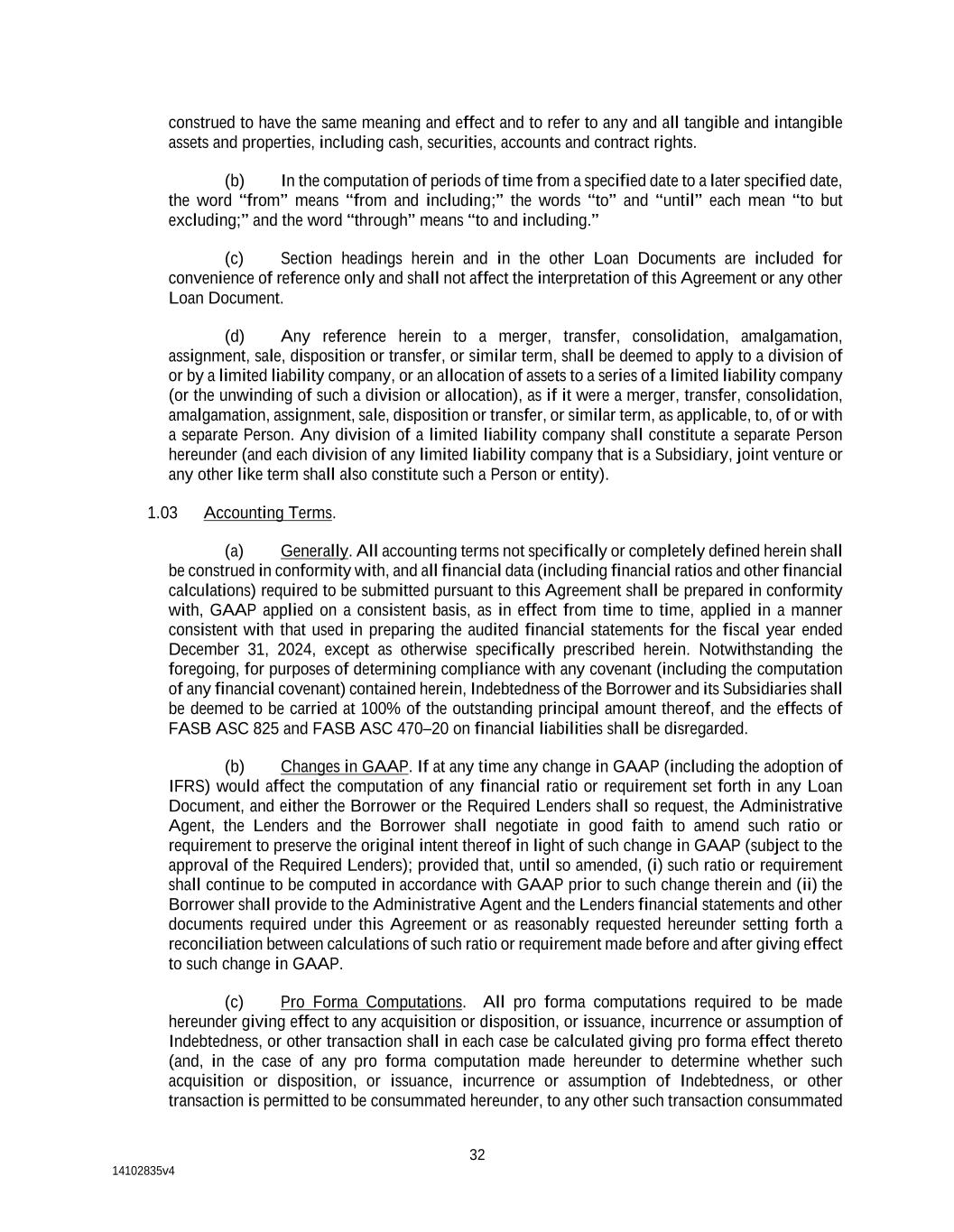 32 14102835v4 construed to have the same meaning and effect and to refer to any and all tangible and intangible assets and properties, including cash, securities, accounts and contract rights. (b) In the computation of periods of time from a specified date to a later specified date, the word “from” means “from and including;” the words “to” and “until” each mean “to but excluding;” and the word “through” means “to and including.” (c) Section headings herein and in the other Loan Documents are included for convenience of reference only and shall not affect the interpretation of this Agreement or any other Loan Document. (d) Any reference herein to a merger, transfer, consolidation, amalgamation, assignment, sale, disposition or transfer, or similar term, shall be deemed to apply to a division of or by a limited liability company, or an allocation of assets to a series of a limited liability company (or the unwinding of such a division or allocation), as if it were a merger, transfer, consolidation, amalgamation, assignment, sale, disposition or transfer, or similar term, as applicable, to, of or with a separate Person. Any division of a limited liability company shall constitute a separate Person hereunder (and each division of any limited liability company that is a Subsidiary, joint venture or any other like term shall also constitute such a Person or entity). 1.03 Accounting Terms. (a) Generally. All accounting terms not specifically or completely defined herein shall be construed in conformity with, and all financial data (including financial ratios and other financial calculations) required to be submitted pursuant to this Agreement shall be prepared in conformity with, GAAP applied on a consistent basis, as in effect from time to time, applied in a manner consistent with that used in preparing the audited financial statements for the fiscal year ended December 31, 2024, except as otherwise specifically prescribed herein. Notwithstanding the foregoing, for purposes of determining compliance with any covenant (including the computation of any financial covenant) contained herein, Indebtedness of the Borrower and its Subsidiaries shall be deemed to be carried at 100% of the outstanding principal amount thereof, and the effects of FASB ASC 825 and FASB ASC 470–20 on financial liabilities shall be disregarded. (b) Changes in GAAP. If at any time any change in GAAP (including the adoption of IFRS) would affect the computation of any financial ratio or requirement set forth in any Loan Document, and either the Borrower or the Required Lenders shall so request, the Administrative Agent, the Lenders and the Borrower shall negotiate in good faith to amend such ratio or requirement to preserve the original intent thereof in light of such change in GAAP (subject to the approval of the Required Lenders); provided that, until so amended, (i) such ratio or requirement shall continue to be computed in accordance with GAAP prior to such change therein and (ii) the Borrower shall provide to the Administrative Agent and the Lenders financial statements and other documents required under this Agreement or as reasonably requested hereunder setting forth a reconciliation between calculations of such ratio or requirement made before and after giving effect to such change in GAAP. (c) Pro Forma Computations. All pro forma computations required to be made hereunder giving effect to any acquisition or disposition, or issuance, incurrence or assumption of Indebtedness, or other transaction shall in each case be calculated giving pro forma effect thereto (and, in the case of any pro forma computation made hereunder to determine whether such acquisition or disposition, or issuance, incurrence or assumption of Indebtedness, or other transaction is permitted to be consummated hereunder, to any other such transaction consummated