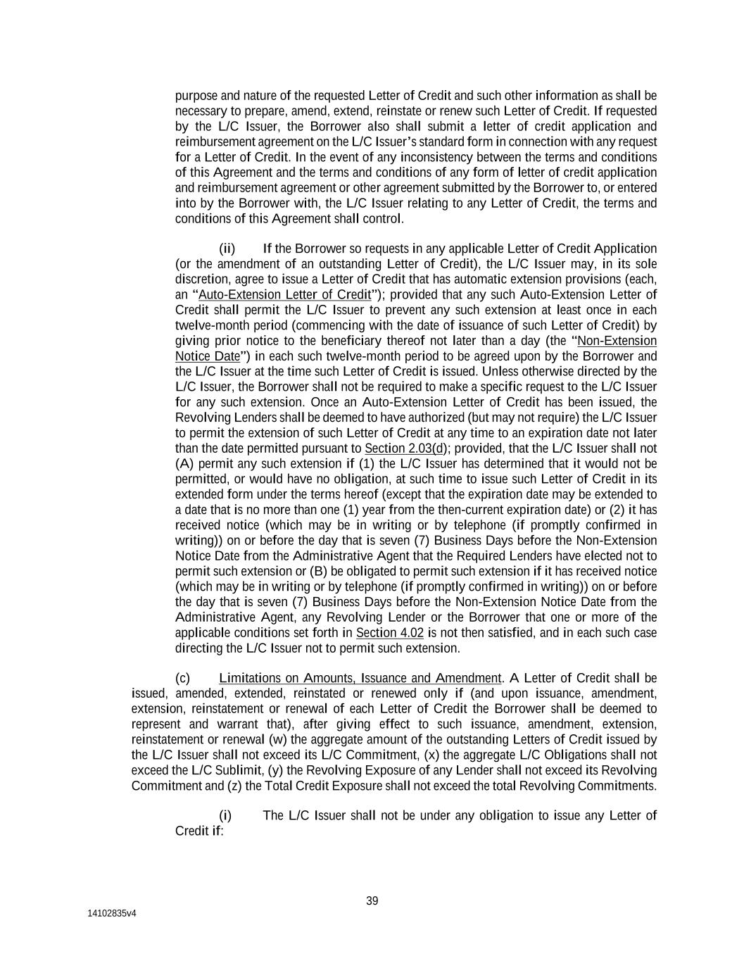 39 14102835v4 purpose and nature of the requested Letter of Credit and such other information as shall be necessary to prepare, amend, extend, reinstate or renew such Letter of Credit. If requested by the L/C Issuer, the Borrower also shall submit a letter of credit application and reimbursement agreement on the L/C Issuer’s standard form in connection with any request for a Letter of Credit. In the event of any inconsistency between the terms and conditions of this Agreement and the terms and conditions of any form of letter of credit application and reimbursement agreement or other agreement submitted by the Borrower to, or entered into by the Borrower with, the L/C Issuer relating to any Letter of Credit, the terms and conditions of this Agreement shall control. (ii) If the Borrower so requests in any applicable Letter of Credit Application (or the amendment of an outstanding Letter of Credit), the L/C Issuer may, in its sole discretion, agree to issue a Letter of Credit that has automatic extension provisions (each, an “Auto-Extension Letter of Credit”); provided that any such Auto-Extension Letter of Credit shall permit the L/C Issuer to prevent any such extension at least once in each twelve-month period (commencing with the date of issuance of such Letter of Credit) by giving prior notice to the beneficiary thereof not later than a day (the “Non-Extension Notice Date”) in each such twelve-month period to be agreed upon by the Borrower and the L/C Issuer at the time such Letter of Credit is issued. Unless otherwise directed by the L/C Issuer, the Borrower shall not be required to make a specific request to the L/C Issuer for any such extension. Once an Auto-Extension Letter of Credit has been issued, the Revolving Lenders shall be deemed to have authorized (but may not require) the L/C Issuer to permit the extension of such Letter of Credit at any time to an expiration date not later than the date permitted pursuant to Section 2.03(d); provided, that the L/C Issuer shall not (A) permit any such extension if (1) the L/C Issuer has determined that it would not be permitted, or would have no obligation, at such time to issue such Letter of Credit in its extended form under the terms hereof (except that the expiration date may be extended to a date that is no more than one (1) year from the then-current expiration date) or (2) it has received notice (which may be in writing or by telephone (if promptly confirmed in writing)) on or before the day that is seven (7) Business Days before the Non-Extension Notice Date from the Administrative Agent that the Required Lenders have elected not to permit such extension or (B) be obligated to permit such extension if it has received notice (which may be in writing or by telephone (if promptly confirmed in writing)) on or before the day that is seven (7) Business Days before the Non-Extension Notice Date from the Administrative Agent, any Revolving Lender or the Borrower that one or more of the applicable conditions set forth in Section 4.02 is not then satisfied, and in each such case directing the L/C Issuer not to permit such extension. (c) Limitations on Amounts, Issuance and Amendment. A Letter of Credit shall be issued, amended, extended, reinstated or renewed only if (and upon issuance, amendment, extension, reinstatement or renewal of each Letter of Credit the Borrower shall be deemed to represent and warrant that), after giving effect to such issuance, amendment, extension, reinstatement or renewal (w) the aggregate amount of the outstanding Letters of Credit issued by the L/C Issuer shall not exceed its L/C Commitment, (x) the aggregate L/C Obligations shall not exceed the L/C Sublimit, (y) the Revolving Exposure of any Lender shall not exceed its Revolving Commitment and (z) the Total Credit Exposure shall not exceed the total Revolving Commitments. (i) The L/C Issuer shall not be under any obligation to issue any Letter of Credit if: