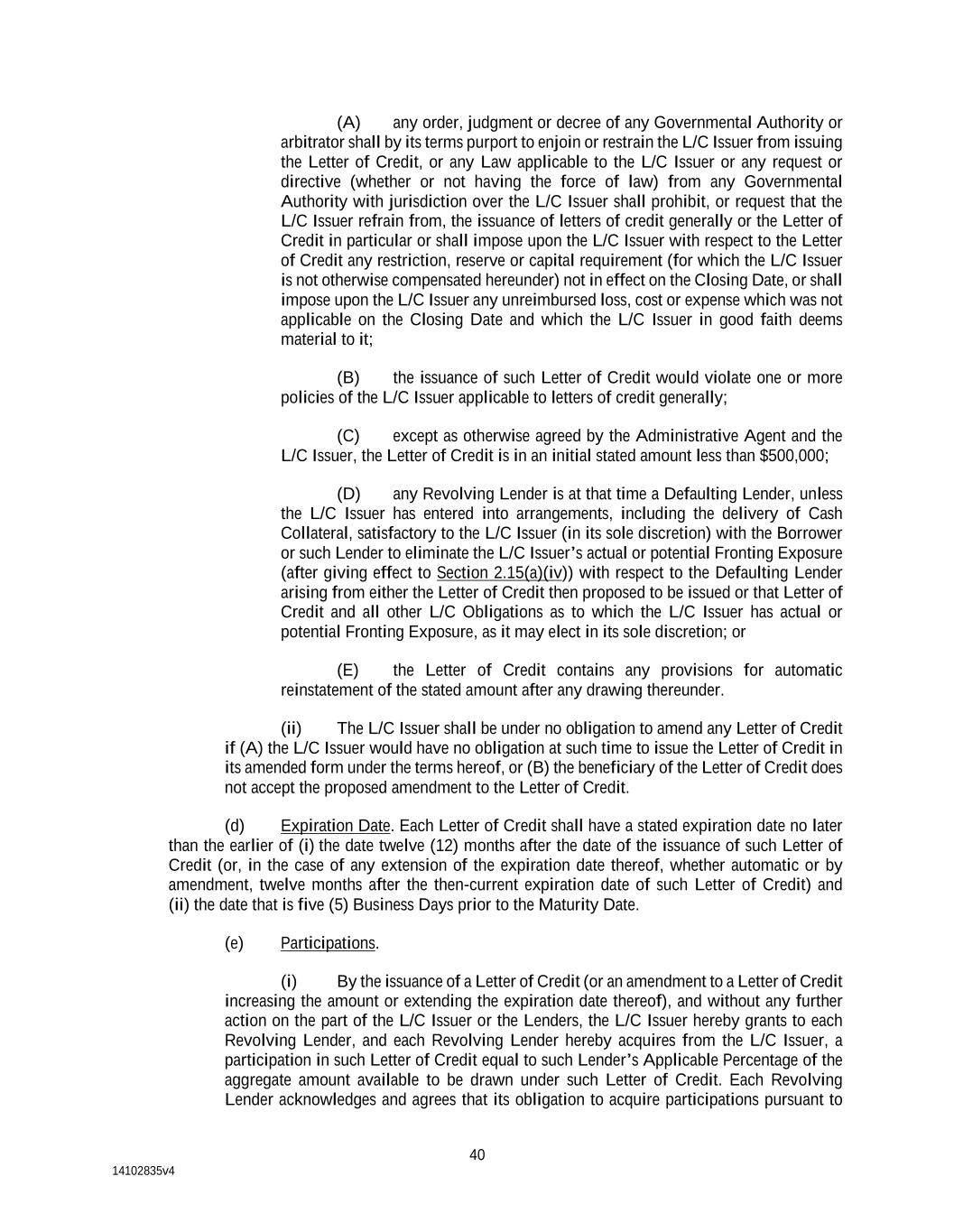 40 14102835v4 (A) any order, judgment or decree of any Governmental Authority or arbitrator shall by its terms purport to enjoin or restrain the L/C Issuer from issuing the Letter of Credit, or any Law applicable to the L/C Issuer or any request or directive (whether or not having the force of law) from any Governmental Authority with jurisdiction over the L/C Issuer shall prohibit, or request that the L/C Issuer refrain from, the issuance of letters of credit generally or the Letter of Credit in particular or shall impose upon the L/C Issuer with respect to the Letter of Credit any restriction, reserve or capital requirement (for which the L/C Issuer is not otherwise compensated hereunder) not in effect on the Closing Date, or shall impose upon the L/C Issuer any unreimbursed loss, cost or expense which was not applicable on the Closing Date and which the L/C Issuer in good faith deems material to it; (B) the issuance of such Letter of Credit would violate one or more policies of the L/C Issuer applicable to letters of credit generally; (C) except as otherwise agreed by the Administrative Agent and the L/C Issuer, the Letter of Credit is in an initial stated amount less than $500,000; (D) any Revolving Lender is at that time a Defaulting Lender, unless the L/C Issuer has entered into arrangements, including the delivery of Cash Collateral, satisfactory to the L/C Issuer (in its sole discretion) with the Borrower or such Lender to eliminate the L/C Issuer’s actual or potential Fronting Exposure (after giving effect to Section 2.15(a)(iv)) with respect to the Defaulting Lender arising from either the Letter of Credit then proposed to be issued or that Letter of Credit and all other L/C Obligations as to which the L/C Issuer has actual or potential Fronting Exposure, as it may elect in its sole discretion; or (E) the Letter of Credit contains any provisions for automatic reinstatement of the stated amount after any drawing thereunder. (ii) The L/C Issuer shall be under no obligation to amend any Letter of Credit if (A) the L/C Issuer would have no obligation at such time to issue the Letter of Credit in its amended form under the terms hereof, or (B) the beneficiary of the Letter of Credit does not accept the proposed amendment to the Letter of Credit. (d) Expiration Date. Each Letter of Credit shall have a stated expiration date no later than the earlier of (i) the date twelve (12) months after the date of the issuance of such Letter of Credit (or, in the case of any extension of the expiration date thereof, whether automatic or by amendment, twelve months after the then-current expiration date of such Letter of Credit) and (ii) the date that is five (5) Business Days prior to the Maturity Date. (e) Participations. (i) By the issuance of a Letter of Credit (or an amendment to a Letter of Credit increasing the amount or extending the expiration date thereof), and without any further action on the part of the L/C Issuer or the Lenders, the L/C Issuer hereby grants to each Revolving Lender, and each Revolving Lender hereby acquires from the L/C Issuer, a participation in such Letter of Credit equal to such Lender’s Applicable Percentage of the aggregate amount available to be drawn under such Letter of Credit. Each Revolving Lender acknowledges and agrees that its obligation to acquire participations pursuant to