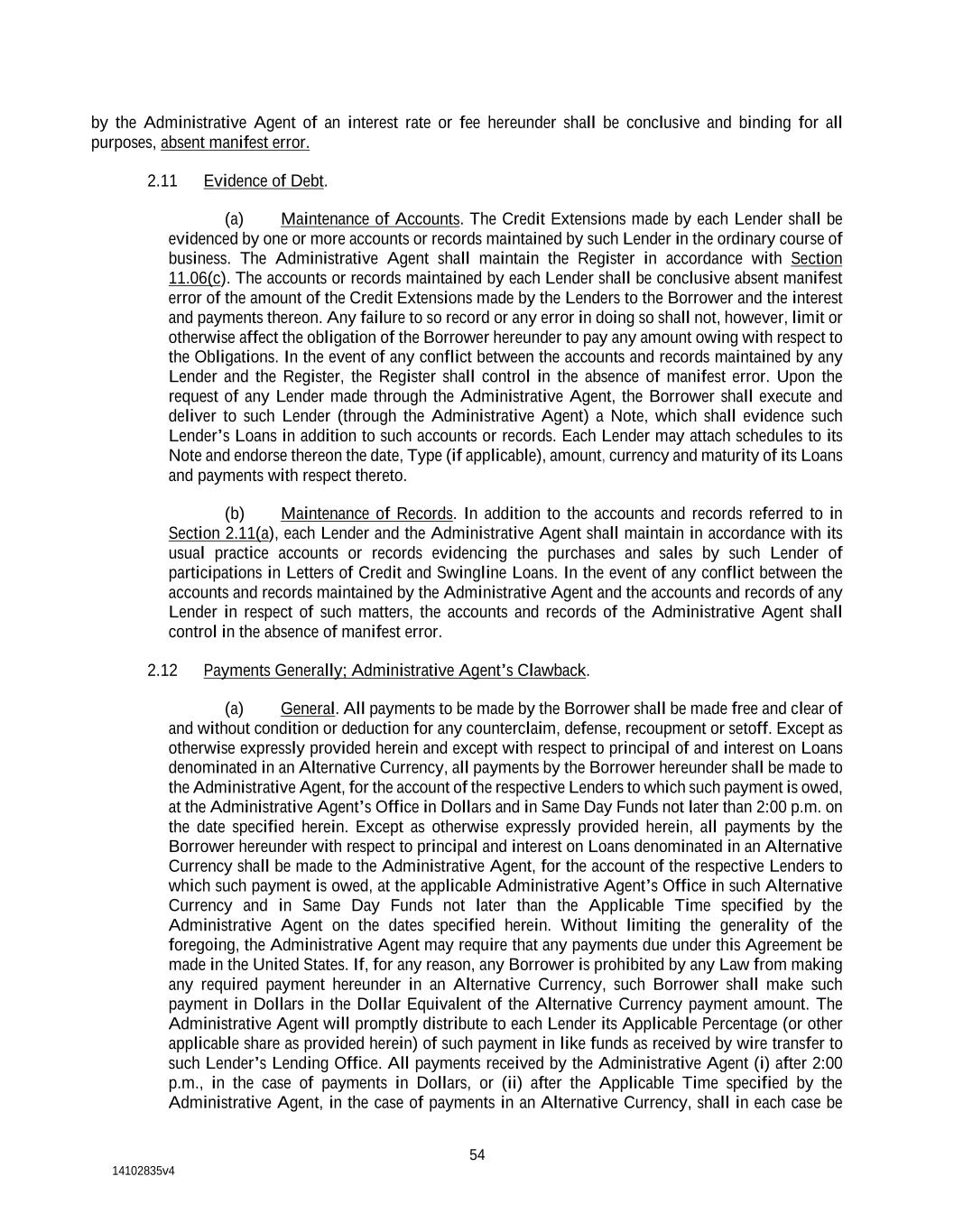 54 14102835v4 by the Administrative Agent of an interest rate or fee hereunder shall be conclusive and binding for all purposes, absent manifest error. 2.11 Evidence of Debt. (a) Maintenance of Accounts. The Credit Extensions made by each Lender shall be evidenced by one or more accounts or records maintained by such Lender in the ordinary course of business. The Administrative Agent shall maintain the Register in accordance with Section 11.06(c). The accounts or records maintained by each Lender shall be conclusive absent manifest error of the amount of the Credit Extensions made by the Lenders to the Borrower and the interest and payments thereon. Any failure to so record or any error in doing so shall not, however, limit or otherwise affect the obligation of the Borrower hereunder to pay any amount owing with respect to the Obligations. In the event of any conflict between the accounts and records maintained by any Lender and the Register, the Register shall control in the absence of manifest error. Upon the request of any Lender made through the Administrative Agent, the Borrower shall execute and deliver to such Lender (through the Administrative Agent) a Note, which shall evidence such Lender’s Loans in addition to such accounts or records. Each Lender may attach schedules to its Note and endorse thereon the date, Type (if applicable), amount, currency and maturity of its Loans and payments with respect thereto. (b) Maintenance of Records. In addition to the accounts and records referred to in Section 2.11(a), each Lender and the Administrative Agent shall maintain in accordance with its usual practice accounts or records evidencing the purchases and sales by such Lender of participations in Letters of Credit and Swingline Loans. In the event of any conflict between the accounts and records maintained by the Administrative Agent and the accounts and records of any Lender in respect of such matters, the accounts and records of the Administrative Agent shall control in the absence of manifest error. 2.12 Payments Generally; Administrative Agent’s Clawback. (a) General. All payments to be made by the Borrower shall be made free and clear of and without condition or deduction for any counterclaim, defense, recoupment or setoff. Except as otherwise expressly provided herein and except with respect to principal of and interest on Loans denominated in an Alternative Currency, all payments by the Borrower hereunder shall be made to the Administrative Agent, for the account of the respective Lenders to which such payment is owed, at the Administrative Agent’s Office in Dollars and in Same Day Funds not later than 2:00 p.m. on the date specified herein. Except as otherwise expressly provided herein, all payments by the Borrower hereunder with respect to principal and interest on Loans denominated in an Alternative Currency shall be made to the Administrative Agent, for the account of the respective Lenders to which such payment is owed, at the applicable Administrative Agent’s Office in such Alternative Currency and in Same Day Funds not later than the Applicable Time specified by the Administrative Agent on the dates specified herein. Without limiting the generality of the foregoing, the Administrative Agent may require that any payments due under this Agreement be made in the United States. If, for any reason, any Borrower is prohibited by any Law from making any required payment hereunder in an Alternative Currency, such Borrower shall make such payment in Dollars in the Dollar Equivalent of the Alternative Currency payment amount. The Administrative Agent will promptly distribute to each Lender its Applicable Percentage (or other applicable share as provided herein) of such payment in like funds as received by wire transfer to such Lender’s Lending Office. All payments received by the Administrative Agent (i) after 2:00 p.m., in the case of payments in Dollars, or (ii) after the Applicable Time specified by the Administrative Agent, in the case of payments in an Alternative Currency, shall in each case be
