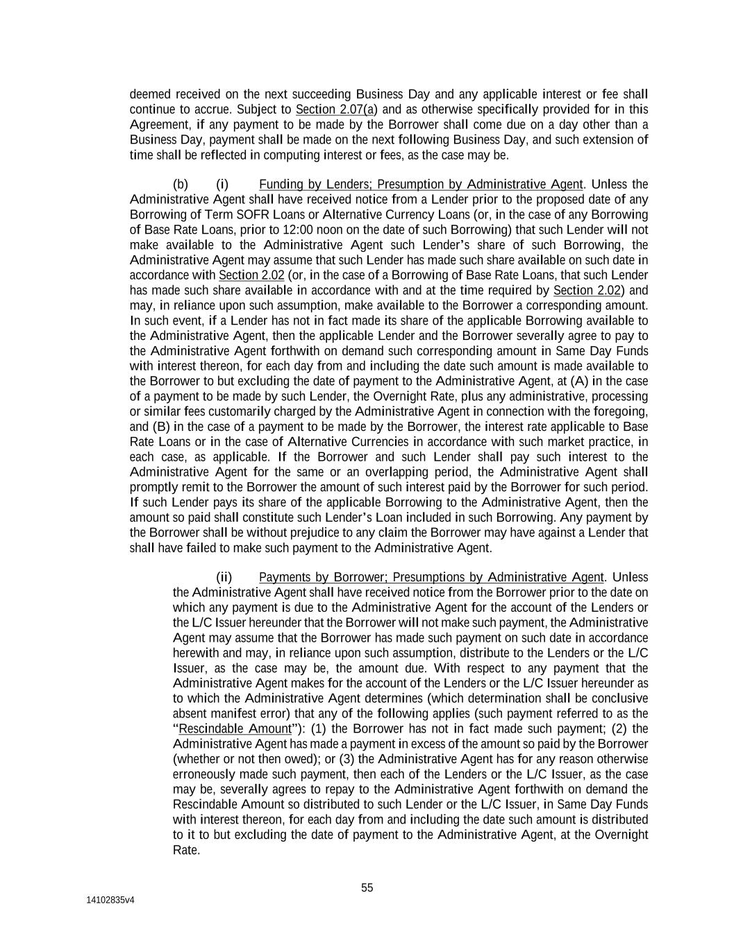 55 14102835v4 deemed received on the next succeeding Business Day and any applicable interest or fee shall continue to accrue. Subject to Section 2.07(a) and as otherwise specifically provided for in this Agreement, if any payment to be made by the Borrower shall come due on a day other than a Business Day, payment shall be made on the next following Business Day, and such extension of time shall be reflected in computing interest or fees, as the case may be. (b) (i) Funding by Lenders; Presumption by Administrative Agent. Unless the Administrative Agent shall have received notice from a Lender prior to the proposed date of any Borrowing of Term SOFR Loans or Alternative Currency Loans (or, in the case of any Borrowing of Base Rate Loans, prior to 12:00 noon on the date of such Borrowing) that such Lender will not make available to the Administrative Agent such Lender’s share of such Borrowing, the Administrative Agent may assume that such Lender has made such share available on such date in accordance with Section 2.02 (or, in the case of a Borrowing of Base Rate Loans, that such Lender has made such share available in accordance with and at the time required by Section 2.02) and may, in reliance upon such assumption, make available to the Borrower a corresponding amount. In such event, if a Lender has not in fact made its share of the applicable Borrowing available to the Administrative Agent, then the applicable Lender and the Borrower severally agree to pay to the Administrative Agent forthwith on demand such corresponding amount in Same Day Funds with interest thereon, for each day from and including the date such amount is made available to the Borrower to but excluding the date of payment to the Administrative Agent, at (A) in the case of a payment to be made by such Lender, the Overnight Rate, plus any administrative, processing or similar fees customarily charged by the Administrative Agent in connection with the foregoing, and (B) in the case of a payment to be made by the Borrower, the interest rate applicable to Base Rate Loans or in the case of Alternative Currencies in accordance with such market practice, in each case, as applicable. If the Borrower and such Lender shall pay such interest to the Administrative Agent for the same or an overlapping period, the Administrative Agent shall promptly remit to the Borrower the amount of such interest paid by the Borrower for such period. If such Lender pays its share of the applicable Borrowing to the Administrative Agent, then the amount so paid shall constitute such Lender’s Loan included in such Borrowing. Any payment by the Borrower shall be without prejudice to any claim the Borrower may have against a Lender that shall have failed to make such payment to the Administrative Agent. (ii) Payments by Borrower; Presumptions by Administrative Agent. Unless the Administrative Agent shall have received notice from the Borrower prior to the date on which any payment is due to the Administrative Agent for the account of the Lenders or the L/C Issuer hereunder that the Borrower will not make such payment, the Administrative Agent may assume that the Borrower has made such payment on such date in accordance herewith and may, in reliance upon such assumption, distribute to the Lenders or the L/C Issuer, as the case may be, the amount due. With respect to any payment that the Administrative Agent makes for the account of the Lenders or the L/C Issuer hereunder as to which the Administrative Agent determines (which determination shall be conclusive absent manifest error) that any of the following applies (such payment referred to as the “Rescindable Amount”): (1) the Borrower has not in fact made such payment; (2) the Administrative Agent has made a payment in excess of the amount so paid by the Borrower (whether or not then owed); or (3) the Administrative Agent has for any reason otherwise erroneously made such payment, then each of the Lenders or the L/C Issuer, as the case may be, severally agrees to repay to the Administrative Agent forthwith on demand the Rescindable Amount so distributed to such Lender or the L/C Issuer, in Same Day Funds with interest thereon, for each day from and including the date such amount is distributed to it to but excluding the date of payment to the Administrative Agent, at the Overnight Rate.