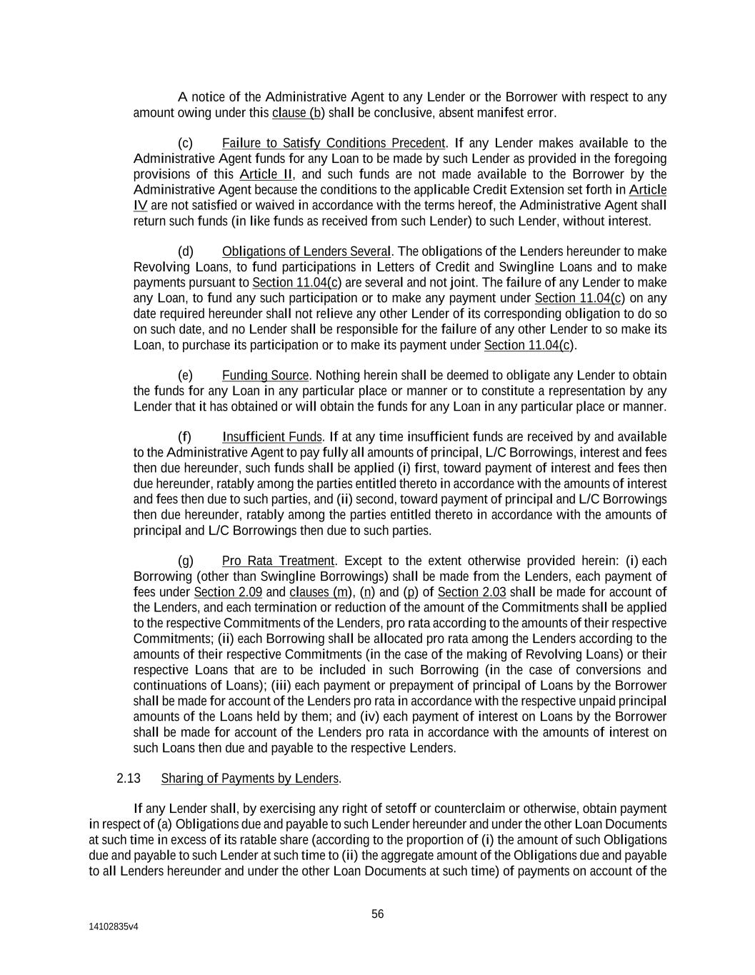 56 14102835v4 A notice of the Administrative Agent to any Lender or the Borrower with respect to any amount owing under this clause (b) shall be conclusive, absent manifest error. (c) Failure to Satisfy Conditions Precedent. If any Lender makes available to the Administrative Agent funds for any Loan to be made by such Lender as provided in the foregoing provisions of this Article II, and such funds are not made available to the Borrower by the Administrative Agent because the conditions to the applicable Credit Extension set forth in Article IV are not satisfied or waived in accordance with the terms hereof, the Administrative Agent shall return such funds (in like funds as received from such Lender) to such Lender, without interest. (d) Obligations of Lenders Several. The obligations of the Lenders hereunder to make Revolving Loans, to fund participations in Letters of Credit and Swingline Loans and to make payments pursuant to Section 11.04(c) are several and not joint. The failure of any Lender to make any Loan, to fund any such participation or to make any payment under Section 11.04(c) on any date required hereunder shall not relieve any other Lender of its corresponding obligation to do so on such date, and no Lender shall be responsible for the failure of any other Lender to so make its Loan, to purchase its participation or to make its payment under Section 11.04(c). (e) Funding Source. Nothing herein shall be deemed to obligate any Lender to obtain the funds for any Loan in any particular place or manner or to constitute a representation by any Lender that it has obtained or will obtain the funds for any Loan in any particular place or manner. (f) Insufficient Funds. If at any time insufficient funds are received by and available to the Administrative Agent to pay fully all amounts of principal, L/C Borrowings, interest and fees then due hereunder, such funds shall be applied (i) first, toward payment of interest and fees then due hereunder, ratably among the parties entitled thereto in accordance with the amounts of interest and fees then due to such parties, and (ii) second, toward payment of principal and L/C Borrowings then due hereunder, ratably among the parties entitled thereto in accordance with the amounts of principal and L/C Borrowings then due to such parties. (g) Pro Rata Treatment. Except to the extent otherwise provided herein: (i) each Borrowing (other than Swingline Borrowings) shall be made from the Lenders, each payment of fees under Section 2.09 and clauses (m), (n) and (p) of Section 2.03 shall be made for account of the Lenders, and each termination or reduction of the amount of the Commitments shall be applied to the respective Commitments of the Lenders, pro rata according to the amounts of their respective Commitments; (ii) each Borrowing shall be allocated pro rata among the Lenders according to the amounts of their respective Commitments (in the case of the making of Revolving Loans) or their respective Loans that are to be included in such Borrowing (in the case of conversions and continuations of Loans); (iii) each payment or prepayment of principal of Loans by the Borrower shall be made for account of the Lenders pro rata in accordance with the respective unpaid principal amounts of the Loans held by them; and (iv) each payment of interest on Loans by the Borrower shall be made for account of the Lenders pro rata in accordance with the amounts of interest on such Loans then due and payable to the respective Lenders. 2.13 Sharing of Payments by Lenders. If any Lender shall, by exercising any right of setoff or counterclaim or otherwise, obtain payment in respect of (a) Obligations due and payable to such Lender hereunder and under the other Loan Documents at such time in excess of its ratable share (according to the proportion of (i) the amount of such Obligations due and payable to such Lender at such time to (ii) the aggregate amount of the Obligations due and payable to all Lenders hereunder and under the other Loan Documents at such time) of payments on account of the