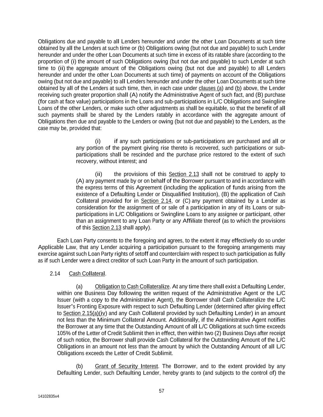 57 14102835v4 Obligations due and payable to all Lenders hereunder and under the other Loan Documents at such time obtained by all the Lenders at such time or (b) Obligations owing (but not due and payable) to such Lender hereunder and under the other Loan Documents at such time in excess of its ratable share (according to the proportion of (i) the amount of such Obligations owing (but not due and payable) to such Lender at such time to (ii) the aggregate amount of the Obligations owing (but not due and payable) to all Lenders hereunder and under the other Loan Documents at such time) of payments on account of the Obligations owing (but not due and payable) to all Lenders hereunder and under the other Loan Documents at such time obtained by all of the Lenders at such time, then, in each case under clauses (a) and (b) above, the Lender receiving such greater proportion shall (A) notify the Administrative Agent of such fact, and (B) purchase (for cash at face value) participations in the Loans and sub-participations in L/C Obligations and Swingline Loans of the other Lenders, or make such other adjustments as shall be equitable, so that the benefit of all such payments shall be shared by the Lenders ratably in accordance with the aggregate amount of Obligations then due and payable to the Lenders or owing (but not due and payable) to the Lenders, as the case may be, provided that: (i) if any such participations or sub-participations are purchased and all or any portion of the payment giving rise thereto is recovered, such participations or sub- participations shall be rescinded and the purchase price restored to the extent of such recovery, without interest; and (ii) the provisions of this Section 2.13 shall not be construed to apply to (A) any payment made by or on behalf of the Borrower pursuant to and in accordance with the express terms of this Agreement (including the application of funds arising from the existence of a Defaulting Lender or Disqualified Institution), (B) the application of Cash Collateral provided for in Section 2.14, or (C) any payment obtained by a Lender as consideration for the assignment of or sale of a participation in any of its Loans or sub- participations in L/C Obligations or Swingline Loans to any assignee or participant, other than an assignment to any Loan Party or any Affiliate thereof (as to which the provisions of this Section 2.13 shall apply). Each Loan Party consents to the foregoing and agrees, to the extent it may effectively do so under Applicable Law, that any Lender acquiring a participation pursuant to the foregoing arrangements may exercise against such Loan Party rights of setoff and counterclaim with respect to such participation as fully as if such Lender were a direct creditor of such Loan Party in the amount of such participation. 2.14 Cash Collateral. (a) Obligation to Cash Collateralize. At any time there shall exist a Defaulting Lender, within one Business Day following the written request of the Administrative Agent or the L/C Issuer (with a copy to the Administrative Agent), the Borrower shall Cash Collateralize the L/C Issuer’s Fronting Exposure with respect to such Defaulting Lender (determined after giving effect to Section 2.15(a)(iv) and any Cash Collateral provided by such Defaulting Lender) in an amount not less than the Minimum Collateral Amount. Additionally, if the Administrative Agent notifies the Borrower at any time that the Outstanding Amount of all L/C Obligations at such time exceeds 105% of the Letter of Credit Sublimit then in effect, then within two (2) Business Days after receipt of such notice, the Borrower shall provide Cash Collateral for the Outstanding Amount of the L/C Obligations in an amount not less than the amount by which the Outstanding Amount of all L/C Obligations exceeds the Letter of Credit Sublimit. (b) Grant of Security Interest. The Borrower, and to the extent provided by any Defaulting Lender, such Defaulting Lender, hereby grants to (and subjects to the control of) the