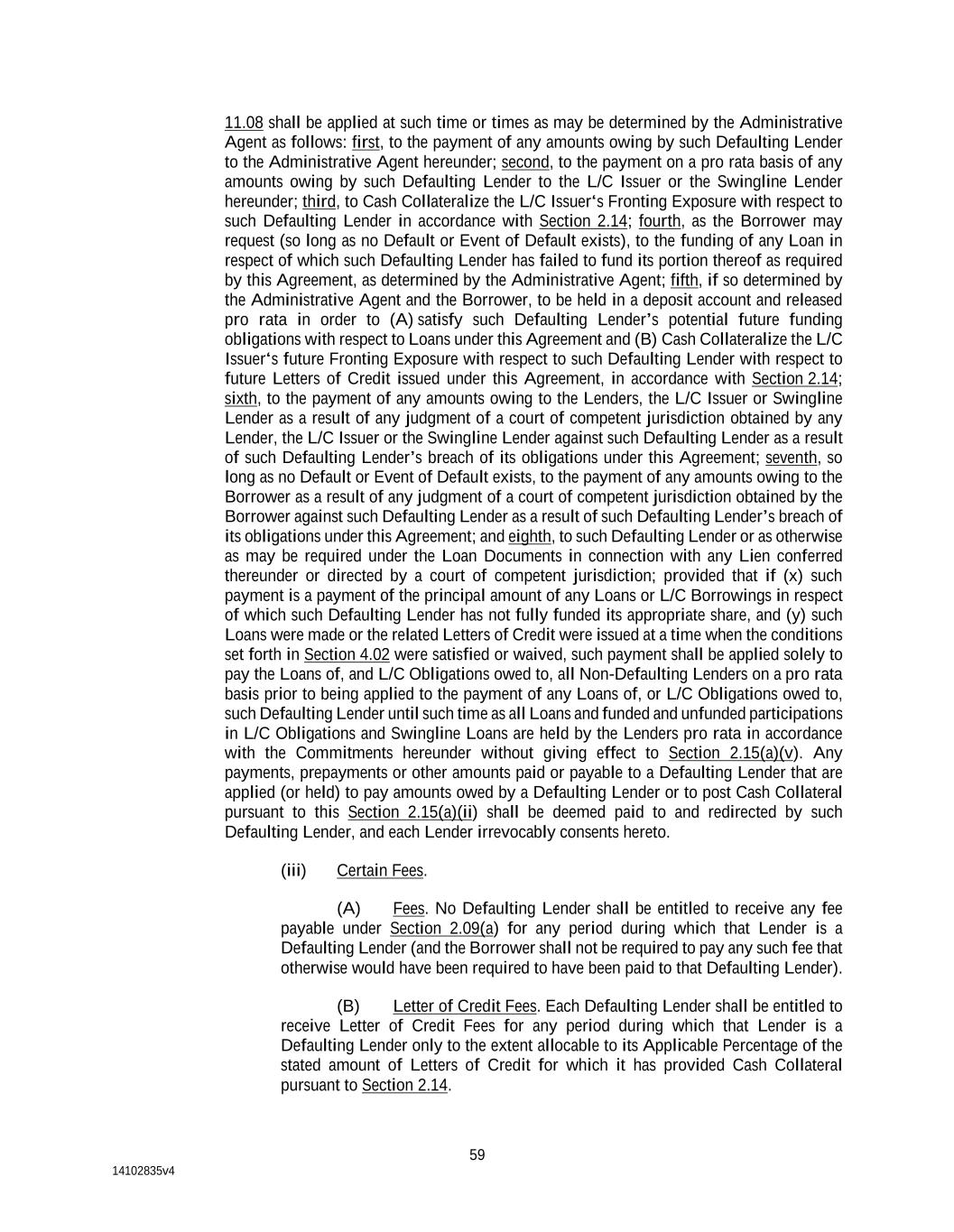 59 14102835v4 11.08 shall be applied at such time or times as may be determined by the Administrative Agent as follows: first, to the payment of any amounts owing by such Defaulting Lender to the Administrative Agent hereunder; second, to the payment on a pro rata basis of any amounts owing by such Defaulting Lender to the L/C Issuer or the Swingline Lender hereunder; third, to Cash Collateralize the L/C Issuer‘s Fronting Exposure with respect to such Defaulting Lender in accordance with Section 2.14; fourth, as the Borrower may request (so long as no Default or Event of Default exists), to the funding of any Loan in respect of which such Defaulting Lender has failed to fund its portion thereof as required by this Agreement, as determined by the Administrative Agent; fifth, if so determined by the Administrative Agent and the Borrower, to be held in a deposit account and released pro rata in order to (A) satisfy such Defaulting Lender’s potential future funding obligations with respect to Loans under this Agreement and (B) Cash Collateralize the L/C Issuer‘s future Fronting Exposure with respect to such Defaulting Lender with respect to future Letters of Credit issued under this Agreement, in accordance with Section 2.14; sixth, to the payment of any amounts owing to the Lenders, the L/C Issuer or Swingline Lender as a result of any judgment of a court of competent jurisdiction obtained by any Lender, the L/C Issuer or the Swingline Lender against such Defaulting Lender as a result of such Defaulting Lender’s breach of its obligations under this Agreement; seventh, so long as no Default or Event of Default exists, to the payment of any amounts owing to the Borrower as a result of any judgment of a court of competent jurisdiction obtained by the Borrower against such Defaulting Lender as a result of such Defaulting Lender’s breach of its obligations under this Agreement; and eighth, to such Defaulting Lender or as otherwise as may be required under the Loan Documents in connection with any Lien conferred thereunder or directed by a court of competent jurisdiction; provided that if (x) such payment is a payment of the principal amount of any Loans or L/C Borrowings in respect of which such Defaulting Lender has not fully funded its appropriate share, and (y) such Loans were made or the related Letters of Credit were issued at a time when the conditions set forth in Section 4.02 were satisfied or waived, such payment shall be applied solely to pay the Loans of, and L/C Obligations owed to, all Non-Defaulting Lenders on a pro rata basis prior to being applied to the payment of any Loans of, or L/C Obligations owed to, such Defaulting Lender until such time as all Loans and funded and unfunded participations in L/C Obligations and Swingline Loans are held by the Lenders pro rata in accordance with the Commitments hereunder without giving effect to Section 2.15(a)(v). Any payments, prepayments or other amounts paid or payable to a Defaulting Lender that are applied (or held) to pay amounts owed by a Defaulting Lender or to post Cash Collateral pursuant to this Section 2.15(a)(ii) shall be deemed paid to and redirected by such Defaulting Lender, and each Lender irrevocably consents hereto. (iii) Certain Fees. (A) Fees. No Defaulting Lender shall be entitled to receive any fee payable under Section 2.09(a) for any period during which that Lender is a Defaulting Lender (and the Borrower shall not be required to pay any such fee that otherwise would have been required to have been paid to that Defaulting Lender). (B) Letter of Credit Fees. Each Defaulting Lender shall be entitled to receive Letter of Credit Fees for any period during which that Lender is a Defaulting Lender only to the extent allocable to its Applicable Percentage of the stated amount of Letters of Credit for which it has provided Cash Collateral pursuant to Section 2.14.
