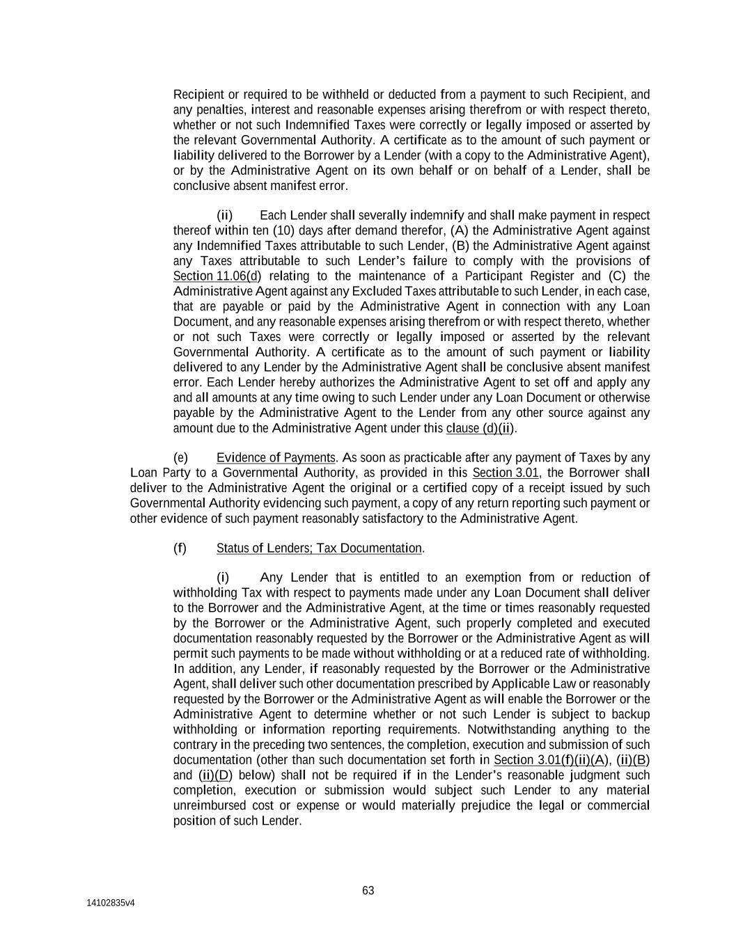 63 14102835v4 Recipient or required to be withheld or deducted from a payment to such Recipient, and any penalties, interest and reasonable expenses arising therefrom or with respect thereto, whether or not such Indemnified Taxes were correctly or legally imposed or asserted by the relevant Governmental Authority. A certificate as to the amount of such payment or liability delivered to the Borrower by a Lender (with a copy to the Administrative Agent), or by the Administrative Agent on its own behalf or on behalf of a Lender, shall be conclusive absent manifest error. (ii) Each Lender shall severally indemnify and shall make payment in respect thereof within ten (10) days after demand therefor, (A) the Administrative Agent against any Indemnified Taxes attributable to such Lender, (B) the Administrative Agent against any Taxes attributable to such Lender’s failure to comply with the provisions of Section 11.06(d) relating to the maintenance of a Participant Register and (C) the Administrative Agent against any Excluded Taxes attributable to such Lender, in each case, that are payable or paid by the Administrative Agent in connection with any Loan Document, and any reasonable expenses arising therefrom or with respect thereto, whether or not such Taxes were correctly or legally imposed or asserted by the relevant Governmental Authority. A certificate as to the amount of such payment or liability delivered to any Lender by the Administrative Agent shall be conclusive absent manifest error. Each Lender hereby authorizes the Administrative Agent to set off and apply any and all amounts at any time owing to such Lender under any Loan Document or otherwise payable by the Administrative Agent to the Lender from any other source against any amount due to the Administrative Agent under this clause (d)(ii). (e) Evidence of Payments. As soon as practicable after any payment of Taxes by any Loan Party to a Governmental Authority, as provided in this Section 3.01, the Borrower shall deliver to the Administrative Agent the original or a certified copy of a receipt issued by such Governmental Authority evidencing such payment, a copy of any return reporting such payment or other evidence of such payment reasonably satisfactory to the Administrative Agent. (f) Status of Lenders; Tax Documentation. (i) Any Lender that is entitled to an exemption from or reduction of withholding Tax with respect to payments made under any Loan Document shall deliver to the Borrower and the Administrative Agent, at the time or times reasonably requested by the Borrower or the Administrative Agent, such properly completed and executed documentation reasonably requested by the Borrower or the Administrative Agent as will permit such payments to be made without withholding or at a reduced rate of withholding. In addition, any Lender, if reasonably requested by the Borrower or the Administrative Agent, shall deliver such other documentation prescribed by Applicable Law or reasonably requested by the Borrower or the Administrative Agent as will enable the Borrower or the Administrative Agent to determine whether or not such Lender is subject to backup withholding or information reporting requirements. Notwithstanding anything to the contrary in the preceding two sentences, the completion, execution and submission of such documentation (other than such documentation set forth in Section 3.01(f)(ii)(A), (ii)(B) and (ii)(D) below) shall not be required if in the Lender’s reasonable judgment such completion, execution or submission would subject such Lender to any material unreimbursed cost or expense or would materially prejudice the legal or commercial position of such Lender.