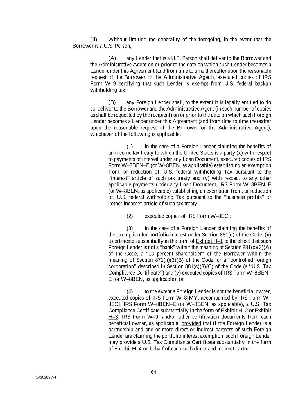 64 14102835v4 (ii) Without limiting the generality of the foregoing, in the event that the Borrower is a U.S. Person, (A) any Lender that is a U.S. Person shall deliver to the Borrower and the Administrative Agent on or prior to the date on which such Lender becomes a Lender under this Agreement (and from time to time thereafter upon the reasonable request of the Borrower or the Administrative Agent), executed copies of IRS Form W–9 certifying that such Lender is exempt from U.S. federal backup withholding tax; (B) any Foreign Lender shall, to the extent it is legally entitled to do so, deliver to the Borrower and the Administrative Agent (in such number of copies as shall be requested by the recipient) on or prior to the date on which such Foreign Lender becomes a Lender under this Agreement (and from time to time thereafter upon the reasonable request of the Borrower or the Administrative Agent), whichever of the following is applicable: (1) in the case of a Foreign Lender claiming the benefits of an income tax treaty to which the United States is a party (x) with respect to payments of interest under any Loan Document, executed copies of IRS Form W–8BEN–E (or W–8BEN, as applicable) establishing an exemption from, or reduction of, U.S. federal withholding Tax pursuant to the “interest” article of such tax treaty and (y) with respect to any other applicable payments under any Loan Document, IRS Form W–8BEN–E (or W–8BEN, as applicable) establishing an exemption from, or reduction of, U.S. federal withholding Tax pursuant to the “business profits” or “other income” article of such tax treaty; (2) executed copies of IRS Form W–8ECI; (3) in the case of a Foreign Lender claiming the benefits of the exemption for portfolio interest under Section 881(c) of the Code, (x) a certificate substantially in the form of Exhibit H–1 to the effect that such Foreign Lender is not a “bank” within the meaning of Section 881(c)(3)(A) of the Code, a “10 percent shareholder” of the Borrower within the meaning of Section 871(h)(3)(B) of the Code, or a “controlled foreign corporation” described in Section 881(c)(3)(C) of the Code (a “U.S. Tax Compliance Certificate”) and (y) executed copies of IRS Form W–8BEN– E (or W–8BEN, as applicable); or (4) to the extent a Foreign Lender is not the beneficial owner, executed copies of IRS Form W–8IMY, accompanied by IRS Form W– 8ECI, IRS Form W–8BEN–E (or W–8BEN, as applicable), a U.S. Tax Compliance Certificate substantially in the form of Exhibit H–2 or Exhibit H–3, IRS Form W–9, and/or other certification documents from each beneficial owner, as applicable; provided that if the Foreign Lender is a partnership and one or more direct or indirect partners of such Foreign Lender are claiming the portfolio interest exemption, such Foreign Lender may provide a U.S. Tax Compliance Certificate substantially in the form of Exhibit H–4 on behalf of each such direct and indirect partner;