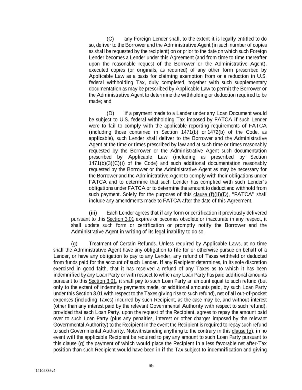 65 14102835v4 (C) any Foreign Lender shall, to the extent it is legally entitled to do so, deliver to the Borrower and the Administrative Agent (in such number of copies as shall be requested by the recipient) on or prior to the date on which such Foreign Lender becomes a Lender under this Agreement (and from time to time thereafter upon the reasonable request of the Borrower or the Administrative Agent), executed copies (or originals, as required) of any other form prescribed by Applicable Law as a basis for claiming exemption from or a reduction in U.S. federal withholding Tax, duly completed, together with such supplementary documentation as may be prescribed by Applicable Law to permit the Borrower or the Administrative Agent to determine the withholding or deduction required to be made; and (D) if a payment made to a Lender under any Loan Document would be subject to U.S. federal withholding Tax imposed by FATCA if such Lender were to fail to comply with the applicable reporting requirements of FATCA (including those contained in Section 1471(b) or 1472(b) of the Code, as applicable), such Lender shall deliver to the Borrower and the Administrative Agent at the time or times prescribed by law and at such time or times reasonably requested by the Borrower or the Administrative Agent such documentation prescribed by Applicable Law (including as prescribed by Section 1471(b)(3)(C)(i) of the Code) and such additional documentation reasonably requested by the Borrower or the Administrative Agent as may be necessary for the Borrower and the Administrative Agent to comply with their obligations under FATCA and to determine that such Lender has complied with such Lender’s obligations under FATCA or to determine the amount to deduct and withhold from such payment. Solely for the purposes of this clause (f)(ii)(D), “FATCA” shall include any amendments made to FATCA after the date of this Agreement. (iii) Each Lender agrees that if any form or certification it previously delivered pursuant to this Section 3.01 expires or becomes obsolete or inaccurate in any respect, it shall update such form or certification or promptly notify the Borrower and the Administrative Agent in writing of its legal inability to do so. (g) Treatment of Certain Refunds. Unless required by Applicable Laws, at no time shall the Administrative Agent have any obligation to file for or otherwise pursue on behalf of a Lender, or have any obligation to pay to any Lender, any refund of Taxes withheld or deducted from funds paid for the account of such Lender. If any Recipient determines, in its sole discretion exercised in good faith, that it has received a refund of any Taxes as to which it has been indemnified by any Loan Party or with respect to which any Loan Party has paid additional amounts pursuant to this Section 3.01, it shall pay to such Loan Party an amount equal to such refund (but only to the extent of indemnity payments made, or additional amounts paid, by such Loan Party under this Section 3.01 with respect to the Taxes giving rise to such refund), net of all out-of-pocket expenses (including Taxes) incurred by such Recipient, as the case may be, and without interest (other than any interest paid by the relevant Governmental Authority with respect to such refund), provided that each Loan Party, upon the request of the Recipient, agrees to repay the amount paid over to such Loan Party (plus any penalties, interest or other charges imposed by the relevant Governmental Authority) to the Recipient in the event the Recipient is required to repay such refund to such Governmental Authority. Notwithstanding anything to the contrary in this clause (g), in no event will the applicable Recipient be required to pay any amount to such Loan Party pursuant to this clause (g) the payment of which would place the Recipient in a less favorable net after-Tax position than such Recipient would have been in if the Tax subject to indemnification and giving