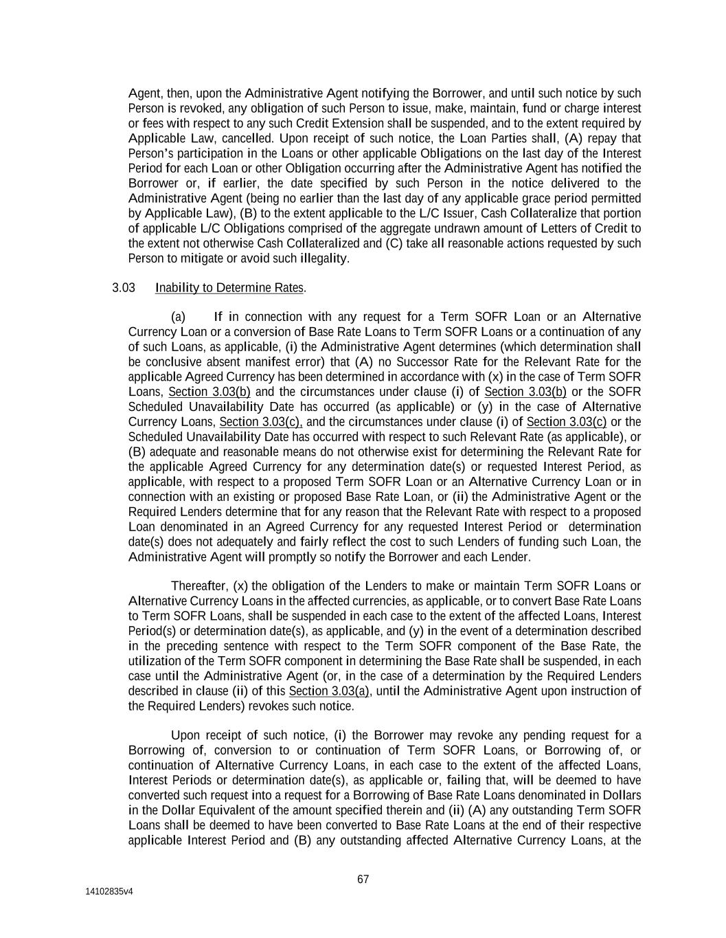 67 14102835v4 Agent, then, upon the Administrative Agent notifying the Borrower, and until such notice by such Person is revoked, any obligation of such Person to issue, make, maintain, fund or charge interest or fees with respect to any such Credit Extension shall be suspended, and to the extent required by Applicable Law, cancelled. Upon receipt of such notice, the Loan Parties shall, (A) repay that Person’s participation in the Loans or other applicable Obligations on the last day of the Interest Period for each Loan or other Obligation occurring after the Administrative Agent has notified the Borrower or, if earlier, the date specified by such Person in the notice delivered to the Administrative Agent (being no earlier than the last day of any applicable grace period permitted by Applicable Law), (B) to the extent applicable to the L/C Issuer, Cash Collateralize that portion of applicable L/C Obligations comprised of the aggregate undrawn amount of Letters of Credit to the extent not otherwise Cash Collateralized and (C) take all reasonable actions requested by such Person to mitigate or avoid such illegality. 3.03 Inability to Determine Rates. (a) If in connection with any request for a Term SOFR Loan or an Alternative Currency Loan or a conversion of Base Rate Loans to Term SOFR Loans or a continuation of any of such Loans, as applicable, (i) the Administrative Agent determines (which determination shall be conclusive absent manifest error) that (A) no Successor Rate for the Relevant Rate for the applicable Agreed Currency has been determined in accordance with (x) in the case of Term SOFR Loans, Section 3.03(b) and the circumstances under clause (i) of Section 3.03(b) or the SOFR Scheduled Unavailability Date has occurred (as applicable) or (y) in the case of Alternative Currency Loans, Section 3.03(c), and the circumstances under clause (i) of Section 3.03(c) or the Scheduled Unavailability Date has occurred with respect to such Relevant Rate (as applicable), or (B) adequate and reasonable means do not otherwise exist for determining the Relevant Rate for the applicable Agreed Currency for any determination date(s) or requested Interest Period, as applicable, with respect to a proposed Term SOFR Loan or an Alternative Currency Loan or in connection with an existing or proposed Base Rate Loan, or (ii) the Administrative Agent or the Required Lenders determine that for any reason that the Relevant Rate with respect to a proposed Loan denominated in an Agreed Currency for any requested Interest Period or determination date(s) does not adequately and fairly reflect the cost to such Lenders of funding such Loan, the Administrative Agent will promptly so notify the Borrower and each Lender. Thereafter, (x) the obligation of the Lenders to make or maintain Term SOFR Loans or Alternative Currency Loans in the affected currencies, as applicable, or to convert Base Rate Loans to Term SOFR Loans, shall be suspended in each case to the extent of the affected Loans, Interest Period(s) or determination date(s), as applicable, and (y) in the event of a determination described in the preceding sentence with respect to the Term SOFR component of the Base Rate, the utilization of the Term SOFR component in determining the Base Rate shall be suspended, in each case until the Administrative Agent (or, in the case of a determination by the Required Lenders described in clause (ii) of this Section 3.03(a), until the Administrative Agent upon instruction of the Required Lenders) revokes such notice. Upon receipt of such notice, (i) the Borrower may revoke any pending request for a Borrowing of, conversion to or continuation of Term SOFR Loans, or Borrowing of, or continuation of Alternative Currency Loans, in each case to the extent of the affected Loans, Interest Periods or determination date(s), as applicable or, failing that, will be deemed to have converted such request into a request for a Borrowing of Base Rate Loans denominated in Dollars in the Dollar Equivalent of the amount specified therein and (ii) (A) any outstanding Term SOFR Loans shall be deemed to have been converted to Base Rate Loans at the end of their respective applicable Interest Period and (B) any outstanding affected Alternative Currency Loans, at the
