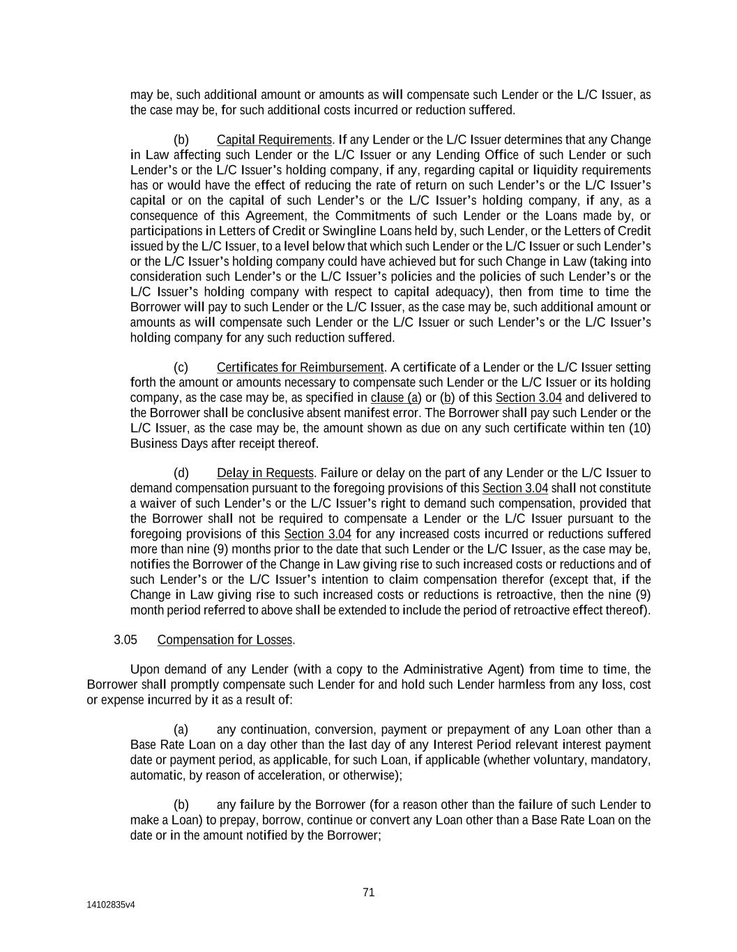 71 14102835v4 may be, such additional amount or amounts as will compensate such Lender or the L/C Issuer, as the case may be, for such additional costs incurred or reduction suffered. (b) Capital Requirements. If any Lender or the L/C Issuer determines that any Change in Law affecting such Lender or the L/C Issuer or any Lending Office of such Lender or such Lender’s or the L/C Issuer’s holding company, if any, regarding capital or liquidity requirements has or would have the effect of reducing the rate of return on such Lender’s or the L/C Issuer’s capital or on the capital of such Lender’s or the L/C Issuer’s holding company, if any, as a consequence of this Agreement, the Commitments of such Lender or the Loans made by, or participations in Letters of Credit or Swingline Loans held by, such Lender, or the Letters of Credit issued by the L/C Issuer, to a level below that which such Lender or the L/C Issuer or such Lender’s or the L/C Issuer’s holding company could have achieved but for such Change in Law (taking into consideration such Lender’s or the L/C Issuer’s policies and the policies of such Lender’s or the L/C Issuer’s holding company with respect to capital adequacy), then from time to time the Borrower will pay to such Lender or the L/C Issuer, as the case may be, such additional amount or amounts as will compensate such Lender or the L/C Issuer or such Lender’s or the L/C Issuer’s holding company for any such reduction suffered. (c) Certificates for Reimbursement. A certificate of a Lender or the L/C Issuer setting forth the amount or amounts necessary to compensate such Lender or the L/C Issuer or its holding company, as the case may be, as specified in clause (a) or (b) of this Section 3.04 and delivered to the Borrower shall be conclusive absent manifest error. The Borrower shall pay such Lender or the L/C Issuer, as the case may be, the amount shown as due on any such certificate within ten (10) Business Days after receipt thereof. (d) Delay in Requests. Failure or delay on the part of any Lender or the L/C Issuer to demand compensation pursuant to the foregoing provisions of this Section 3.04 shall not constitute a waiver of such Lender’s or the L/C Issuer’s right to demand such compensation, provided that the Borrower shall not be required to compensate a Lender or the L/C Issuer pursuant to the foregoing provisions of this Section 3.04 for any increased costs incurred or reductions suffered more than nine (9) months prior to the date that such Lender or the L/C Issuer, as the case may be, notifies the Borrower of the Change in Law giving rise to such increased costs or reductions and of such Lender’s or the L/C Issuer’s intention to claim compensation therefor (except that, if the Change in Law giving rise to such increased costs or reductions is retroactive, then the nine (9) month period referred to above shall be extended to include the period of retroactive effect thereof). 3.05 Compensation for Losses. Upon demand of any Lender (with a copy to the Administrative Agent) from time to time, the Borrower shall promptly compensate such Lender for and hold such Lender harmless from any loss, cost or expense incurred by it as a result of: (a) any continuation, conversion, payment or prepayment of any Loan other than a Base Rate Loan on a day other than the last day of any Interest Period relevant interest payment date or payment period, as applicable, for such Loan, if applicable (whether voluntary, mandatory, automatic, by reason of acceleration, or otherwise); (b) any failure by the Borrower (for a reason other than the failure of such Lender to make a Loan) to prepay, borrow, continue or convert any Loan other than a Base Rate Loan on the date or in the amount notified by the Borrower;