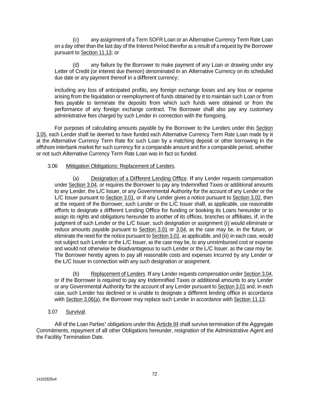 72 14102835v4 (c) any assignment of a Term SOFR Loan or an Alternative Currency Term Rate Loan on a day other than the last day of the Interest Period therefor as a result of a request by the Borrower pursuant to Section 11.13; or (d) any failure by the Borrower to make payment of any Loan or drawing under any Letter of Credit (or interest due thereon) denominated in an Alternative Currency on its scheduled due date or any payment thereof in a different currency; including any loss of anticipated profits, any foreign exchange losses and any loss or expense arising from the liquidation or reemployment of funds obtained by it to maintain such Loan or from fees payable to terminate the deposits from which such funds were obtained or from the performance of any foreign exchange contract. The Borrower shall also pay any customary administrative fees charged by such Lender in connection with the foregoing. For purposes of calculating amounts payable by the Borrower to the Lenders under this Section 3.05, each Lender shall be deemed to have funded each Alternative Currency Term Rate Loan made by it at the Alternative Currency Term Rate for such Loan by a matching deposit or other borrowing in the offshore interbank market for such currency for a comparable amount and for a comparable period, whether or not such Alternative Currency Term Rate Loan was in fact so funded. 3.06 Mitigation Obligations; Replacement of Lenders. (a) Designation of a Different Lending Office. If any Lender requests compensation under Section 3.04, or requires the Borrower to pay any Indemnified Taxes or additional amounts to any Lender, the L/C Issuer, or any Governmental Authority for the account of any Lender or the L/C Issuer pursuant to Section 3.01, or if any Lender gives a notice pursuant to Section 3.02, then at the request of the Borrower, such Lender or the L/C Issuer shall, as applicable, use reasonable efforts to designate a different Lending Office for funding or booking its Loans hereunder or to assign its rights and obligations hereunder to another of its offices, branches or affiliates, if, in the judgment of such Lender or the L/C Issuer, such designation or assignment (i) would eliminate or reduce amounts payable pursuant to Section 3.01 or 3.04, as the case may be, in the future, or eliminate the need for the notice pursuant to Section 3.02, as applicable, and (ii) in each case, would not subject such Lender or the L/C Issuer, as the case may be, to any unreimbursed cost or expense and would not otherwise be disadvantageous to such Lender or the L/C Issuer, as the case may be. The Borrower hereby agrees to pay all reasonable costs and expenses incurred by any Lender or the L/C Issuer in connection with any such designation or assignment. (b) Replacement of Lenders. If any Lender requests compensation under Section 3.04, or if the Borrower is required to pay any Indemnified Taxes or additional amounts to any Lender or any Governmental Authority for the account of any Lender pursuant to Section 3.01 and, in each case, such Lender has declined or is unable to designate a different lending office in accordance with Section 3.06(a), the Borrower may replace such Lender in accordance with Section 11.13. 3.07 Survival. All of the Loan Parties’ obligations under this Article III shall survive termination of the Aggregate Commitments, repayment of all other Obligations hereunder, resignation of the Administrative Agent and the Facility Termination Date.