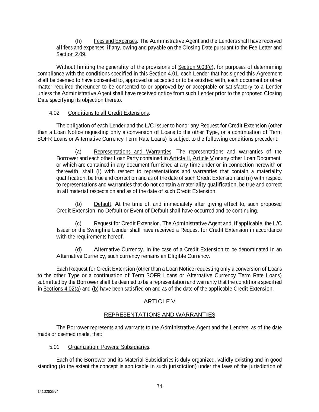 74 14102835v4 (h) Fees and Expenses. The Administrative Agent and the Lenders shall have received all fees and expenses, if any, owing and payable on the Closing Date pursuant to the Fee Letter and Section 2.09. Without limiting the generality of the provisions of Section 9.03(c), for purposes of determining compliance with the conditions specified in this Section 4.01, each Lender that has signed this Agreement shall be deemed to have consented to, approved or accepted or to be satisfied with, each document or other matter required thereunder to be consented to or approved by or acceptable or satisfactory to a Lender unless the Administrative Agent shall have received notice from such Lender prior to the proposed Closing Date specifying its objection thereto. 4.02 Conditions to all Credit Extensions. The obligation of each Lender and the L/C Issuer to honor any Request for Credit Extension (other than a Loan Notice requesting only a conversion of Loans to the other Type, or a continuation of Term SOFR Loans or Alternative Currency Term Rate Loans) is subject to the following conditions precedent: (a) Representations and Warranties. The representations and warranties of the Borrower and each other Loan Party contained in Article II, Article V or any other Loan Document, or which are contained in any document furnished at any time under or in connection herewith or therewith, shall (i) with respect to representations and warranties that contain a materiality qualification, be true and correct on and as of the date of such Credit Extension and (ii) with respect to representations and warranties that do not contain a materiality qualification, be true and correct in all material respects on and as of the date of such Credit Extension. (b) Default. At the time of, and immediately after giving effect to, such proposed Credit Extension, no Default or Event of Default shall have occurred and be continuing. (c) Request for Credit Extension. The Administrative Agent and, if applicable, the L/C Issuer or the Swingline Lender shall have received a Request for Credit Extension in accordance with the requirements hereof. (d) Alternative Currency. In the case of a Credit Extension to be denominated in an Alternative Currency, such currency remains an Eligible Currency. Each Request for Credit Extension (other than a Loan Notice requesting only a conversion of Loans to the other Type or a continuation of Term SOFR Loans or Alternative Currency Term Rate Loans) submitted by the Borrower shall be deemed to be a representation and warranty that the conditions specified in Sections 4.02(a) and (b) have been satisfied on and as of the date of the applicable Credit Extension. ARTICLE V REPRESENTATIONS AND WARRANTIES The Borrower represents and warrants to the Administrative Agent and the Lenders, as of the date made or deemed made, that: 5.01 Organization; Powers; Subsidiaries. Each of the Borrower and its Material Subsidiaries is duly organized, validly existing and in good standing (to the extent the concept is applicable in such jurisdiction) under the laws of the jurisdiction of
