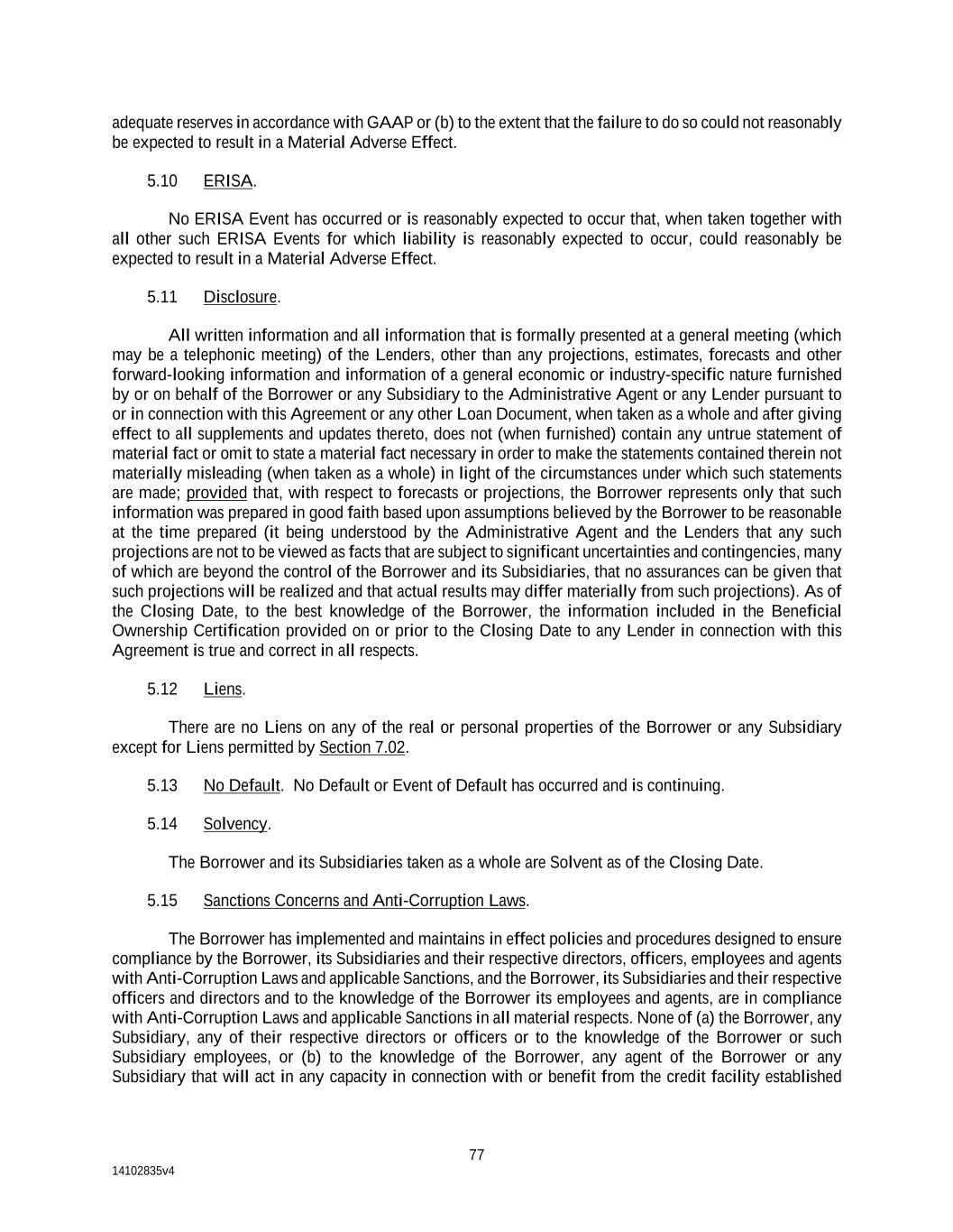 77 14102835v4 adequate reserves in accordance with GAAP or (b) to the extent that the failure to do so could not reasonably be expected to result in a Material Adverse Effect. 5.10 ERISA. No ERISA Event has occurred or is reasonably expected to occur that, when taken together with all other such ERISA Events for which liability is reasonably expected to occur, could reasonably be expected to result in a Material Adverse Effect. 5.11 Disclosure. All written information and all information that is formally presented at a general meeting (which may be a telephonic meeting) of the Lenders, other than any projections, estimates, forecasts and other forward-looking information and information of a general economic or industry-specific nature furnished by or on behalf of the Borrower or any Subsidiary to the Administrative Agent or any Lender pursuant to or in connection with this Agreement or any other Loan Document, when taken as a whole and after giving effect to all supplements and updates thereto, does not (when furnished) contain any untrue statement of material fact or omit to state a material fact necessary in order to make the statements contained therein not materially misleading (when taken as a whole) in light of the circumstances under which such statements are made; provided that, with respect to forecasts or projections, the Borrower represents only that such information was prepared in good faith based upon assumptions believed by the Borrower to be reasonable at the time prepared (it being understood by the Administrative Agent and the Lenders that any such projections are not to be viewed as facts that are subject to significant uncertainties and contingencies, many of which are beyond the control of the Borrower and its Subsidiaries, that no assurances can be given that such projections will be realized and that actual results may differ materially from such projections). As of the Closing Date, to the best knowledge of the Borrower, the information included in the Beneficial Ownership Certification provided on or prior to the Closing Date to any Lender in connection with this Agreement is true and correct in all respects. 5.12 Liens. There are no Liens on any of the real or personal properties of the Borrower or any Subsidiary except for Liens permitted by Section 7.02. 5.13 No Default. No Default or Event of Default has occurred and is continuing. 5.14 Solvency. The Borrower and its Subsidiaries taken as a whole are Solvent as of the Closing Date. 5.15 Sanctions Concerns and Anti-Corruption Laws. The Borrower has implemented and maintains in effect policies and procedures designed to ensure compliance by the Borrower, its Subsidiaries and their respective directors, officers, employees and agents with Anti-Corruption Laws and applicable Sanctions, and the Borrower, its Subsidiaries and their respective officers and directors and to the knowledge of the Borrower its employees and agents, are in compliance with Anti-Corruption Laws and applicable Sanctions in all material respects. None of (a) the Borrower, any Subsidiary, any of their respective directors or officers or to the knowledge of the Borrower or such Subsidiary employees, or (b) to the knowledge of the Borrower, any agent of the Borrower or any Subsidiary that will act in any capacity in connection with or benefit from the credit facility established
