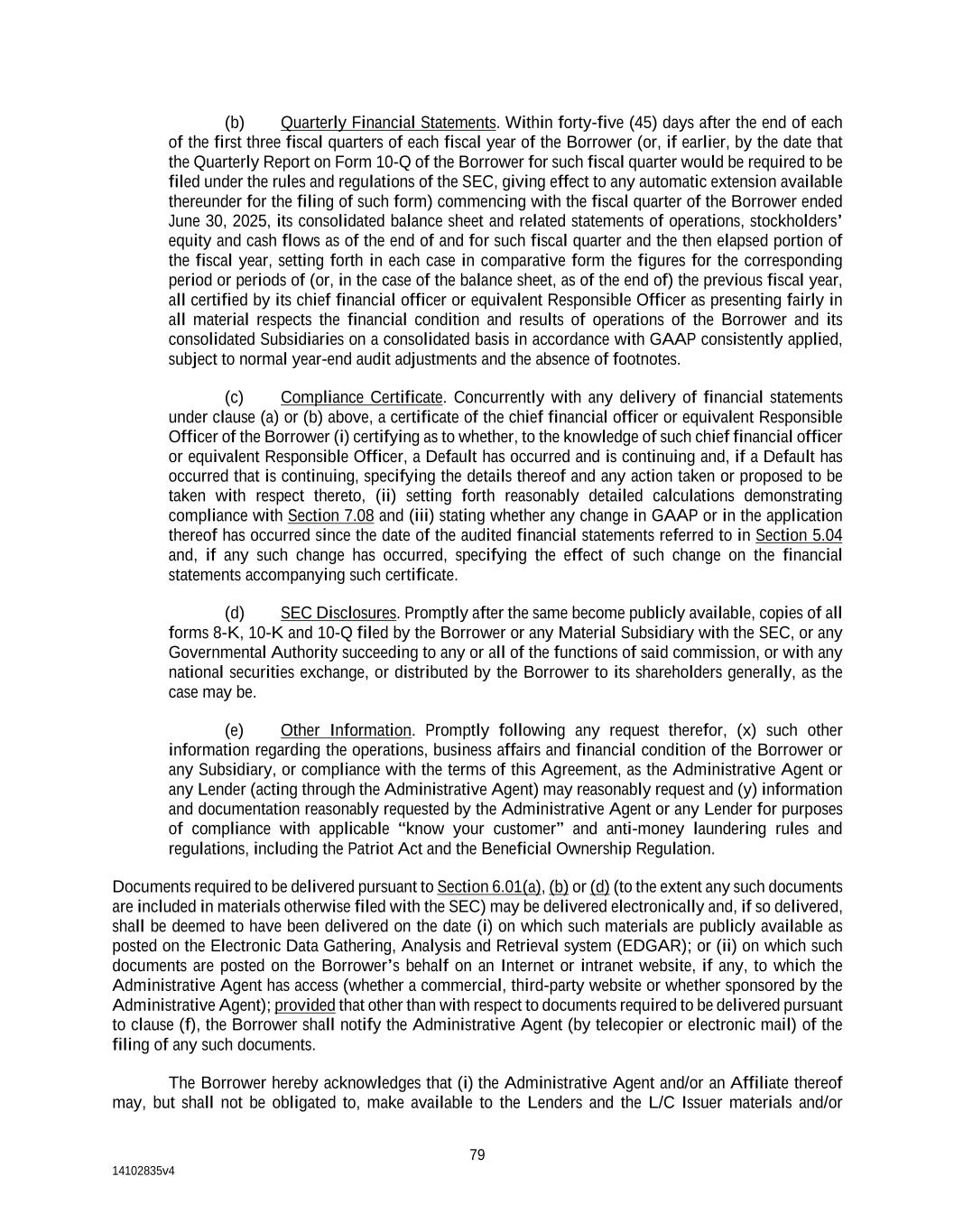 79 14102835v4 (b) Quarterly Financial Statements. Within forty-five (45) days after the end of each of the first three fiscal quarters of each fiscal year of the Borrower (or, if earlier, by the date that the Quarterly Report on Form 10-Q of the Borrower for such fiscal quarter would be required to be filed under the rules and regulations of the SEC, giving effect to any automatic extension available thereunder for the filing of such form) commencing with the fiscal quarter of the Borrower ended June 30, 2025, its consolidated balance sheet and related statements of operations, stockholders’ equity and cash flows as of the end of and for such fiscal quarter and the then elapsed portion of the fiscal year, setting forth in each case in comparative form the figures for the corresponding period or periods of (or, in the case of the balance sheet, as of the end of) the previous fiscal year, all certified by its chief financial officer or equivalent Responsible Officer as presenting fairly in all material respects the financial condition and results of operations of the Borrower and its consolidated Subsidiaries on a consolidated basis in accordance with GAAP consistently applied, subject to normal year-end audit adjustments and the absence of footnotes. (c) Compliance Certificate. Concurrently with any delivery of financial statements under clause (a) or (b) above, a certificate of the chief financial officer or equivalent Responsible Officer of the Borrower (i) certifying as to whether, to the knowledge of such chief financial officer or equivalent Responsible Officer, a Default has occurred and is continuing and, if a Default has occurred that is continuing, specifying the details thereof and any action taken or proposed to be taken with respect thereto, (ii) setting forth reasonably detailed calculations demonstrating compliance with Section 7.08 and (iii) stating whether any change in GAAP or in the application thereof has occurred since the date of the audited financial statements referred to in Section 5.04 and, if any such change has occurred, specifying the effect of such change on the financial statements accompanying such certificate. (d) SEC Disclosures. Promptly after the same become publicly available, copies of all forms 8-K, 10-K and 10-Q filed by the Borrower or any Material Subsidiary with the SEC, or any Governmental Authority succeeding to any or all of the functions of said commission, or with any national securities exchange, or distributed by the Borrower to its shareholders generally, as the case may be. (e) Other Information. Promptly following any request therefor, (x) such other information regarding the operations, business affairs and financial condition of the Borrower or any Subsidiary, or compliance with the terms of this Agreement, as the Administrative Agent or any Lender (acting through the Administrative Agent) may reasonably request and (y) information and documentation reasonably requested by the Administrative Agent or any Lender for purposes of compliance with applicable “know your customer” and anti-money laundering rules and regulations, including the Patriot Act and the Beneficial Ownership Regulation. Documents required to be delivered pursuant to Section 6.01(a), (b) or (d) (to the extent any such documents are included in materials otherwise filed with the SEC) may be delivered electronically and, if so delivered, shall be deemed to have been delivered on the date (i) on which such materials are publicly available as posted on the Electronic Data Gathering, Analysis and Retrieval system (EDGAR); or (ii) on which such documents are posted on the Borrower’s behalf on an Internet or intranet website, if any, to which the Administrative Agent has access (whether a commercial, third-party website or whether sponsored by the Administrative Agent); provided that other than with respect to documents required to be delivered pursuant to clause (f), the Borrower shall notify the Administrative Agent (by telecopier or electronic mail) of the filing of any such documents. The Borrower hereby acknowledges that (i) the Administrative Agent and/or an Affiliate thereof may, but shall not be obligated to, make available to the Lenders and the L/C Issuer materials and/or