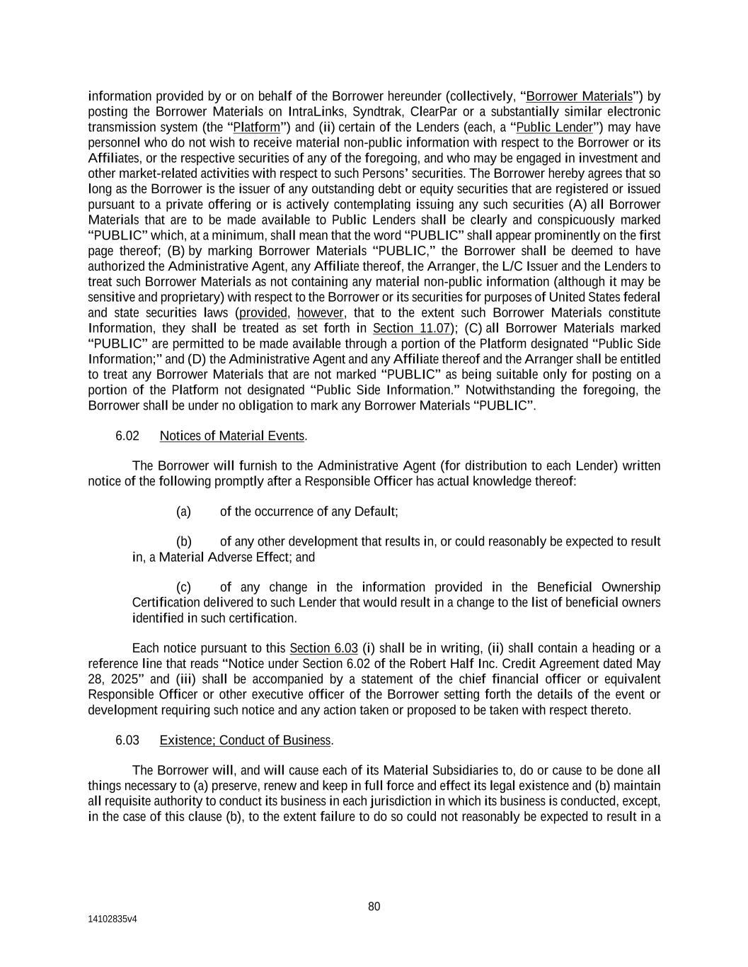 80 14102835v4 information provided by or on behalf of the Borrower hereunder (collectively, “Borrower Materials”) by posting the Borrower Materials on IntraLinks, Syndtrak, ClearPar or a substantially similar electronic transmission system (the “Platform”) and (ii) certain of the Lenders (each, a “Public Lender”) may have personnel who do not wish to receive material non-public information with respect to the Borrower or its Affiliates, or the respective securities of any of the foregoing, and who may be engaged in investment and other market-related activities with respect to such Persons’ securities. The Borrower hereby agrees that so long as the Borrower is the issuer of any outstanding debt or equity securities that are registered or issued pursuant to a private offering or is actively contemplating issuing any such securities (A) all Borrower Materials that are to be made available to Public Lenders shall be clearly and conspicuously marked “PUBLIC” which, at a minimum, shall mean that the word “PUBLIC” shall appear prominently on the first page thereof; (B) by marking Borrower Materials “PUBLIC,” the Borrower shall be deemed to have authorized the Administrative Agent, any Affiliate thereof, the Arranger, the L/C Issuer and the Lenders to treat such Borrower Materials as not containing any material non-public information (although it may be sensitive and proprietary) with respect to the Borrower or its securities for purposes of United States federal and state securities laws (provided, however, that to the extent such Borrower Materials constitute Information, they shall be treated as set forth in Section 11.07); (C) all Borrower Materials marked “PUBLIC” are permitted to be made available through a portion of the Platform designated “Public Side Information;” and (D) the Administrative Agent and any Affiliate thereof and the Arranger shall be entitled to treat any Borrower Materials that are not marked “PUBLIC” as being suitable only for posting on a portion of the Platform not designated “Public Side Information.” Notwithstanding the foregoing, the Borrower shall be under no obligation to mark any Borrower Materials “PUBLIC”. 6.02 Notices of Material Events. The Borrower will furnish to the Administrative Agent (for distribution to each Lender) written notice of the following promptly after a Responsible Officer has actual knowledge thereof: (a) of the occurrence of any Default; (b) of any other development that results in, or could reasonably be expected to result in, a Material Adverse Effect; and (c) of any change in the information provided in the Beneficial Ownership Certification delivered to such Lender that would result in a change to the list of beneficial owners identified in such certification. Each notice pursuant to this Section 6.03 (i) shall be in writing, (ii) shall contain a heading or a reference line that reads “Notice under Section 6.02 of the Robert Half Inc. Credit Agreement dated May 28, 2025” and (iii) shall be accompanied by a statement of the chief financial officer or equivalent Responsible Officer or other executive officer of the Borrower setting forth the details of the event or development requiring such notice and any action taken or proposed to be taken with respect thereto. 6.03 Existence; Conduct of Business. The Borrower will, and will cause each of its Material Subsidiaries to, do or cause to be done all things necessary to (a) preserve, renew and keep in full force and effect its legal existence and (b) maintain all requisite authority to conduct its business in each jurisdiction in which its business is conducted, except, in the case of this clause (b), to the extent failure to do so could not reasonably be expected to result in a