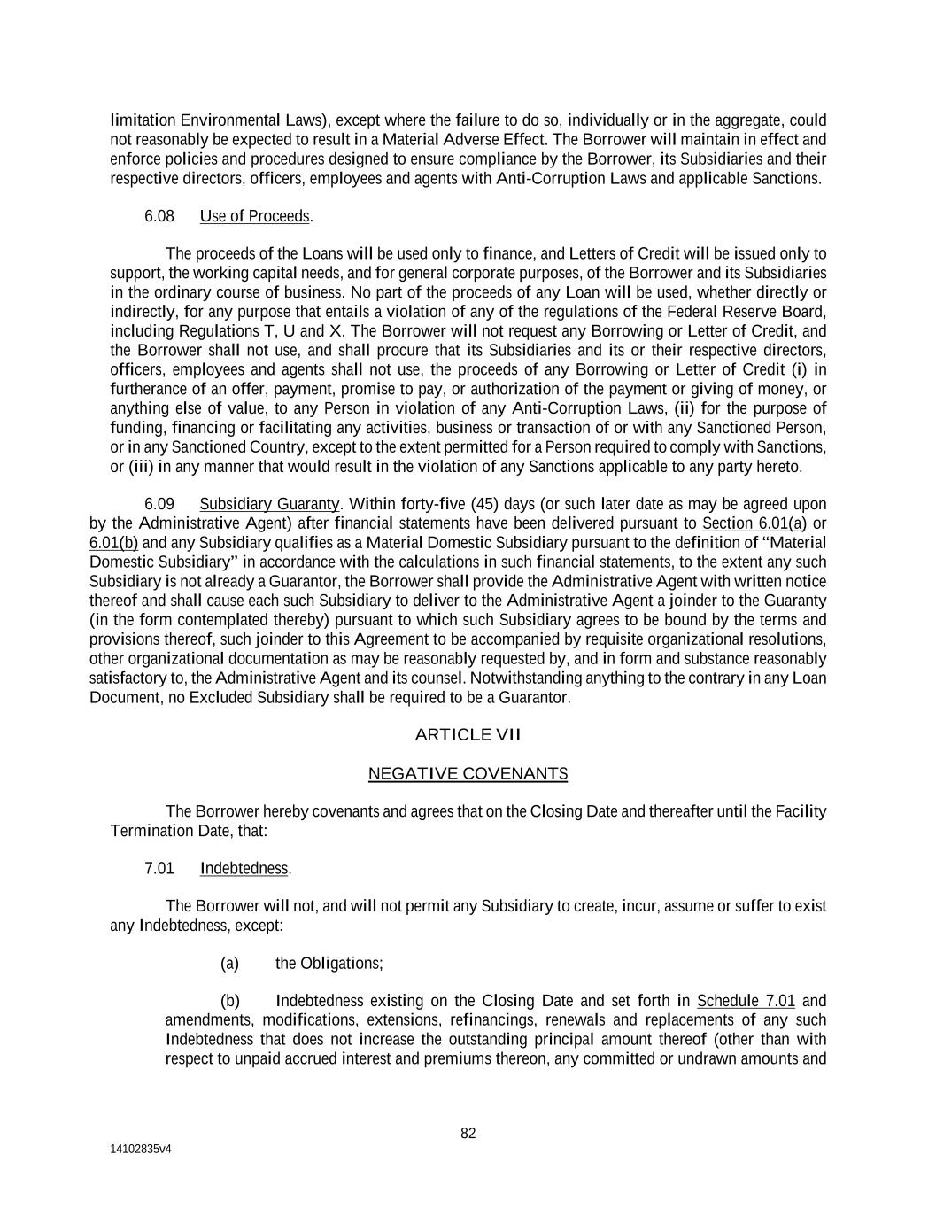 82 14102835v4 limitation Environmental Laws), except where the failure to do so, individually or in the aggregate, could not reasonably be expected to result in a Material Adverse Effect. The Borrower will maintain in effect and enforce policies and procedures designed to ensure compliance by the Borrower, its Subsidiaries and their respective directors, officers, employees and agents with Anti-Corruption Laws and applicable Sanctions. 6.08 Use of Proceeds. The proceeds of the Loans will be used only to finance, and Letters of Credit will be issued only to support, the working capital needs, and for general corporate purposes, of the Borrower and its Subsidiaries in the ordinary course of business. No part of the proceeds of any Loan will be used, whether directly or indirectly, for any purpose that entails a violation of any of the regulations of the Federal Reserve Board, including Regulations T, U and X. The Borrower will not request any Borrowing or Letter of Credit, and the Borrower shall not use, and shall procure that its Subsidiaries and its or their respective directors, officers, employees and agents shall not use, the proceeds of any Borrowing or Letter of Credit (i) in furtherance of an offer, payment, promise to pay, or authorization of the payment or giving of money, or anything else of value, to any Person in violation of any Anti-Corruption Laws, (ii) for the purpose of funding, financing or facilitating any activities, business or transaction of or with any Sanctioned Person, or in any Sanctioned Country, except to the extent permitted for a Person required to comply with Sanctions, or (iii) in any manner that would result in the violation of any Sanctions applicable to any party hereto. 6.09 Subsidiary Guaranty. Within forty-five (45) days (or such later date as may be agreed upon by the Administrative Agent) after financial statements have been delivered pursuant to Section 6.01(a) or 6.01(b) and any Subsidiary qualifies as a Material Domestic Subsidiary pursuant to the definition of “Material Domestic Subsidiary” in accordance with the calculations in such financial statements, to the extent any such Subsidiary is not already a Guarantor, the Borrower shall provide the Administrative Agent with written notice thereof and shall cause each such Subsidiary to deliver to the Administrative Agent a joinder to the Guaranty (in the form contemplated thereby) pursuant to which such Subsidiary agrees to be bound by the terms and provisions thereof, such joinder to this Agreement to be accompanied by requisite organizational resolutions, other organizational documentation as may be reasonably requested by, and in form and substance reasonably satisfactory to, the Administrative Agent and its counsel. Notwithstanding anything to the contrary in any Loan Document, no Excluded Subsidiary shall be required to be a Guarantor. ARTICLE VII NEGATIVE COVENANTS The Borrower hereby covenants and agrees that on the Closing Date and thereafter until the Facility Termination Date, that: 7.01 Indebtedness. The Borrower will not, and will not permit any Subsidiary to create, incur, assume or suffer to exist any Indebtedness, except: (a) the Obligations; (b) Indebtedness existing on the Closing Date and set forth in Schedule 7.01 and amendments, modifications, extensions, refinancings, renewals and replacements of any such Indebtedness that does not increase the outstanding principal amount thereof (other than with respect to unpaid accrued interest and premiums thereon, any committed or undrawn amounts and