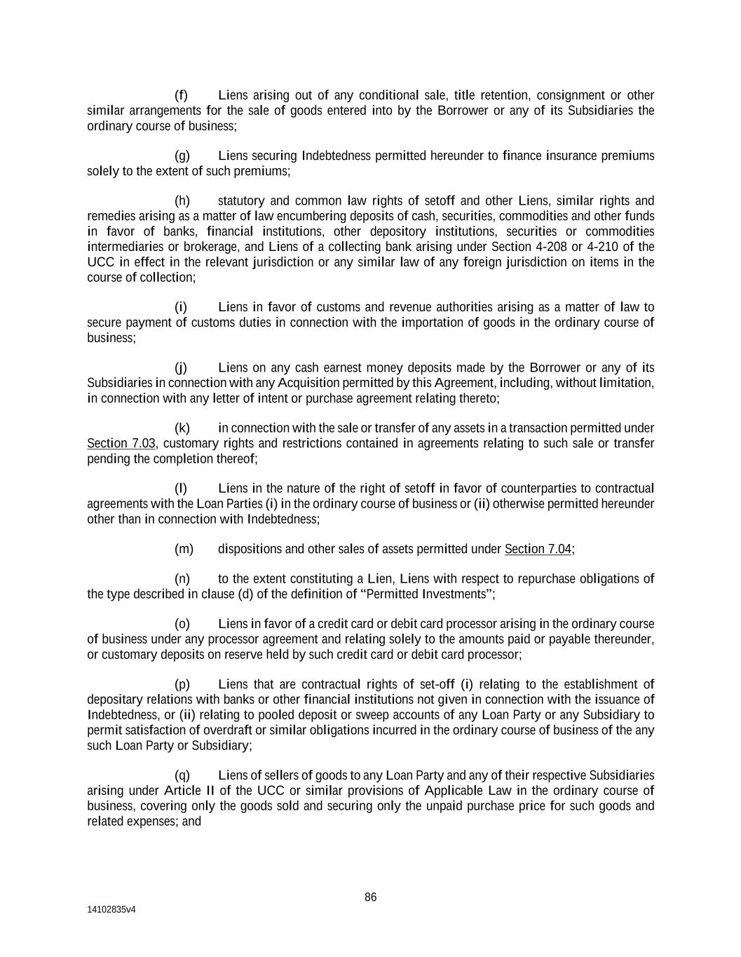 86 14102835v4 (f) Liens arising out of any conditional sale, title retention, consignment or other similar arrangements for the sale of goods entered into by the Borrower or any of its Subsidiaries the ordinary course of business; (g) Liens securing Indebtedness permitted hereunder to finance insurance premiums solely to the extent of such premiums; (h) statutory and common law rights of setoff and other Liens, similar rights and remedies arising as a matter of law encumbering deposits of cash, securities, commodities and other funds in favor of banks, financial institutions, other depository institutions, securities or commodities intermediaries or brokerage, and Liens of a collecting bank arising under Section 4-208 or 4-210 of the UCC in effect in the relevant jurisdiction or any similar law of any foreign jurisdiction on items in the course of collection; (i) Liens in favor of customs and revenue authorities arising as a matter of law to secure payment of customs duties in connection with the importation of goods in the ordinary course of business; (j) Liens on any cash earnest money deposits made by the Borrower or any of its Subsidiaries in connection with any Acquisition permitted by this Agreement, including, without limitation, in connection with any letter of intent or purchase agreement relating thereto; (k) in connection with the sale or transfer of any assets in a transaction permitted under Section 7.03, customary rights and restrictions contained in agreements relating to such sale or transfer pending the completion thereof; (l) Liens in the nature of the right of setoff in favor of counterparties to contractual agreements with the Loan Parties (i) in the ordinary course of business or (ii) otherwise permitted hereunder other than in connection with Indebtedness; (m) dispositions and other sales of assets permitted under Section 7.04; (n) to the extent constituting a Lien, Liens with respect to repurchase obligations of the type described in clause (d) of the definition of “Permitted Investments”; (o) Liens in favor of a credit card or debit card processor arising in the ordinary course of business under any processor agreement and relating solely to the amounts paid or payable thereunder, or customary deposits on reserve held by such credit card or debit card processor; (p) Liens that are contractual rights of set-off (i) relating to the establishment of depositary relations with banks or other financial institutions not given in connection with the issuance of Indebtedness, or (ii) relating to pooled deposit or sweep accounts of any Loan Party or any Subsidiary to permit satisfaction of overdraft or similar obligations incurred in the ordinary course of business of the any such Loan Party or Subsidiary; (q) Liens of sellers of goods to any Loan Party and any of their respective Subsidiaries arising under Article II of the UCC or similar provisions of Applicable Law in the ordinary course of business, covering only the goods sold and securing only the unpaid purchase price for such goods and related expenses; and