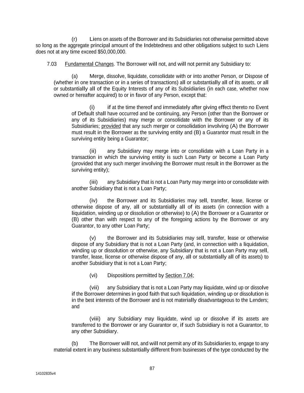 87 14102835v4 (r) Liens on assets of the Borrower and its Subsidiaries not otherwise permitted above so long as the aggregate principal amount of the Indebtedness and other obligations subject to such Liens does not at any time exceed $50,000,000. 7.03 Fundamental Changes. The Borrower will not, and will not permit any Subsidiary to: (a) Merge, dissolve, liquidate, consolidate with or into another Person, or Dispose of (whether in one transaction or in a series of transactions) all or substantially all of its assets, or all or substantially all of the Equity Interests of any of its Subsidiaries (in each case, whether now owned or hereafter acquired) to or in favor of any Person, except that: (i) if at the time thereof and immediately after giving effect thereto no Event of Default shall have occurred and be continuing, any Person (other than the Borrower or any of its Subsidiaries) may merge or consolidate with the Borrower or any of its Subsidiaries; provided that any such merger or consolidation involving (A) the Borrower must result in the Borrower as the surviving entity and (B) a Guarantor must result in the surviving entity being a Guarantor; (ii) any Subsidiary may merge into or consolidate with a Loan Party in a transaction in which the surviving entity is such Loan Party or become a Loan Party (provided that any such merger involving the Borrower must result in the Borrower as the surviving entity); (iii) any Subsidiary that is not a Loan Party may merge into or consolidate with another Subsidiary that is not a Loan Party; (iv) the Borrower and its Subsidiaries may sell, transfer, lease, license or otherwise dispose of any, all or substantially all of its assets (in connection with a liquidation, winding up or dissolution or otherwise) to (A) the Borrower or a Guarantor or (B) other than with respect to any of the foregoing actions by the Borrower or any Guarantor, to any other Loan Party; (v) the Borrower and its Subsidiaries may sell, transfer, lease or otherwise dispose of any Subsidiary that is not a Loan Party (and, in connection with a liquidation, winding up or dissolution or otherwise, any Subsidiary that is not a Loan Party may sell, transfer, lease, license or otherwise dispose of any, all or substantially all of its assets) to another Subsidiary that is not a Loan Party; (vi) Dispositions permitted by Section 7.04; (vii) any Subsidiary that is not a Loan Party may liquidate, wind up or dissolve if the Borrower determines in good faith that such liquidation, winding up or dissolution is in the best interests of the Borrower and is not materially disadvantageous to the Lenders; and (viii) any Subsidiary may liquidate, wind up or dissolve if its assets are transferred to the Borrower or any Guarantor or, if such Subsidiary is not a Guarantor, to any other Subsidiary. (b) The Borrower will not, and will not permit any of its Subsidiaries to, engage to any material extent in any business substantially different from businesses of the type conducted by the