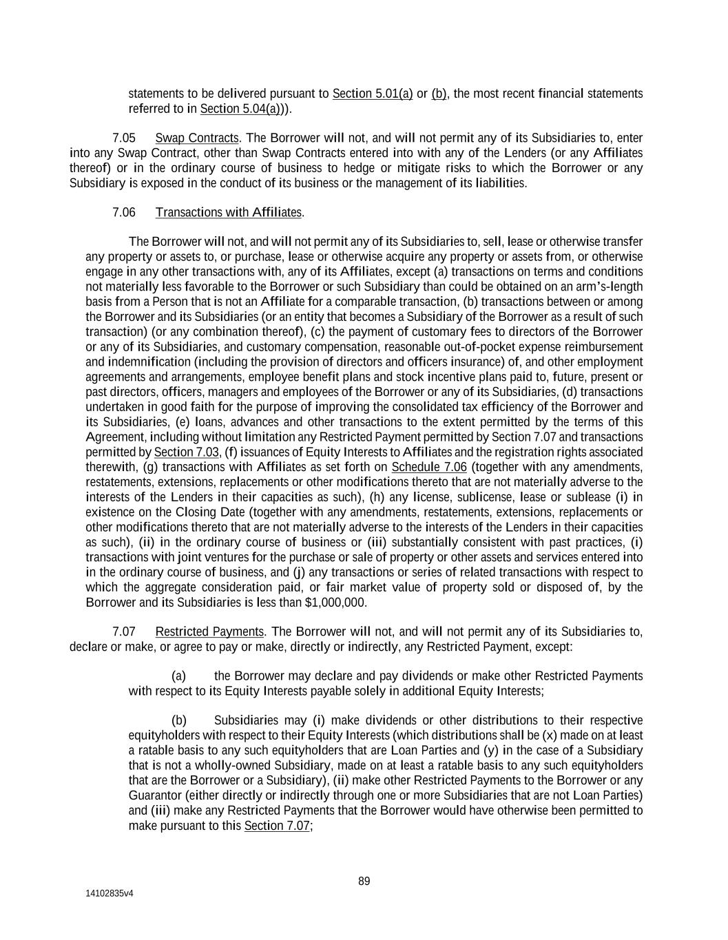 89 14102835v4 statements to be delivered pursuant to Section 5.01(a) or (b), the most recent financial statements referred to in Section 5.04(a))). 7.05 Swap Contracts. The Borrower will not, and will not permit any of its Subsidiaries to, enter into any Swap Contract, other than Swap Contracts entered into with any of the Lenders (or any Affiliates thereof) or in the ordinary course of business to hedge or mitigate risks to which the Borrower or any Subsidiary is exposed in the conduct of its business or the management of its liabilities. 7.06 Transactions with Affiliates. The Borrower will not, and will not permit any of its Subsidiaries to, sell, lease or otherwise transfer any property or assets to, or purchase, lease or otherwise acquire any property or assets from, or otherwise engage in any other transactions with, any of its Affiliates, except (a) transactions on terms and conditions not materially less favorable to the Borrower or such Subsidiary than could be obtained on an arm’s-length basis from a Person that is not an Affiliate for a comparable transaction, (b) transactions between or among the Borrower and its Subsidiaries (or an entity that becomes a Subsidiary of the Borrower as a result of such transaction) (or any combination thereof), (c) the payment of customary fees to directors of the Borrower or any of its Subsidiaries, and customary compensation, reasonable out-of-pocket expense reimbursement and indemnification (including the provision of directors and officers insurance) of, and other employment agreements and arrangements, employee benefit plans and stock incentive plans paid to, future, present or past directors, officers, managers and employees of the Borrower or any of its Subsidiaries, (d) transactions undertaken in good faith for the purpose of improving the consolidated tax efficiency of the Borrower and its Subsidiaries, (e) loans, advances and other transactions to the extent permitted by the terms of this Agreement, including without limitation any Restricted Payment permitted by Section 7.07 and transactions permitted by Section 7.03, (f) issuances of Equity Interests to Affiliates and the registration rights associated therewith, (g) transactions with Affiliates as set forth on Schedule 7.06 (together with any amendments, restatements, extensions, replacements or other modifications thereto that are not materially adverse to the interests of the Lenders in their capacities as such), (h) any license, sublicense, lease or sublease (i) in existence on the Closing Date (together with any amendments, restatements, extensions, replacements or other modifications thereto that are not materially adverse to the interests of the Lenders in their capacities as such), (ii) in the ordinary course of business or (iii) substantially consistent with past practices, (i) transactions with joint ventures for the purchase or sale of property or other assets and services entered into in the ordinary course of business, and (j) any transactions or series of related transactions with respect to which the aggregate consideration paid, or fair market value of property sold or disposed of, by the Borrower and its Subsidiaries is less than $1,000,000. 7.07 Restricted Payments. The Borrower will not, and will not permit any of its Subsidiaries to, declare or make, or agree to pay or make, directly or indirectly, any Restricted Payment, except: (a) the Borrower may declare and pay dividends or make other Restricted Payments with respect to its Equity Interests payable solely in additional Equity Interests; (b) Subsidiaries may (i) make dividends or other distributions to their respective equityholders with respect to their Equity Interests (which distributions shall be (x) made on at least a ratable basis to any such equityholders that are Loan Parties and (y) in the case of a Subsidiary that is not a wholly-owned Subsidiary, made on at least a ratable basis to any such equityholders that are the Borrower or a Subsidiary), (ii) make other Restricted Payments to the Borrower or any Guarantor (either directly or indirectly through one or more Subsidiaries that are not Loan Parties) and (iii) make any Restricted Payments that the Borrower would have otherwise been permitted to make pursuant to this Section 7.07;