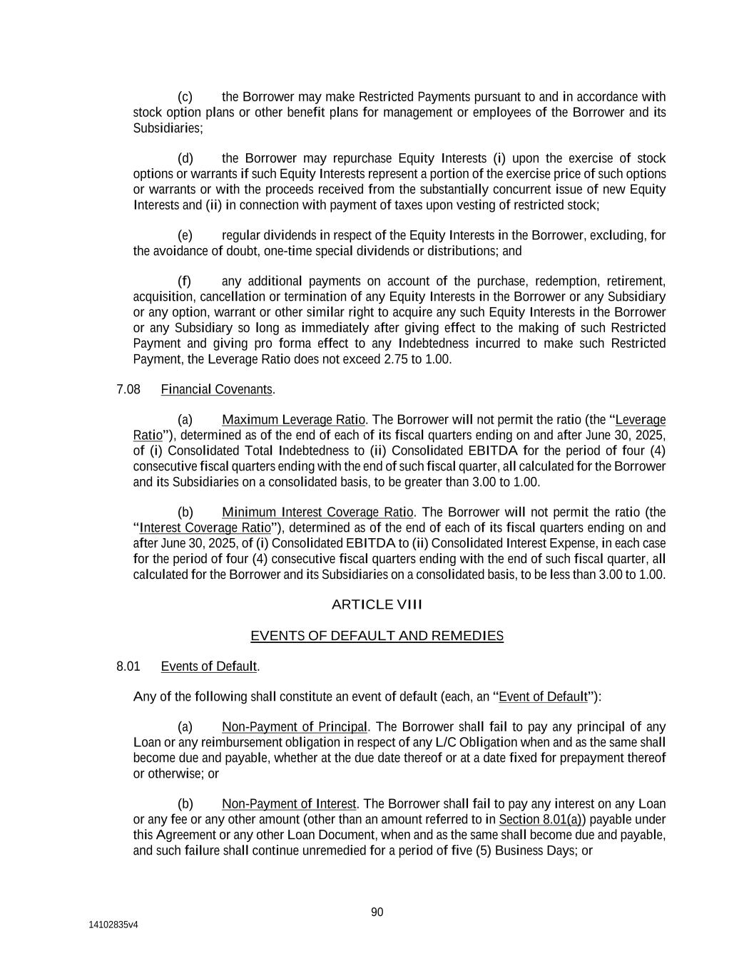 90 14102835v4 (c) the Borrower may make Restricted Payments pursuant to and in accordance with stock option plans or other benefit plans for management or employees of the Borrower and its Subsidiaries; (d) the Borrower may repurchase Equity Interests (i) upon the exercise of stock options or warrants if such Equity Interests represent a portion of the exercise price of such options or warrants or with the proceeds received from the substantially concurrent issue of new Equity Interests and (ii) in connection with payment of taxes upon vesting of restricted stock; (e) regular dividends in respect of the Equity Interests in the Borrower, excluding, for the avoidance of doubt, one-time special dividends or distributions; and (f) any additional payments on account of the purchase, redemption, retirement, acquisition, cancellation or termination of any Equity Interests in the Borrower or any Subsidiary or any option, warrant or other similar right to acquire any such Equity Interests in the Borrower or any Subsidiary so long as immediately after giving effect to the making of such Restricted Payment and giving pro forma effect to any Indebtedness incurred to make such Restricted Payment, the Leverage Ratio does not exceed 2.75 to 1.00. 7.08 Financial Covenants. (a) Maximum Leverage Ratio. The Borrower will not permit the ratio (the “Leverage Ratio”), determined as of the end of each of its fiscal quarters ending on and after June 30, 2025, of (i) Consolidated Total Indebtedness to (ii) Consolidated EBITDA for the period of four (4) consecutive fiscal quarters ending with the end of such fiscal quarter, all calculated for the Borrower and its Subsidiaries on a consolidated basis, to be greater than 3.00 to 1.00. (b) Minimum Interest Coverage Ratio. The Borrower will not permit the ratio (the “Interest Coverage Ratio”), determined as of the end of each of its fiscal quarters ending on and after June 30, 2025, of (i) Consolidated EBITDA to (ii) Consolidated Interest Expense, in each case for the period of four (4) consecutive fiscal quarters ending with the end of such fiscal quarter, all calculated for the Borrower and its Subsidiaries on a consolidated basis, to be less than 3.00 to 1.00. ARTICLE VIII EVENTS OF DEFAULT AND REMEDIES 8.01 Events of Default. Any of the following shall constitute an event of default (each, an “Event of Default”): (a) Non-Payment of Principal. The Borrower shall fail to pay any principal of any Loan or any reimbursement obligation in respect of any L/C Obligation when and as the same shall become due and payable, whether at the due date thereof or at a date fixed for prepayment thereof or otherwise; or (b) Non-Payment of Interest. The Borrower shall fail to pay any interest on any Loan or any fee or any other amount (other than an amount referred to in Section 8.01(a)) payable under this Agreement or any other Loan Document, when and as the same shall become due and payable, and such failure shall continue unremedied for a period of five (5) Business Days; or