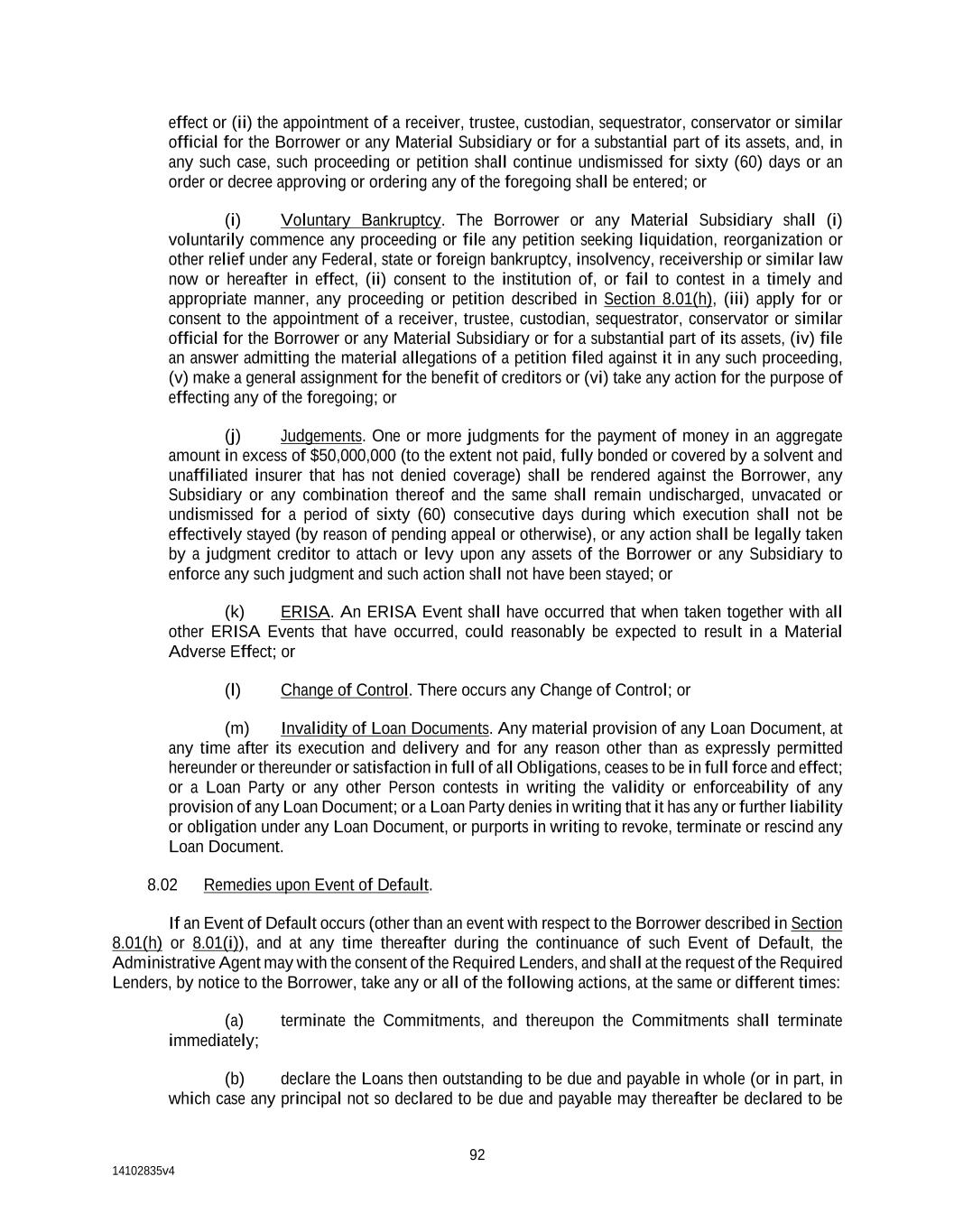 92 14102835v4 effect or (ii) the appointment of a receiver, trustee, custodian, sequestrator, conservator or similar official for the Borrower or any Material Subsidiary or for a substantial part of its assets, and, in any such case, such proceeding or petition shall continue undismissed for sixty (60) days or an order or decree approving or ordering any of the foregoing shall be entered; or (i) Voluntary Bankruptcy. The Borrower or any Material Subsidiary shall (i) voluntarily commence any proceeding or file any petition seeking liquidation, reorganization or other relief under any Federal, state or foreign bankruptcy, insolvency, receivership or similar law now or hereafter in effect, (ii) consent to the institution of, or fail to contest in a timely and appropriate manner, any proceeding or petition described in Section 8.01(h), (iii) apply for or consent to the appointment of a receiver, trustee, custodian, sequestrator, conservator or similar official for the Borrower or any Material Subsidiary or for a substantial part of its assets, (iv) file an answer admitting the material allegations of a petition filed against it in any such proceeding, (v) make a general assignment for the benefit of creditors or (vi) take any action for the purpose of effecting any of the foregoing; or (j) Judgements. One or more judgments for the payment of money in an aggregate amount in excess of $50,000,000 (to the extent not paid, fully bonded or covered by a solvent and unaffiliated insurer that has not denied coverage) shall be rendered against the Borrower, any Subsidiary or any combination thereof and the same shall remain undischarged, unvacated or undismissed for a period of sixty (60) consecutive days during which execution shall not be effectively stayed (by reason of pending appeal or otherwise), or any action shall be legally taken by a judgment creditor to attach or levy upon any assets of the Borrower or any Subsidiary to enforce any such judgment and such action shall not have been stayed; or (k) ERISA. An ERISA Event shall have occurred that when taken together with all other ERISA Events that have occurred, could reasonably be expected to result in a Material Adverse Effect; or (l) Change of Control. There occurs any Change of Control; or (m) Invalidity of Loan Documents. Any material provision of any Loan Document, at any time after its execution and delivery and for any reason other than as expressly permitted hereunder or thereunder or satisfaction in full of all Obligations, ceases to be in full force and effect; or a Loan Party or any other Person contests in writing the validity or enforceability of any provision of any Loan Document; or a Loan Party denies in writing that it has any or further liability or obligation under any Loan Document, or purports in writing to revoke, terminate or rescind any Loan Document. 8.02 Remedies upon Event of Default. If an Event of Default occurs (other than an event with respect to the Borrower described in Section 8.01(h) or 8.01(i)), and at any time thereafter during the continuance of such Event of Default, the Administrative Agent may with the consent of the Required Lenders, and shall at the request of the Required Lenders, by notice to the Borrower, take any or all of the following actions, at the same or different times: (a) terminate the Commitments, and thereupon the Commitments shall terminate immediately; (b) declare the Loans then outstanding to be due and payable in whole (or in part, in which case any principal not so declared to be due and payable may thereafter be declared to be