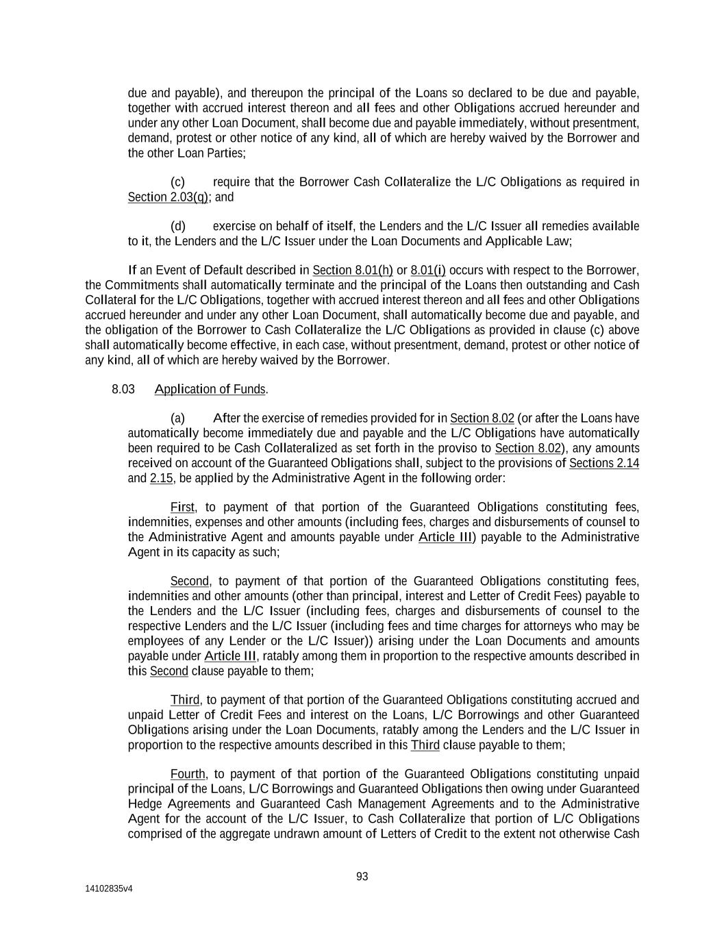 93 14102835v4 due and payable), and thereupon the principal of the Loans so declared to be due and payable, together with accrued interest thereon and all fees and other Obligations accrued hereunder and under any other Loan Document, shall become due and payable immediately, without presentment, demand, protest or other notice of any kind, all of which are hereby waived by the Borrower and the other Loan Parties; (c) require that the Borrower Cash Collateralize the L/C Obligations as required in Section 2.03(q); and (d) exercise on behalf of itself, the Lenders and the L/C Issuer all remedies available to it, the Lenders and the L/C Issuer under the Loan Documents and Applicable Law; If an Event of Default described in Section 8.01(h) or 8.01(i) occurs with respect to the Borrower, the Commitments shall automatically terminate and the principal of the Loans then outstanding and Cash Collateral for the L/C Obligations, together with accrued interest thereon and all fees and other Obligations accrued hereunder and under any other Loan Document, shall automatically become due and payable, and the obligation of the Borrower to Cash Collateralize the L/C Obligations as provided in clause (c) above shall automatically become effective, in each case, without presentment, demand, protest or other notice of any kind, all of which are hereby waived by the Borrower. 8.03 Application of Funds. (a) After the exercise of remedies provided for in Section 8.02 (or after the Loans have automatically become immediately due and payable and the L/C Obligations have automatically been required to be Cash Collateralized as set forth in the proviso to Section 8.02), any amounts received on account of the Guaranteed Obligations shall, subject to the provisions of Sections 2.14 and 2.15, be applied by the Administrative Agent in the following order: First, to payment of that portion of the Guaranteed Obligations constituting fees, indemnities, expenses and other amounts (including fees, charges and disbursements of counsel to the Administrative Agent and amounts payable under Article III) payable to the Administrative Agent in its capacity as such; Second, to payment of that portion of the Guaranteed Obligations constituting fees, indemnities and other amounts (other than principal, interest and Letter of Credit Fees) payable to the Lenders and the L/C Issuer (including fees, charges and disbursements of counsel to the respective Lenders and the L/C Issuer (including fees and time charges for attorneys who may be employees of any Lender or the L/C Issuer)) arising under the Loan Documents and amounts payable under Article III, ratably among them in proportion to the respective amounts described in this Second clause payable to them; Third, to payment of that portion of the Guaranteed Obligations constituting accrued and unpaid Letter of Credit Fees and interest on the Loans, L/C Borrowings and other Guaranteed Obligations arising under the Loan Documents, ratably among the Lenders and the L/C Issuer in proportion to the respective amounts described in this Third clause payable to them; Fourth, to payment of that portion of the Guaranteed Obligations constituting unpaid principal of the Loans, L/C Borrowings and Guaranteed Obligations then owing under Guaranteed Hedge Agreements and Guaranteed Cash Management Agreements and to the Administrative Agent for the account of the L/C Issuer, to Cash Collateralize that portion of L/C Obligations comprised of the aggregate undrawn amount of Letters of Credit to the extent not otherwise Cash