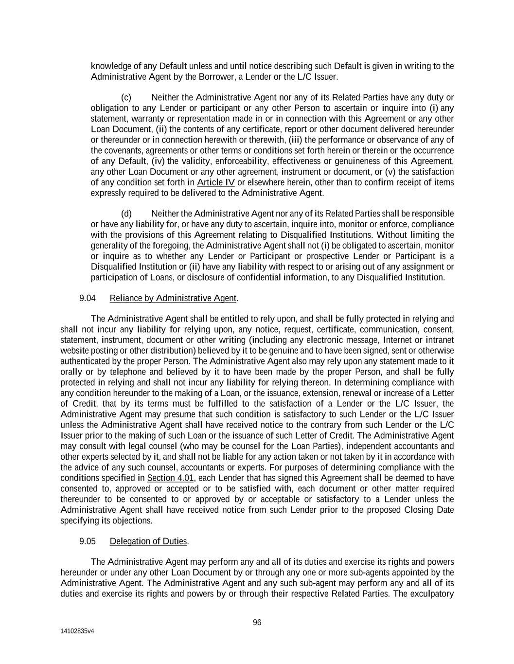 96 14102835v4 knowledge of any Default unless and until notice describing such Default is given in writing to the Administrative Agent by the Borrower, a Lender or the L/C Issuer. (c) Neither the Administrative Agent nor any of its Related Parties have any duty or obligation to any Lender or participant or any other Person to ascertain or inquire into (i) any statement, warranty or representation made in or in connection with this Agreement or any other Loan Document, (ii) the contents of any certificate, report or other document delivered hereunder or thereunder or in connection herewith or therewith, (iii) the performance or observance of any of the covenants, agreements or other terms or conditions set forth herein or therein or the occurrence of any Default, (iv) the validity, enforceability, effectiveness or genuineness of this Agreement, any other Loan Document or any other agreement, instrument or document, or (v) the satisfaction of any condition set forth in Article IV or elsewhere herein, other than to confirm receipt of items expressly required to be delivered to the Administrative Agent. (d) Neither the Administrative Agent nor any of its Related Parties shall be responsible or have any liability for, or have any duty to ascertain, inquire into, monitor or enforce, compliance with the provisions of this Agreement relating to Disqualified Institutions. Without limiting the generality of the foregoing, the Administrative Agent shall not (i) be obligated to ascertain, monitor or inquire as to whether any Lender or Participant or prospective Lender or Participant is a Disqualified Institution or (ii) have any liability with respect to or arising out of any assignment or participation of Loans, or disclosure of confidential information, to any Disqualified Institution. 9.04 Reliance by Administrative Agent. The Administrative Agent shall be entitled to rely upon, and shall be fully protected in relying and shall not incur any liability for relying upon, any notice, request, certificate, communication, consent, statement, instrument, document or other writing (including any electronic message, Internet or intranet website posting or other distribution) believed by it to be genuine and to have been signed, sent or otherwise authenticated by the proper Person. The Administrative Agent also may rely upon any statement made to it orally or by telephone and believed by it to have been made by the proper Person, and shall be fully protected in relying and shall not incur any liability for relying thereon. In determining compliance with any condition hereunder to the making of a Loan, or the issuance, extension, renewal or increase of a Letter of Credit, that by its terms must be fulfilled to the satisfaction of a Lender or the L/C Issuer, the Administrative Agent may presume that such condition is satisfactory to such Lender or the L/C Issuer unless the Administrative Agent shall have received notice to the contrary from such Lender or the L/C Issuer prior to the making of such Loan or the issuance of such Letter of Credit. The Administrative Agent may consult with legal counsel (who may be counsel for the Loan Parties), independent accountants and other experts selected by it, and shall not be liable for any action taken or not taken by it in accordance with the advice of any such counsel, accountants or experts. For purposes of determining compliance with the conditions specified in Section 4.01, each Lender that has signed this Agreement shall be deemed to have consented to, approved or accepted or to be satisfied with, each document or other matter required thereunder to be consented to or approved by or acceptable or satisfactory to a Lender unless the Administrative Agent shall have received notice from such Lender prior to the proposed Closing Date specifying its objections. 9.05 Delegation of Duties. The Administrative Agent may perform any and all of its duties and exercise its rights and powers hereunder or under any other Loan Document by or through any one or more sub-agents appointed by the Administrative Agent. The Administrative Agent and any such sub-agent may perform any and all of its duties and exercise its rights and powers by or through their respective Related Parties. The exculpatory