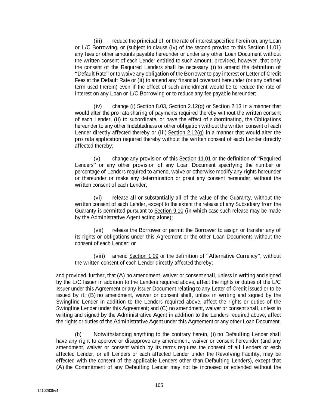 105 14102835v4 (iii) reduce the principal of, or the rate of interest specified herein on, any Loan or L/C Borrowing, or (subject to clause (iv) of the second proviso to this Section 11.01) any fees or other amounts payable hereunder or under any other Loan Document without the written consent of each Lender entitled to such amount; provided, however, that only the consent of the Required Lenders shall be necessary (i) to amend the definition of “Default Rate” or to waive any obligation of the Borrower to pay interest or Letter of Credit Fees at the Default Rate or (ii) to amend any financial covenant hereunder (or any defined term used therein) even if the effect of such amendment would be to reduce the rate of interest on any Loan or L/C Borrowing or to reduce any fee payable hereunder; (iv) change (i) Section 8.03, Section 2.12(g) or Section 2.13 in a manner that would alter the pro rata sharing of payments required thereby without the written consent of each Lender, (ii) to subordinate, or have the effect of subordinating, the Obligations hereunder to any other Indebtedness or other obligation without the written consent of each Lender directly affected thereby or (iii) Section 2.12(g) in a manner that would alter the pro rata application required thereby without the written consent of each Lender directly affected thereby; (v) change any provision of this Section 11.01 or the definition of “Required Lenders” or any other provision of any Loan Document specifying the number or percentage of Lenders required to amend, waive or otherwise modify any rights hereunder or thereunder or make any determination or grant any consent hereunder, without the written consent of each Lender; (vi) release all or substantially all of the value of the Guaranty, without the written consent of each Lender, except to the extent the release of any Subsidiary from the Guaranty is permitted pursuant to Section 9.10 (in which case such release may be made by the Administrative Agent acting alone); (vii) release the Borrower or permit the Borrower to assign or transfer any of its rights or obligations under this Agreement or the other Loan Documents without the consent of each Lender; or (viii) amend Section 1.09 or the definition of “Alternative Currency”, without the written consent of each Lender directly affected thereby; and provided, further, that (A) no amendment, waiver or consent shall, unless in writing and signed by the L/C Issuer in addition to the Lenders required above, affect the rights or duties of the L/C Issuer under this Agreement or any Issuer Document relating to any Letter of Credit issued or to be issued by it; (B) no amendment, waiver or consent shall, unless in writing and signed by the Swingline Lender in addition to the Lenders required above, affect the rights or duties of the Swingline Lender under this Agreement; and (C) no amendment, waiver or consent shall, unless in writing and signed by the Administrative Agent in addition to the Lenders required above, affect the rights or duties of the Administrative Agent under this Agreement or any other Loan Document. (b) Notwithstanding anything to the contrary herein, (i) no Defaulting Lender shall have any right to approve or disapprove any amendment, waiver or consent hereunder (and any amendment, waiver or consent which by its terms requires the consent of all Lenders or each affected Lender, or all Lenders or each affected Lender under the Revolving Facility, may be effected with the consent of the applicable Lenders other than Defaulting Lenders), except that (A) the Commitment of any Defaulting Lender may not be increased or extended without the