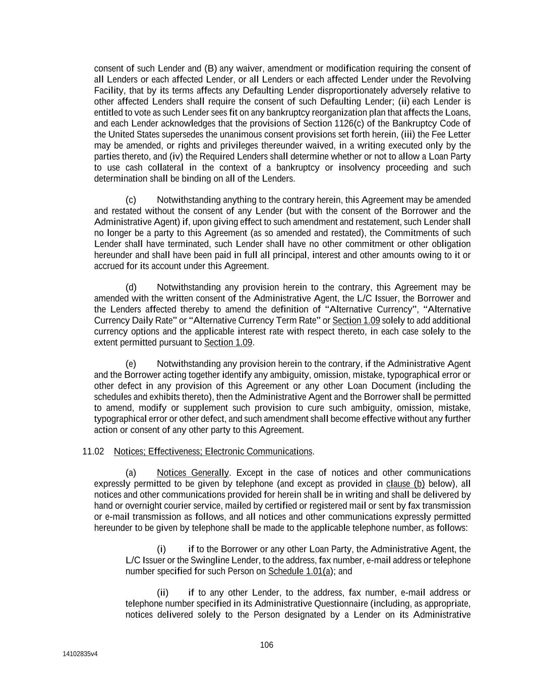 106 14102835v4 consent of such Lender and (B) any waiver, amendment or modification requiring the consent of all Lenders or each affected Lender, or all Lenders or each affected Lender under the Revolving Facility, that by its terms affects any Defaulting Lender disproportionately adversely relative to other affected Lenders shall require the consent of such Defaulting Lender; (ii) each Lender is entitled to vote as such Lender sees fit on any bankruptcy reorganization plan that affects the Loans, and each Lender acknowledges that the provisions of Section 1126(c) of the Bankruptcy Code of the United States supersedes the unanimous consent provisions set forth herein, (iii) the Fee Letter may be amended, or rights and privileges thereunder waived, in a writing executed only by the parties thereto, and (iv) the Required Lenders shall determine whether or not to allow a Loan Party to use cash collateral in the context of a bankruptcy or insolvency proceeding and such determination shall be binding on all of the Lenders. (c) Notwithstanding anything to the contrary herein, this Agreement may be amended and restated without the consent of any Lender (but with the consent of the Borrower and the Administrative Agent) if, upon giving effect to such amendment and restatement, such Lender shall no longer be a party to this Agreement (as so amended and restated), the Commitments of such Lender shall have terminated, such Lender shall have no other commitment or other obligation hereunder and shall have been paid in full all principal, interest and other amounts owing to it or accrued for its account under this Agreement. (d) Notwithstanding any provision herein to the contrary, this Agreement may be amended with the written consent of the Administrative Agent, the L/C Issuer, the Borrower and the Lenders affected thereby to amend the definition of “Alternative Currency”, “Alternative Currency Daily Rate” or “Alternative Currency Term Rate” or Section 1.09 solely to add additional currency options and the applicable interest rate with respect thereto, in each case solely to the extent permitted pursuant to Section 1.09. (e) Notwithstanding any provision herein to the contrary, if the Administrative Agent and the Borrower acting together identify any ambiguity, omission, mistake, typographical error or other defect in any provision of this Agreement or any other Loan Document (including the schedules and exhibits thereto), then the Administrative Agent and the Borrower shall be permitted to amend, modify or supplement such provision to cure such ambiguity, omission, mistake, typographical error or other defect, and such amendment shall become effective without any further action or consent of any other party to this Agreement. 11.02 Notices; Effectiveness; Electronic Communications. (a) Notices Generally. Except in the case of notices and other communications expressly permitted to be given by telephone (and except as provided in clause (b) below), all notices and other communications provided for herein shall be in writing and shall be delivered by hand or overnight courier service, mailed by certified or registered mail or sent by fax transmission or e-mail transmission as follows, and all notices and other communications expressly permitted hereunder to be given by telephone shall be made to the applicable telephone number, as follows: (i) if to the Borrower or any other Loan Party, the Administrative Agent, the L/C Issuer or the Swingline Lender, to the address, fax number, e-mail address or telephone number specified for such Person on Schedule 1.01(a); and (ii) if to any other Lender, to the address, fax number, e-mail address or telephone number specified in its Administrative Questionnaire (including, as appropriate, notices delivered solely to the Person designated by a Lender on its Administrative