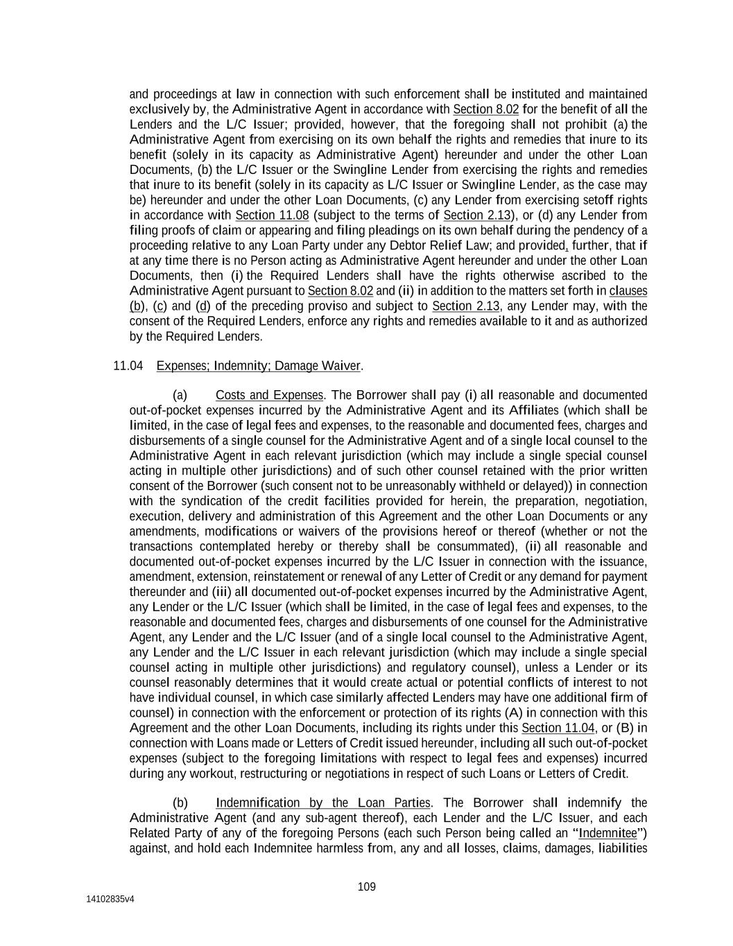 109 14102835v4 and proceedings at law in connection with such enforcement shall be instituted and maintained exclusively by, the Administrative Agent in accordance with Section 8.02 for the benefit of all the Lenders and the L/C Issuer; provided, however, that the foregoing shall not prohibit (a) the Administrative Agent from exercising on its own behalf the rights and remedies that inure to its benefit (solely in its capacity as Administrative Agent) hereunder and under the other Loan Documents, (b) the L/C Issuer or the Swingline Lender from exercising the rights and remedies that inure to its benefit (solely in its capacity as L/C Issuer or Swingline Lender, as the case may be) hereunder and under the other Loan Documents, (c) any Lender from exercising setoff rights in accordance with Section 11.08 (subject to the terms of Section 2.13), or (d) any Lender from filing proofs of claim or appearing and filing pleadings on its own behalf during the pendency of a proceeding relative to any Loan Party under any Debtor Relief Law; and provided, further, that if at any time there is no Person acting as Administrative Agent hereunder and under the other Loan Documents, then (i) the Required Lenders shall have the rights otherwise ascribed to the Administrative Agent pursuant to Section 8.02 and (ii) in addition to the matters set forth in clauses (b), (c) and (d) of the preceding proviso and subject to Section 2.13, any Lender may, with the consent of the Required Lenders, enforce any rights and remedies available to it and as authorized by the Required Lenders. 11.04 Expenses; Indemnity; Damage Waiver. (a) Costs and Expenses. The Borrower shall pay (i) all reasonable and documented out-of-pocket expenses incurred by the Administrative Agent and its Affiliates (which shall be limited, in the case of legal fees and expenses, to the reasonable and documented fees, charges and disbursements of a single counsel for the Administrative Agent and of a single local counsel to the Administrative Agent in each relevant jurisdiction (which may include a single special counsel acting in multiple other jurisdictions) and of such other counsel retained with the prior written consent of the Borrower (such consent not to be unreasonably withheld or delayed)) in connection with the syndication of the credit facilities provided for herein, the preparation, negotiation, execution, delivery and administration of this Agreement and the other Loan Documents or any amendments, modifications or waivers of the provisions hereof or thereof (whether or not the transactions contemplated hereby or thereby shall be consummated), (ii) all reasonable and documented out-of-pocket expenses incurred by the L/C Issuer in connection with the issuance, amendment, extension, reinstatement or renewal of any Letter of Credit or any demand for payment thereunder and (iii) all documented out-of-pocket expenses incurred by the Administrative Agent, any Lender or the L/C Issuer (which shall be limited, in the case of legal fees and expenses, to the reasonable and documented fees, charges and disbursements of one counsel for the Administrative Agent, any Lender and the L/C Issuer (and of a single local counsel to the Administrative Agent, any Lender and the L/C Issuer in each relevant jurisdiction (which may include a single special counsel acting in multiple other jurisdictions) and regulatory counsel), unless a Lender or its counsel reasonably determines that it would create actual or potential conflicts of interest to not have individual counsel, in which case similarly affected Lenders may have one additional firm of counsel) in connection with the enforcement or protection of its rights (A) in connection with this Agreement and the other Loan Documents, including its rights under this Section 11.04, or (B) in connection with Loans made or Letters of Credit issued hereunder, including all such out-of-pocket expenses (subject to the foregoing limitations with respect to legal fees and expenses) incurred during any workout, restructuring or negotiations in respect of such Loans or Letters of Credit. (b) Indemnification by the Loan Parties. The Borrower shall indemnify the Administrative Agent (and any sub-agent thereof), each Lender and the L/C Issuer, and each Related Party of any of the foregoing Persons (each such Person being called an “Indemnitee”) against, and hold each Indemnitee harmless from, any and all losses, claims, damages, liabilities