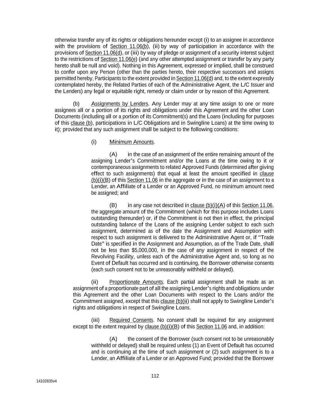 112 14102835v4 otherwise transfer any of its rights or obligations hereunder except (i) to an assignee in accordance with the provisions of Section 11.06(b), (ii) by way of participation in accordance with the provisions of Section 11.06(d), or (iii) by way of pledge or assignment of a security interest subject to the restrictions of Section 11.06(e) (and any other attempted assignment or transfer by any party hereto shall be null and void). Nothing in this Agreement, expressed or implied, shall be construed to confer upon any Person (other than the parties hereto, their respective successors and assigns permitted hereby, Participants to the extent provided in Section 11.06(d) and, to the extent expressly contemplated hereby, the Related Parties of each of the Administrative Agent, the L/C Issuer and the Lenders) any legal or equitable right, remedy or claim under or by reason of this Agreement. (b) Assignments by Lenders. Any Lender may at any time assign to one or more assignees all or a portion of its rights and obligations under this Agreement and the other Loan Documents (including all or a portion of its Commitment(s) and the Loans (including for purposes of this clause (b), participations in L/C Obligations and in Swingline Loans) at the time owing to it); provided that any such assignment shall be subject to the following conditions: (i) Minimum Amounts. (A) in the case of an assignment of the entire remaining amount of the assigning Lender’s Commitment and/or the Loans at the time owing to it or contemporaneous assignments to related Approved Funds (determined after giving effect to such assignments) that equal at least the amount specified in clause (b)(i)(B) of this Section 11.06 in the aggregate or in the case of an assignment to a Lender, an Affiliate of a Lender or an Approved Fund, no minimum amount need be assigned; and (B) in any case not described in clause (b)(i)(A) of this Section 11.06, the aggregate amount of the Commitment (which for this purpose includes Loans outstanding thereunder) or, if the Commitment is not then in effect, the principal outstanding balance of the Loans of the assigning Lender subject to each such assignment, determined as of the date the Assignment and Assumption with respect to such assignment is delivered to the Administrative Agent or, if “Trade Date” is specified in the Assignment and Assumption, as of the Trade Date, shall not be less than $5,000,000, in the case of any assignment in respect of the Revolving Facility, unless each of the Administrative Agent and, so long as no Event of Default has occurred and is continuing, the Borrower otherwise consents (each such consent not to be unreasonably withheld or delayed). (ii) Proportionate Amounts. Each partial assignment shall be made as an assignment of a proportionate part of all the assigning Lender’s rights and obligations under this Agreement and the other Loan Documents with respect to the Loans and/or the Commitment assigned, except that this clause (b)(ii) shall not apply to Swingline Lender’s rights and obligations in respect of Swingline Loans. (iii) Required Consents. No consent shall be required for any assignment except to the extent required by clause (b)(i)(B) of this Section 11.06 and, in addition: (A) the consent of the Borrower (such consent not to be unreasonably withheld or delayed) shall be required unless (1) an Event of Default has occurred and is continuing at the time of such assignment or (2) such assignment is to a Lender, an Affiliate of a Lender or an Approved Fund; provided that the Borrower